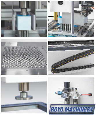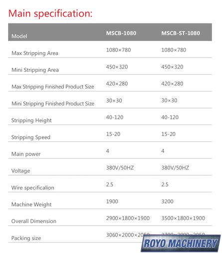 Peso: 1900 kg, Velocidad de Descartonado: 15-20 Golpes por minuto, Potencia: 4 kW, Tamaño Min. a Descartonar: 30x30mm, Área Min. de Descartonado: 450x320mm, Tamaño Max. a Descartonar: 420x280mm, Dimensiones: 2900 x 1800 x 1900 mm, Alto Max. a Descartonar: 40-120mm, Brazo mecánico y banda de salida (Opcional), Doble cabezal (Opcional)