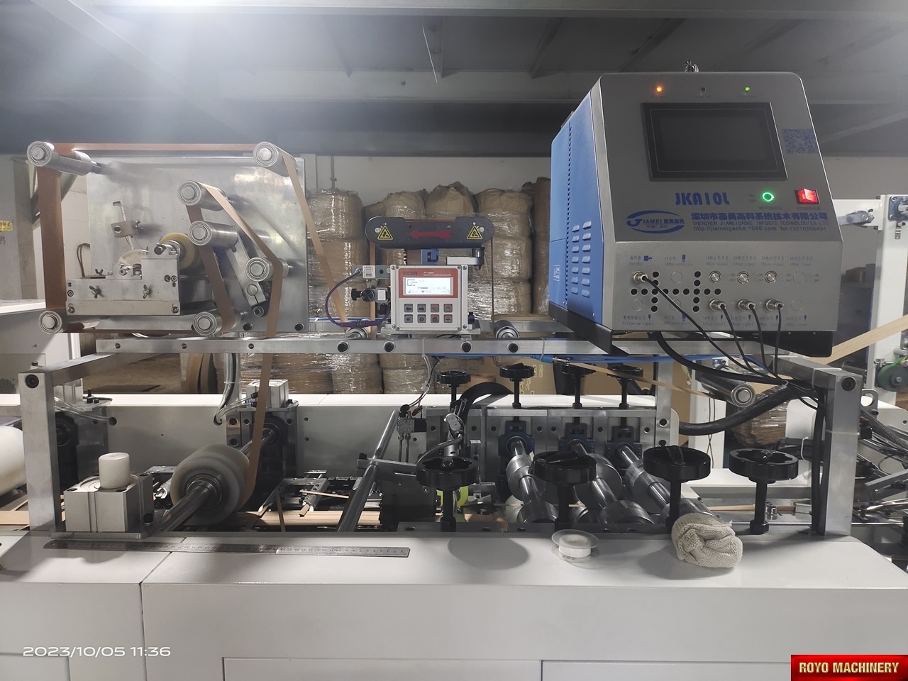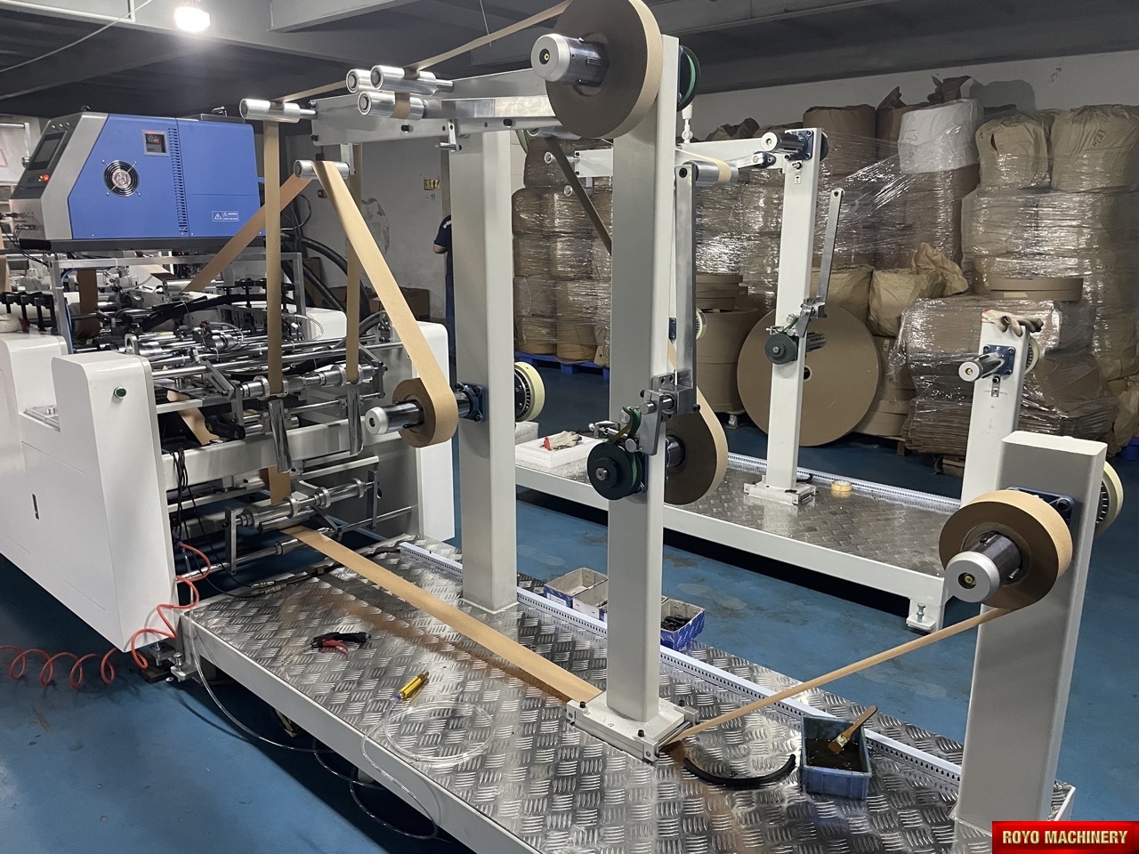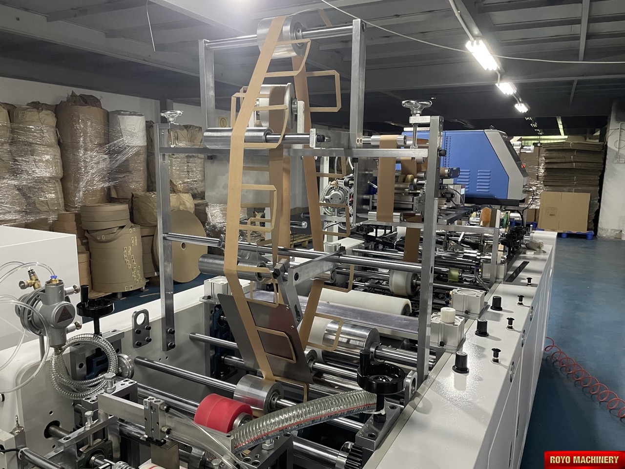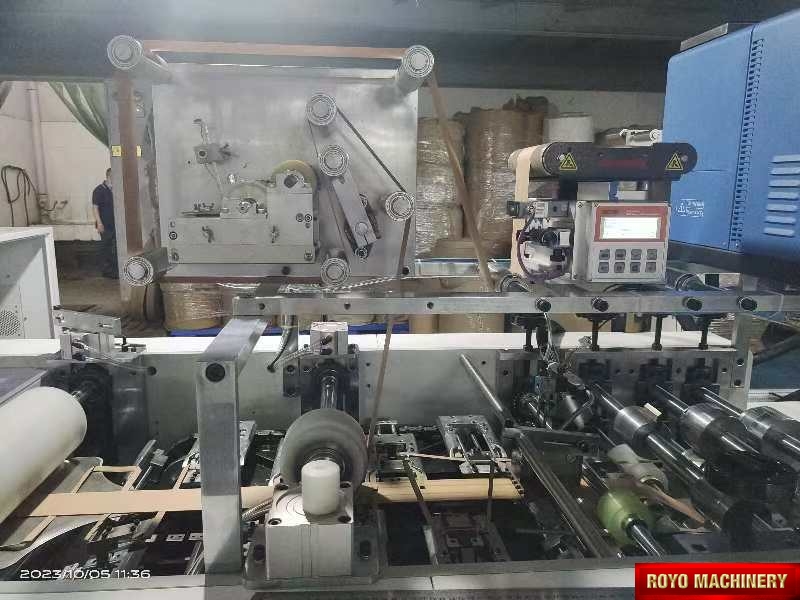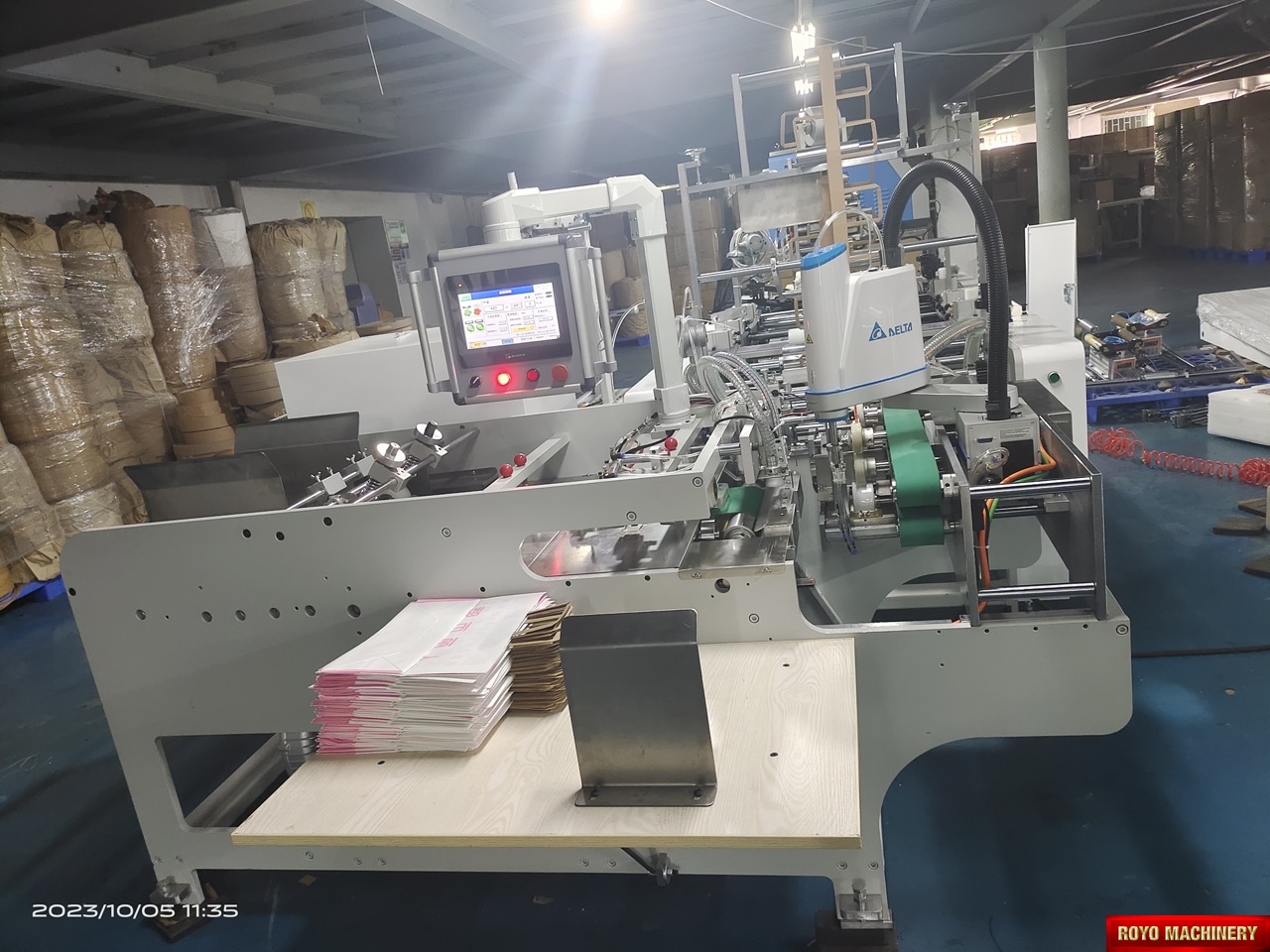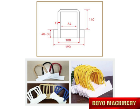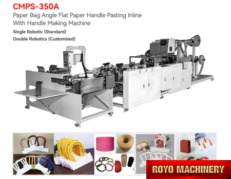 Salida a bandeja, Alimentador de la bolsa automatico superior, Peso: 2000kg, Potencia Requerida: 12.2kW, Altura de la bolsa: 220-450mm, Altura max. de la manija: 100mm (Afuera del refuerzo), Ancho minimo entre dobleces interiores: 190mm, Gramaje del papel: 90-130 gsm, Velocidad: 35-38 piezas/minuto, Manija insertada de forma automática por medio de brazo robótico, Pegado con goma caliente, Ancho interno de la manija: 84mm, Ancho de la manija plana: 12mm, Ancho de la bolsa: 220-450mm, Largo de la manija del papel plana: 352mm, Ancho del papel: 40mm, Separación interna de la manija (D): 84mm, Dimensiones: 7000 x 2450 x 1700mm, Armadora e insertadora de manijas de papel plana, Especificaciones sujetas a cambios sin previo aviso