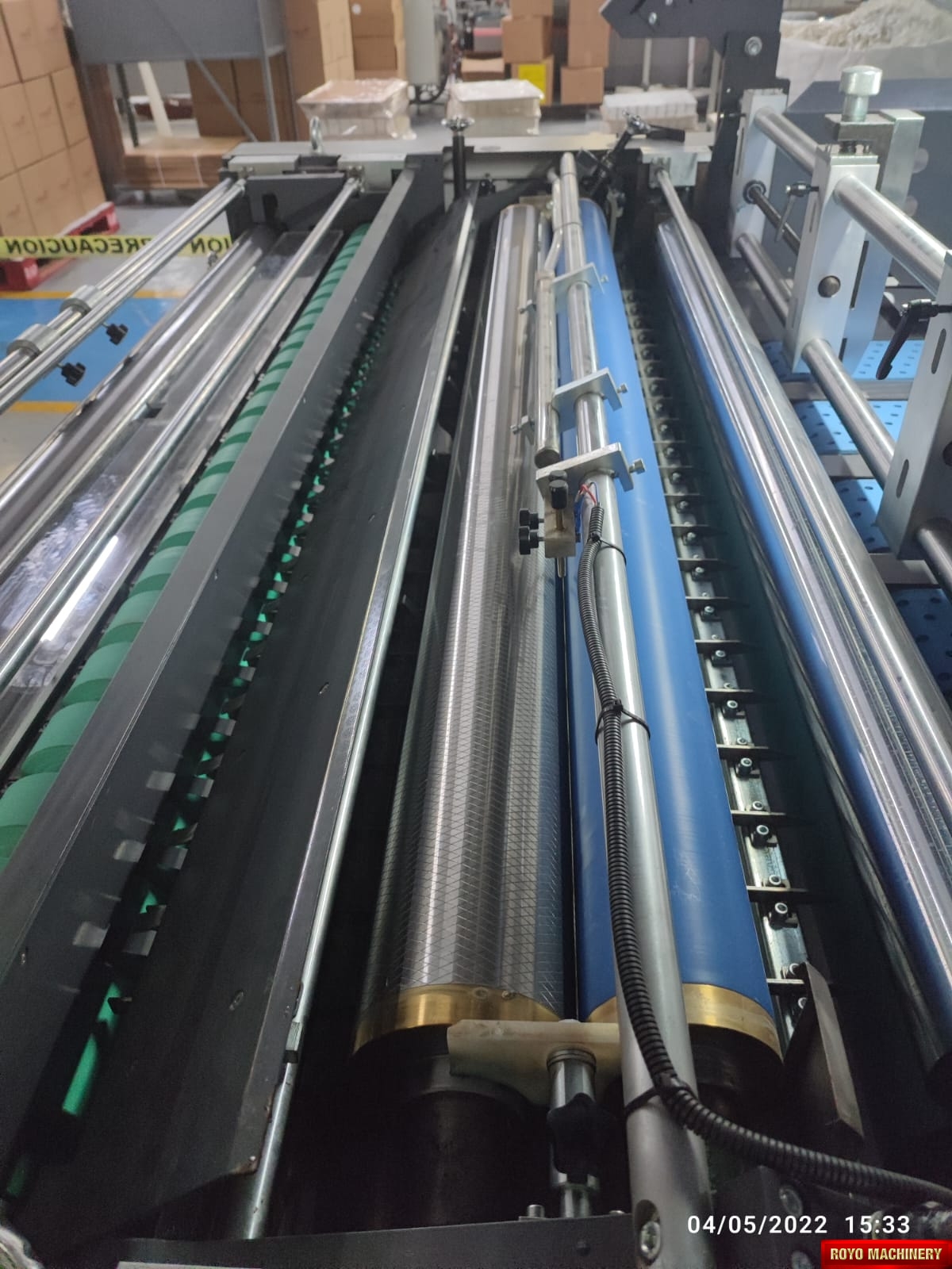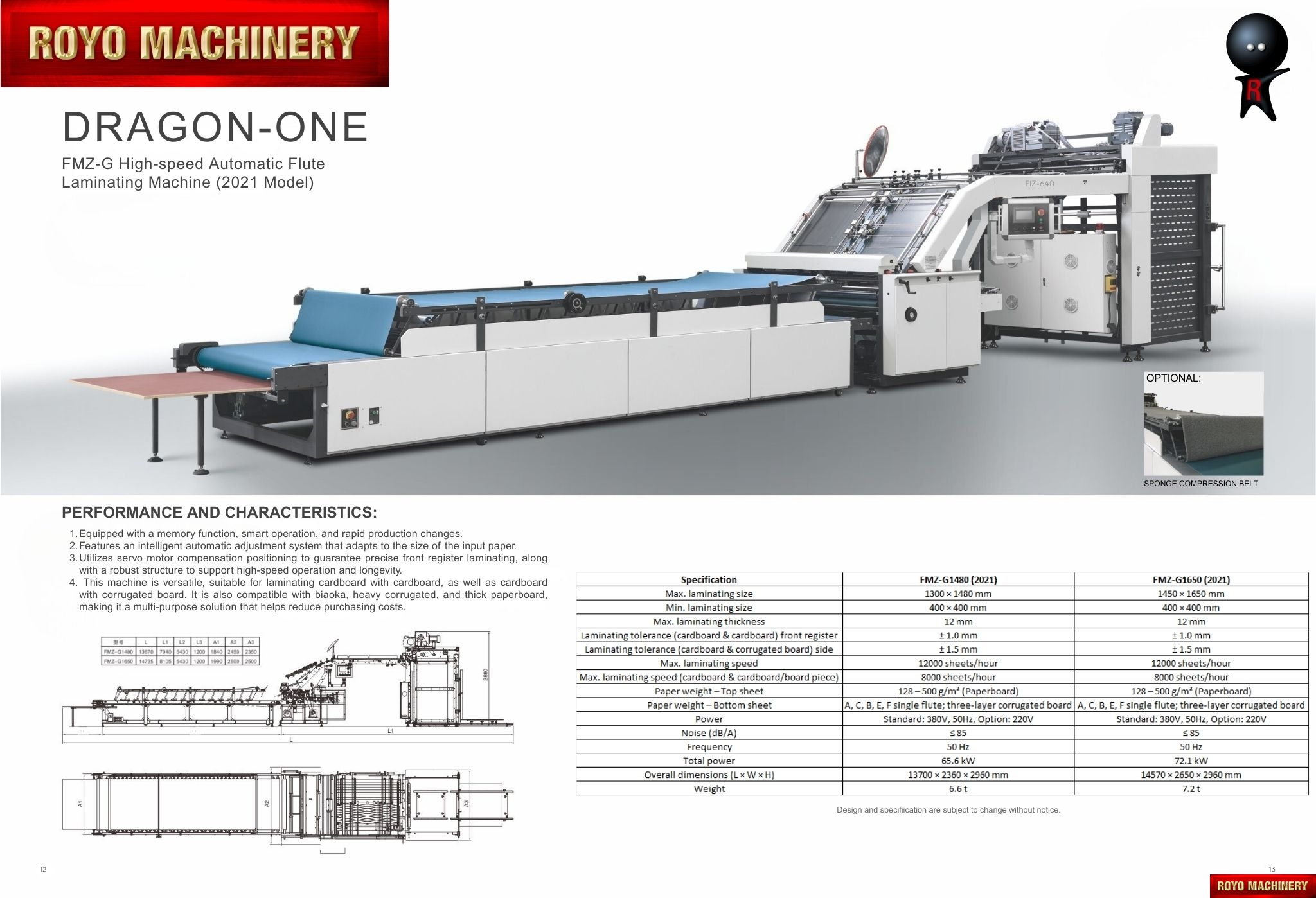 Peso 8.5t, Dimensiones: 11500 x 2450 x 2500 mm, Potencia Requerida: 15kw, Gramaje de la tapa: 200-450 gsm, Peso de hoja inferior > 350 gsm o Flauta A/B/C/D/E/F, Tamaño Min de Papel: 400 x 400mm, Tamaño Max de Papel: 1600 x 1200mm, Tolerancia de laminado: +/- 1.5mm, Velocidad Max.: 5000 hojas por hora , Especificaciones sujetas a cambios sin previo aviso