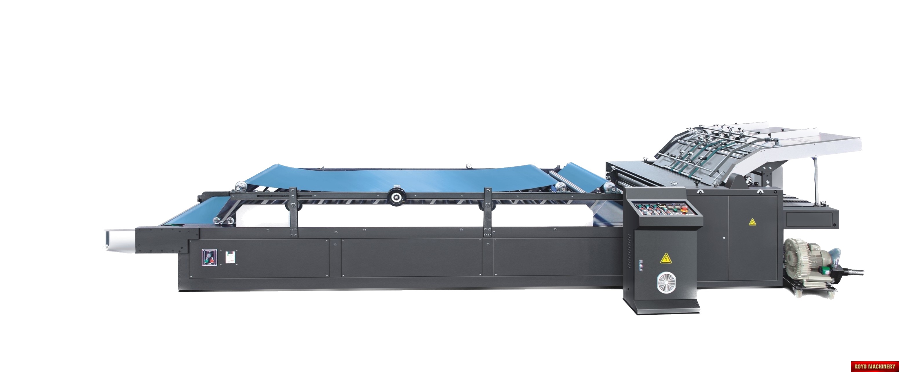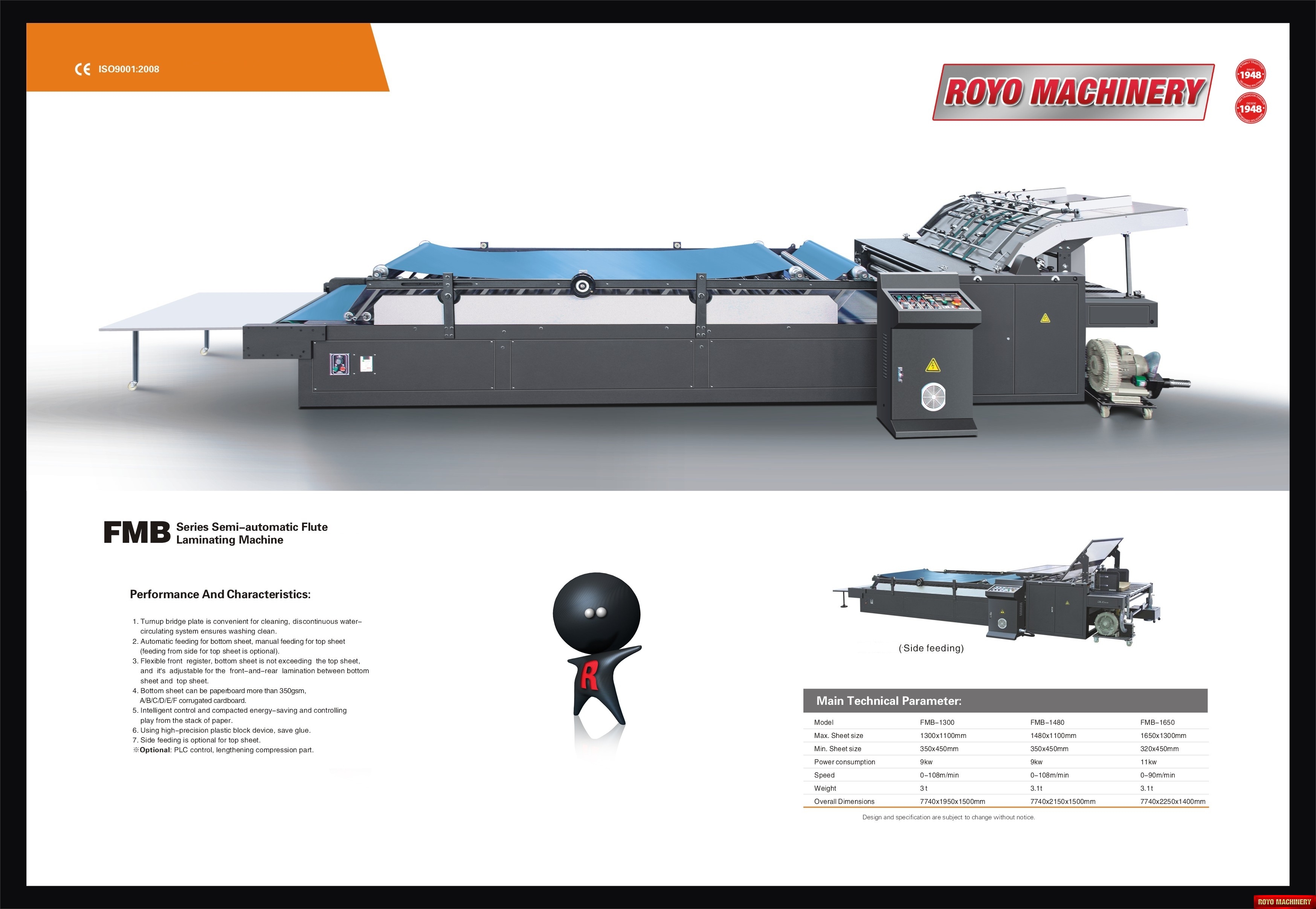 Gramaje de la tapa: 200-450 gsm, Velocidad: 0-90m/min, Potencia Requerida: 7kw, Dimensiones: 7400 x 2080 x 1400 mm, Tamaño Min de Papel: 320 x 450mm, Tolerancia de laminado: +/- 1.5mm, Peso 3.2t, Peso de hoja inferior > 350 gsm o Flauta A/B/C/D/E/F, Especificaciones sujetas a cambios sin previo aviso