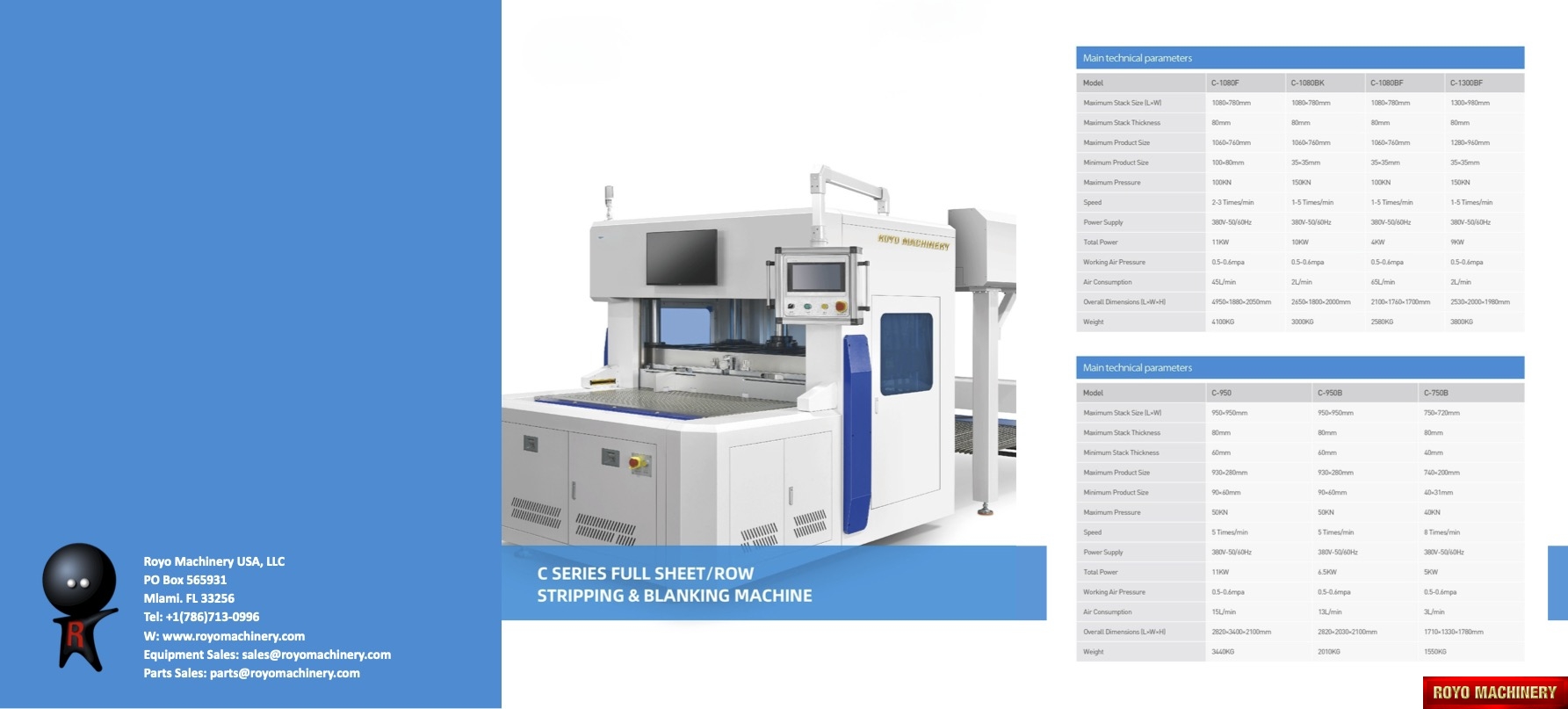 Potencia: 4 kW, Velocidad de descartonado: 1-5 Golpes por minuto, Posicion Arancelaria sugerida: 8441.40.0000, Voltaje: 220 Volts 3 Fases 60 Hz, Tamaño min. a descartonar: 35 x 35 mm, Tamaño max. a descartonar: 1060 × 760 mm, Área max. de descartonado: 1080x780 mm, Descartonadora de pagina completa, Máx. altura de carga: 80 mm, Presion de Aire: 0.65-0.8MPa, Consumo de aire: 65 l/min, Max. presión hidráulica: 100 kN, Dimensiones: 2100 x 1760 x 1700 mm, Peso: 2580 kg