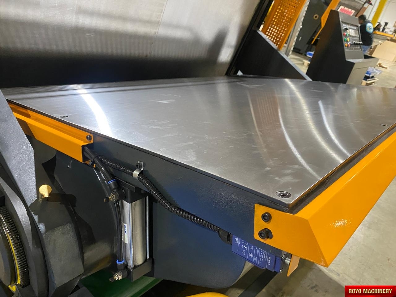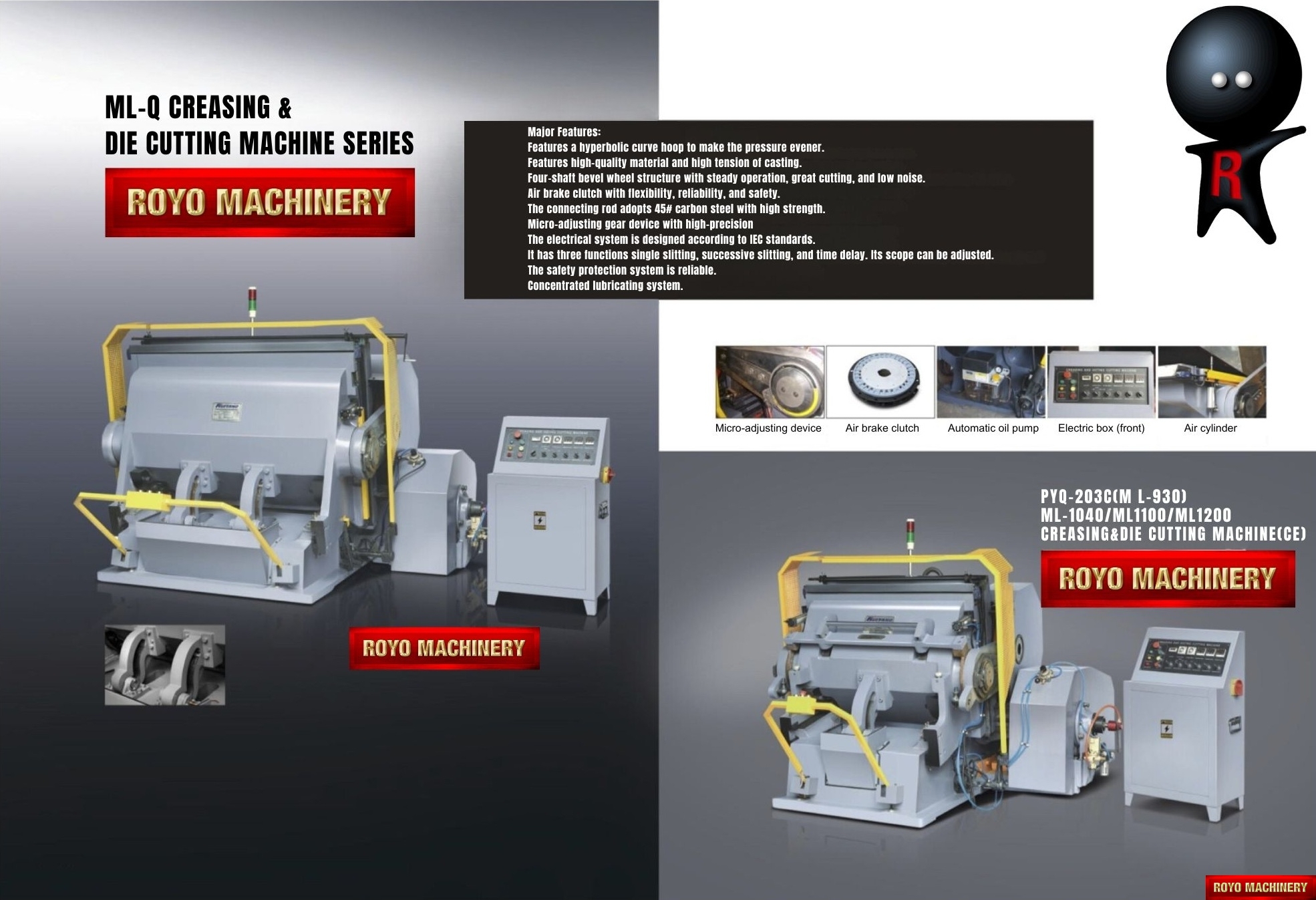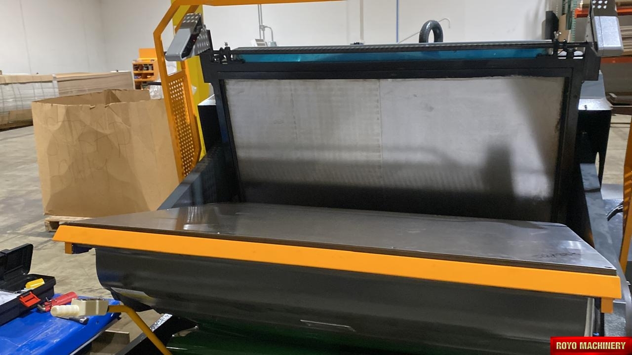 Control de ciclo: Corte único y parada en posición abierta - retardo de tiempo en posición abierta - ciclo continuo, Presión de aire: 7 bar - 0.3 m3/min, Dimensions: 2850 x 2250 x 2100 mm, Cortina protectora contra el polvo, Área interior del marco: 1600 x 1250 mm, Luces de seguridad infrarrojas, Longitud max. de troquelado: 50 metros, Embrague neumático, Sistema de Calentamiento, Alimentación Manual, Dimensiones: 2650 x 2100 x 2000 mm, Lubricación centralizada con bomba automática, Placa de acero de 5mm, Grua para remoción del marco, Altura recomendada de la pleca: 23.8mm, Partida Arancelaria sugerida: 8443.19.8000 (Manual), Potencia Requerida: 11kw, Peso total: 11.5 Toneladas, Dispositivo triple de seguridad electromecánico