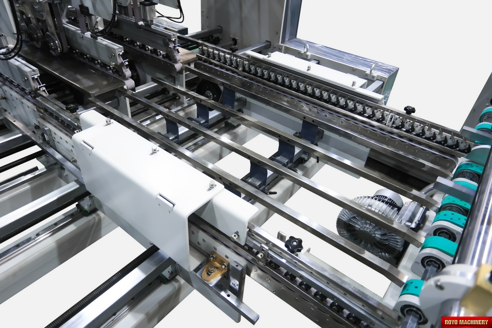 Motorized carriage positioning (Optional), Motorized 4 and 6 corner device (optional), Delivery pneumatically adjusted, Crash lock bottom, Automatic belt tension on trombone, Continuous vacuum feeder with variable speed, 4 and 6 corner boxes capable (optional), Adjustable electronic pile vibrator, Pressure roller gap auto set , Speed: 0-300m/min, Straight Line, Weight 14.8t, Folding hooks & helixes to fold front flaps, Fitted with pre-folding pre-creaser, Blank width: 290-1450 mm, Corrugated flute type: E C B AB 3 & 5 layers, Dimensions: 22400 x 2200 x 1700 mm, Air Pressure Required: 6 Bars, Total Power: 56kw, Max. Carton Thickness: 1200gsm, Inching speed: 20 m/min, Air tank capacity: 155 L, Machine length: 22.4 m, Specifications are subject to change without notice