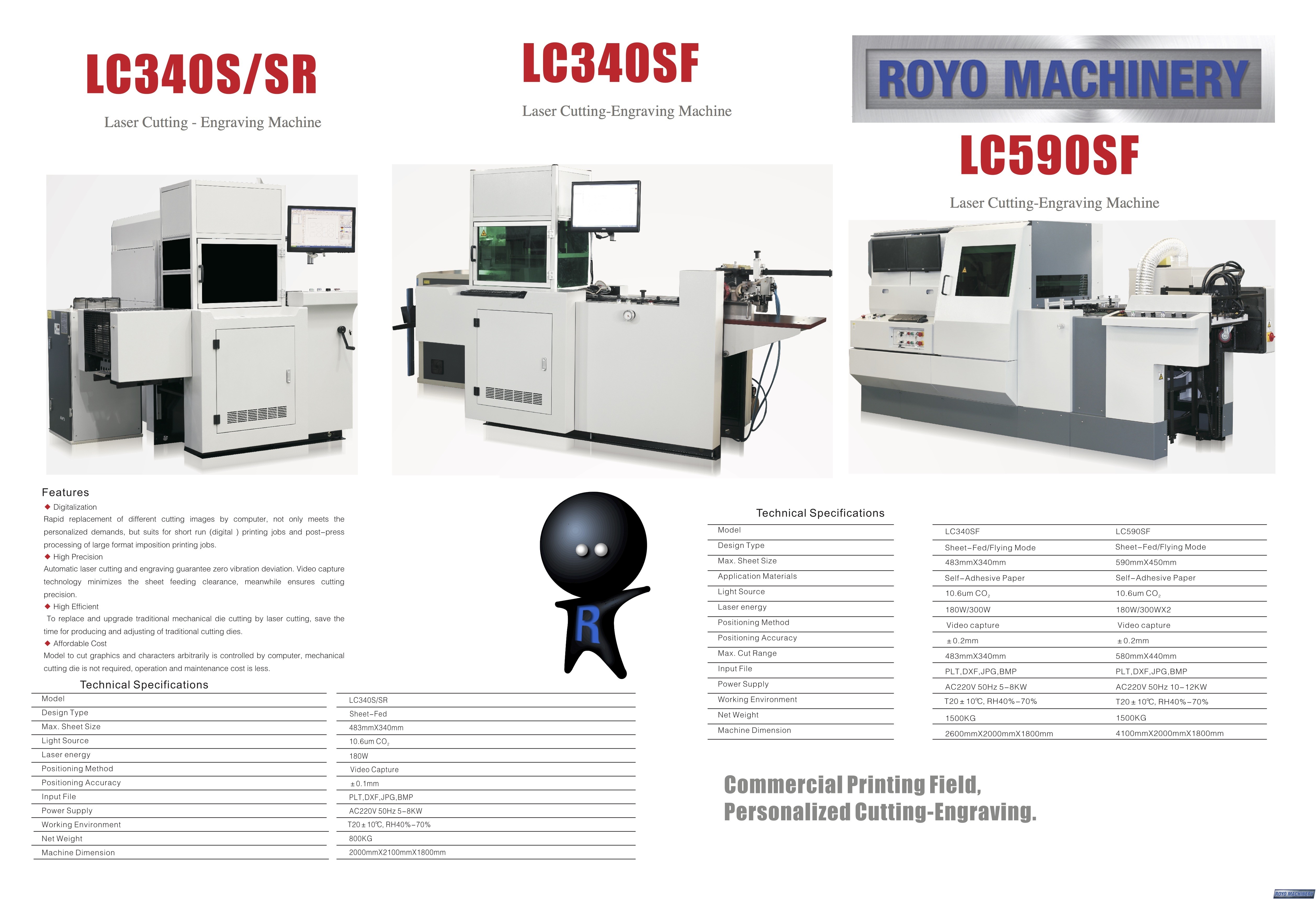 Weight: 800 kg, Repositioning accuracy: +/-0.1mm, Positioning method: Video capture on the run, Laser power: 180 W, Graphic format supported: DXF PLT JPG BMP, Feeder: Sheet-Fed, Dimensions: 2000 x 2100 x 1800 mm, Max. Paper size 483 x 340mm, Suggested HS Code: 8454.1000, Specifications are subject to change without notice