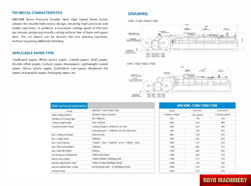 Color LCD operating panel, Auto cut length adujstment system, 2x Roll Stands, Self adjusting air brakes, Suggested HS code: 8441.10.0000, Three pneumatic Festo slitters, Max. roll diameter: 1800mm, Waste Bag Extraction, 1x Roll Stand, Phoelectric tracking system, Total Weight: 18000kg, Twin Rotary Knife, Cut-off range: 18-65", Dual tab inserter, Edge positioning controller, Hydraulic shaftless mill roll stands, Max. paper width: 1500mm, Overlapper & piler, Paper tensioning control, Total Power: 82kw, Paper thickness: 60-800 gsm, Max. cutting speed: 540 cuts/min, Max. cutting speed: 330 m/min, Dimensions: 12900 x 2485 x 1850 mm, Delivery pile height: 1600mm, Cut off tolerance: +/- 0.1mm