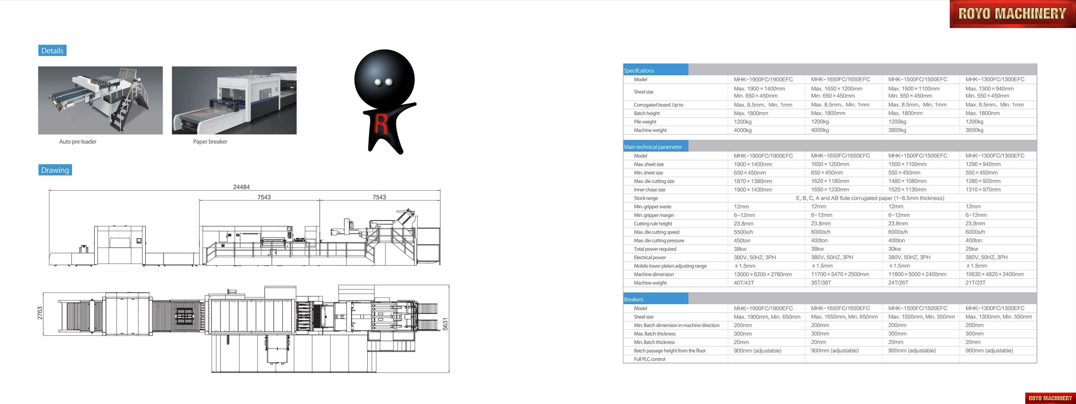 Suitable paper 1-8 mm corrugated paper (including laminated), Non-stop delivery with rolling curtain, Step-less speed control, Heavy Duty, Heavy duty gripper bars, Central lubrication with auto pump , Die cutting chase pneumatic locking mechanism, Digital LED control panel, CE Standard Machine, Automatic pressure adjustment, Air clutch, Specifications are subject to change without notice
