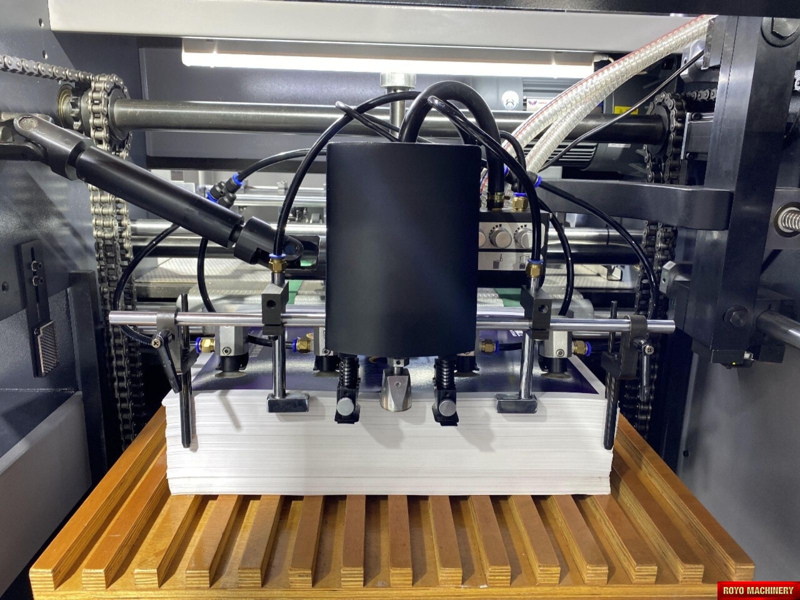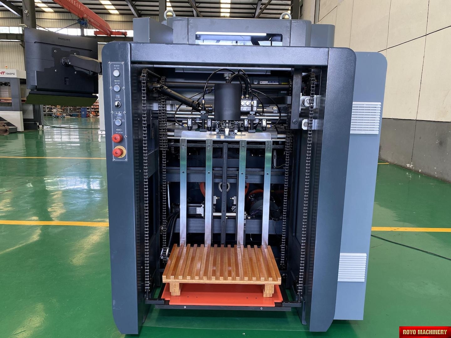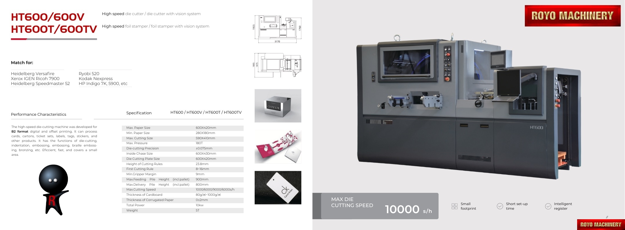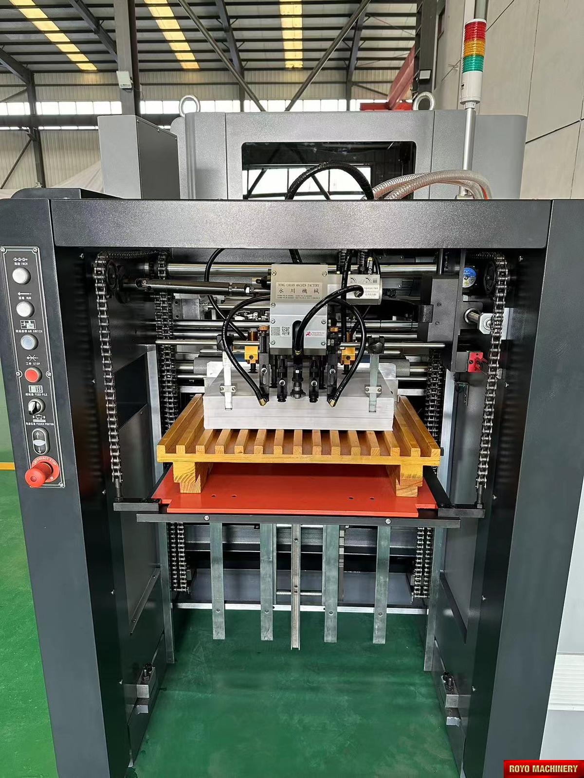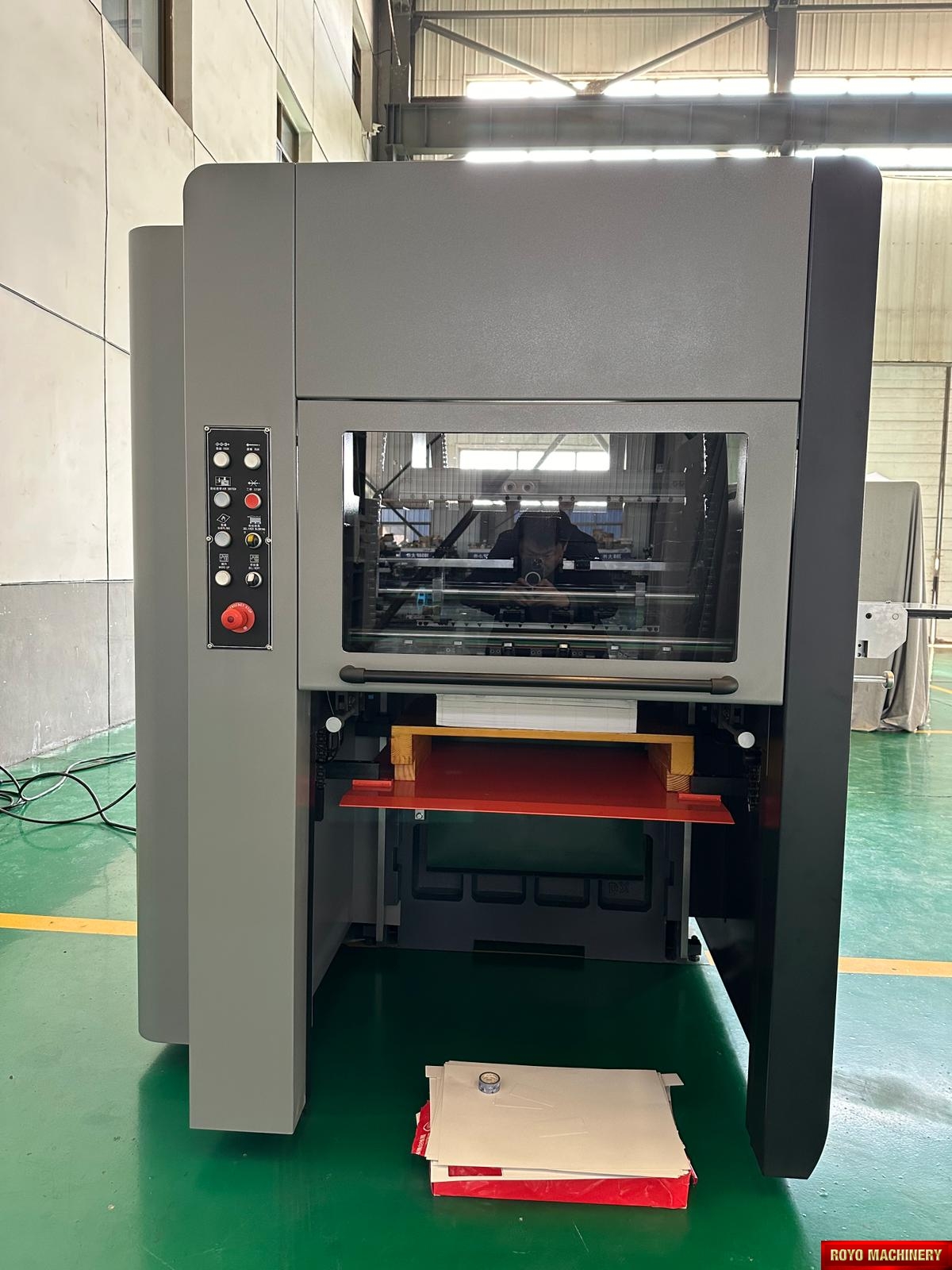 Die cutting precision: +/- 0.075mm, Motorized front lays with optical monitoring, Max. Speed: 10000 strokes per hour, Gripper Margin: 8-17 mm, Digital LED control panel, Central lubrication with auto pump , CE Standard Machine, Automatic pressure adjustment, Air clutch, Total Weight: 5.5 Tons , Total Power: 10W, Frontal back and side registration mechanism, Min. paper size: 280 x 180mm, Max. paper size: 600 x 420mm, Max. feeding pile height: 900 mm, Max. die cutting size: 590 x 410mm, Dimensions: 3166 x 1890 x 1855 mm, Min. gripper margin: 9mm, Min. distance to 1st rule: 8-16mm, Max. die cutting pressure: 180 Tons, Inner chase size: 600 x 430 mm, Delivery pile height: 800 mm, Die cutting chase pneumatic locking mechanism, Suggested HS code: 8441.4000 (Automatic), Step-less speed control, Pull or Push side lay on both sides, Pneumatic flap for test sheet removal, Recommended height of cutting rules: 23.8mm, Die cutting plate size: 600 x 420mm, Corrugated board up to 4mm, Specifications are subject to change without notice