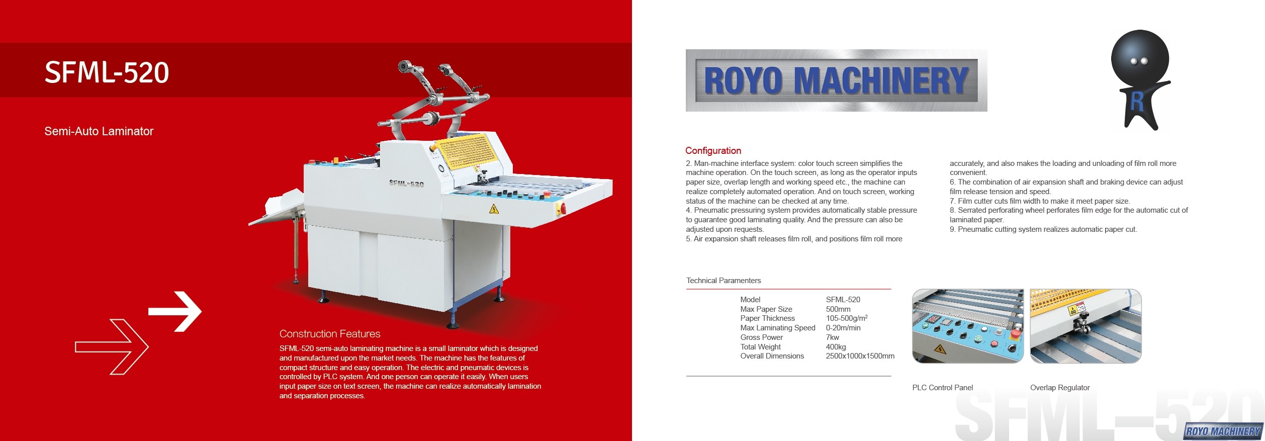 Voltage: 220V 60/50HZ, Paper thickness: 100-500 gsm, Laminating Speed: 0-20m/min, Total Weight: 400kg, Dimensions: 2500 x 1000 x 1500 mm, Max. Paper Width: 500mm, Suggested HS code: 8420.10.0090, Specifications are subject to change without notice