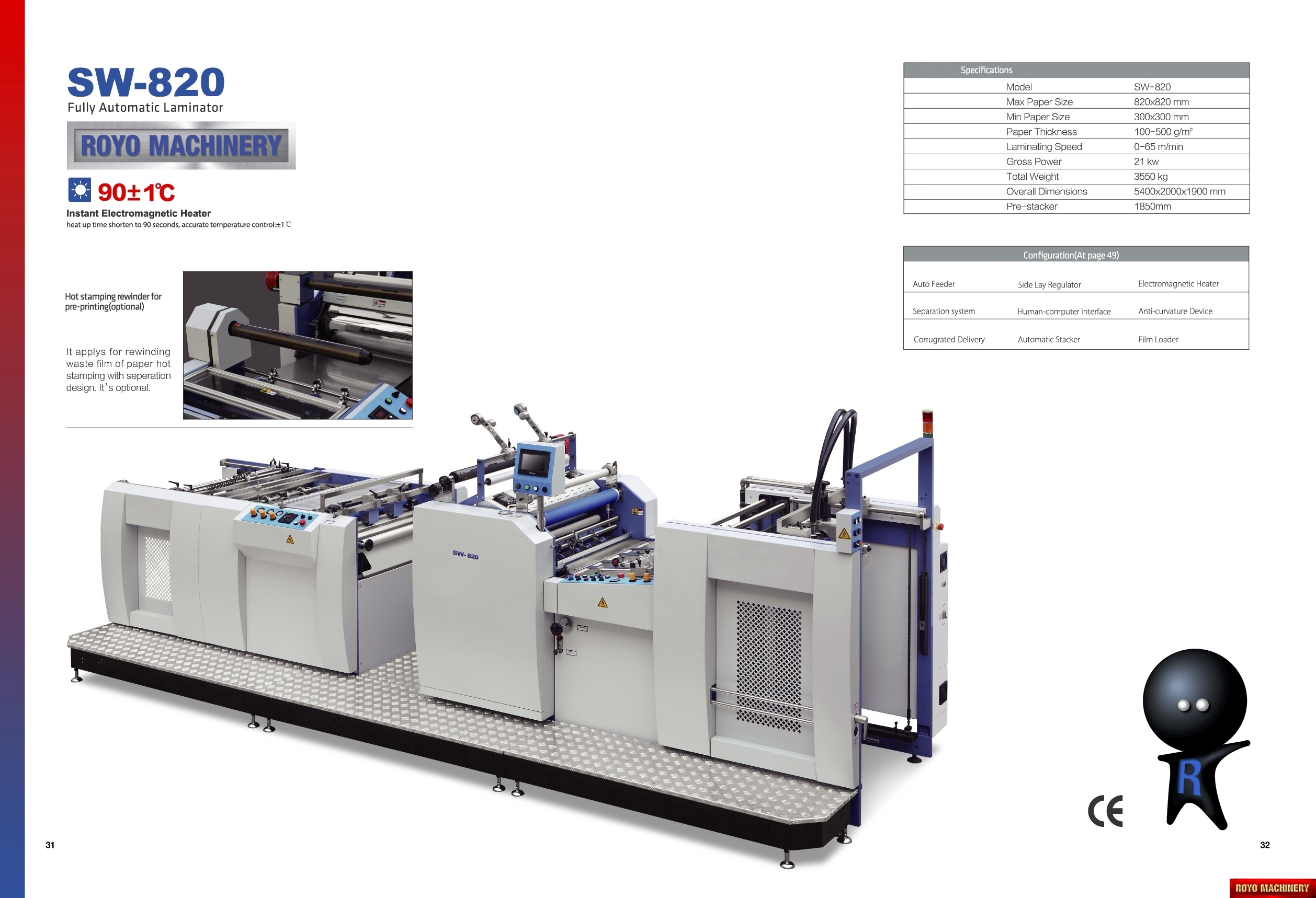 Min. Paper size: 300 x 300mm, Voltage: 220V 60/50HZ, Total Power: 21kw, Paper thickness: 100-500 gsm, Max. Paper size: 1050 x 820mm, Laminating Speed: 0-65 m/min, Total Weight: 3550kg, Sheet separator, Electromagnetic heater, Dimensions: 5400 x 2000 x 1900 mm, Hot stamping foil rewind (Optional), Delivery table with jogger, Stacker (Optional), Sheet decurler, Film loader (Optional), Suggested HS code: 8420.10.0090, Specifications are subject to change without notice