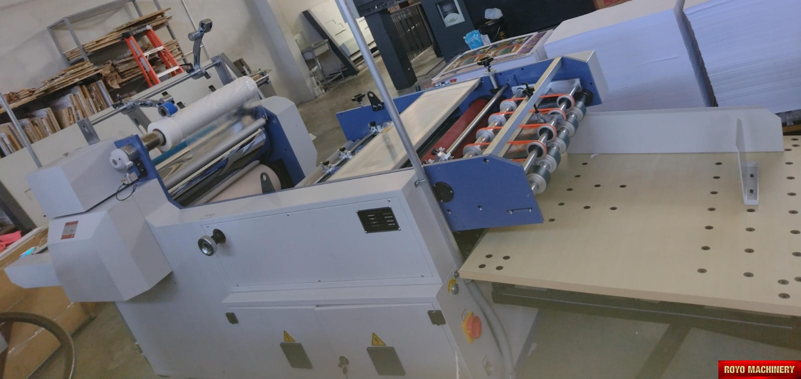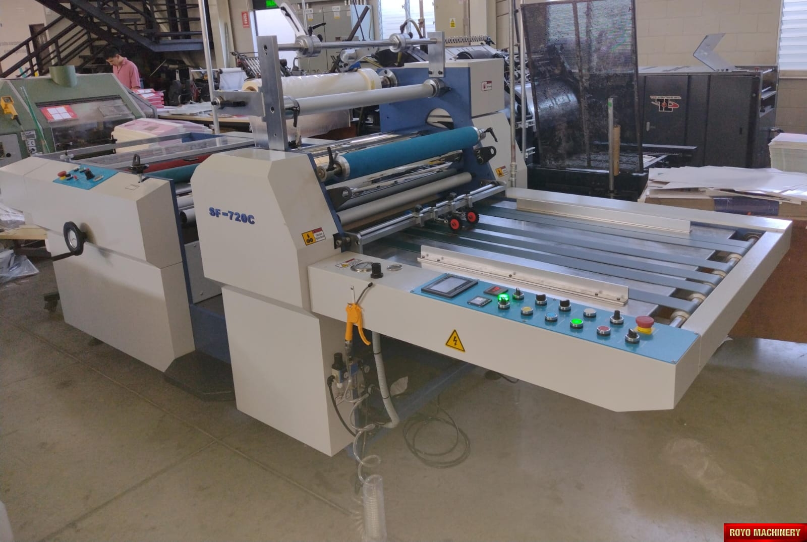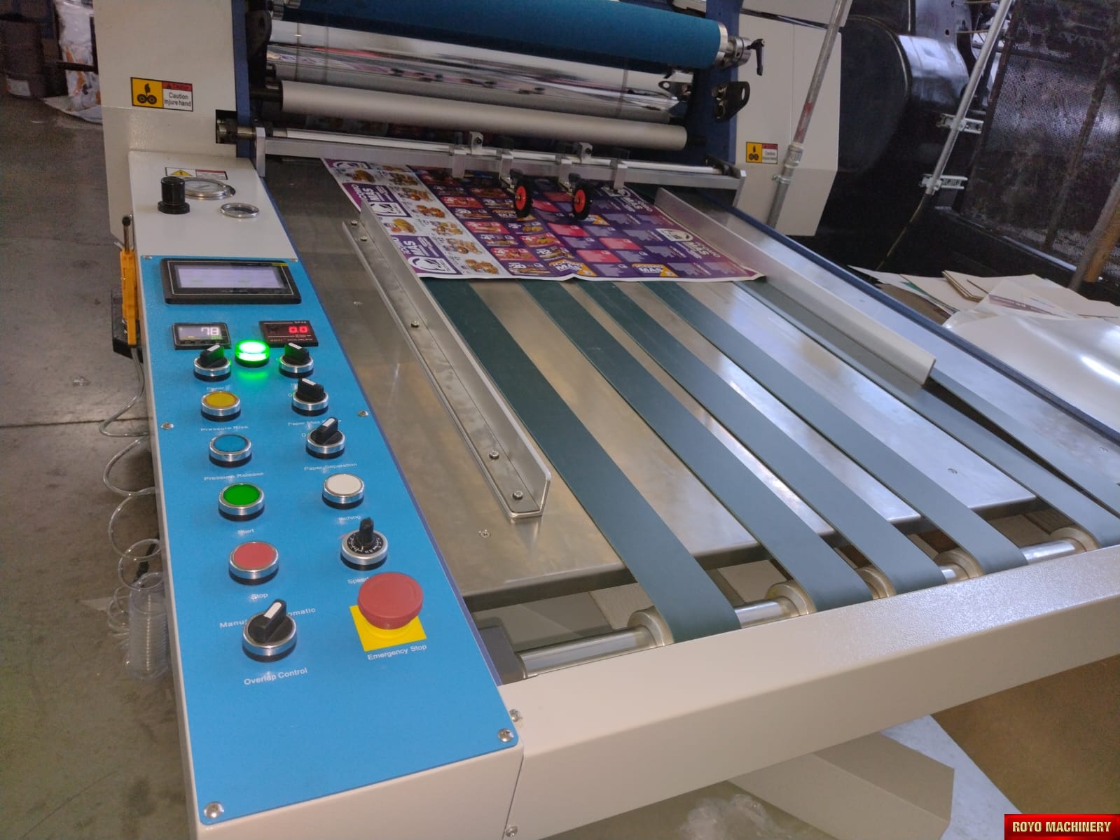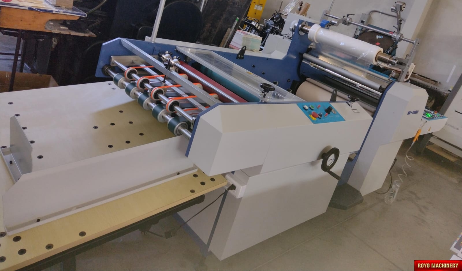 Total Power: 18kw, Paper thickness: 100-500 gsm, Max. Paper Width: 720mm, Laminating Speed: 0-30m/min, Suggested HS code: 8420.10.0090, Sheet separator, Total weight: 1700kg, Dimensions: 4600 x 1560 x 1500 mm, Voltage: 220V 60/50HZ, Delivery table with jogger, Specifications are subject to change without notice