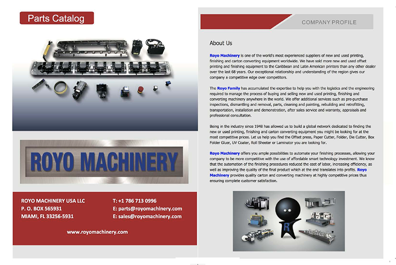 Suministramos piezas originales y repuestos compatibles que cumplen con los más altos estándares de calidad para la mayoría de las marcas más populares de la industria de la impresión, como Heidelberg, Roland, Komori, Polar, Stahl y Muller Martini. Además de nuestros repuestos, también contamos con una línea completa de accesorios para la mayoría de las máquinas, incluyendo, entre otros, secadores IR, unidades de pulverización de polvo, adaptadores para cortadoras de papel, dispositivos antiestáticos, secadores UV y kits de reconstrucción. No dude en contactarnos si necesita ayuda para localizar cualquier componente mecánico o eléctrico que pueda requerir para su máquina de impresión offset, cortadora de papel, plegadora, encuadernadora, grapadora o CTP usada.