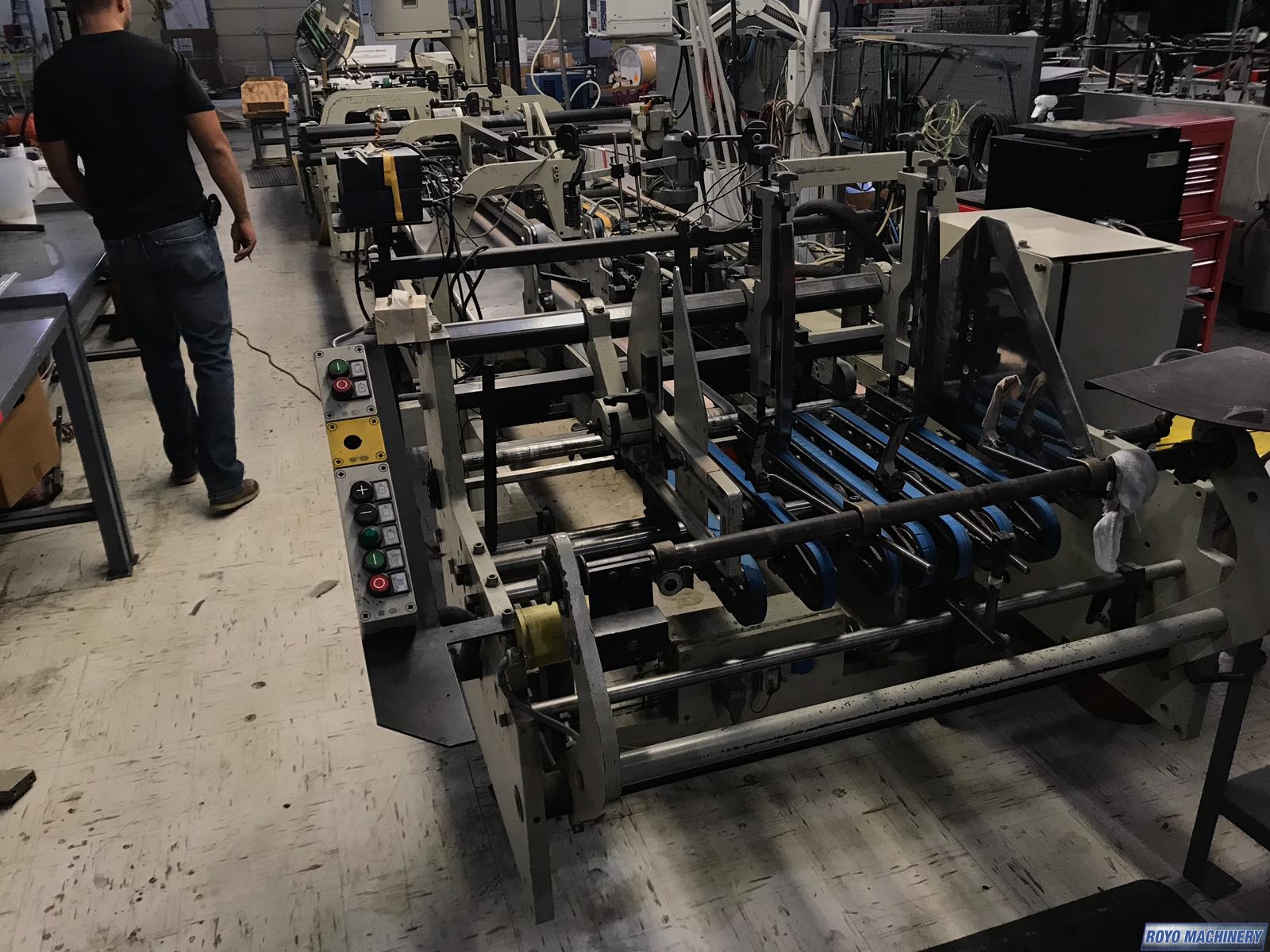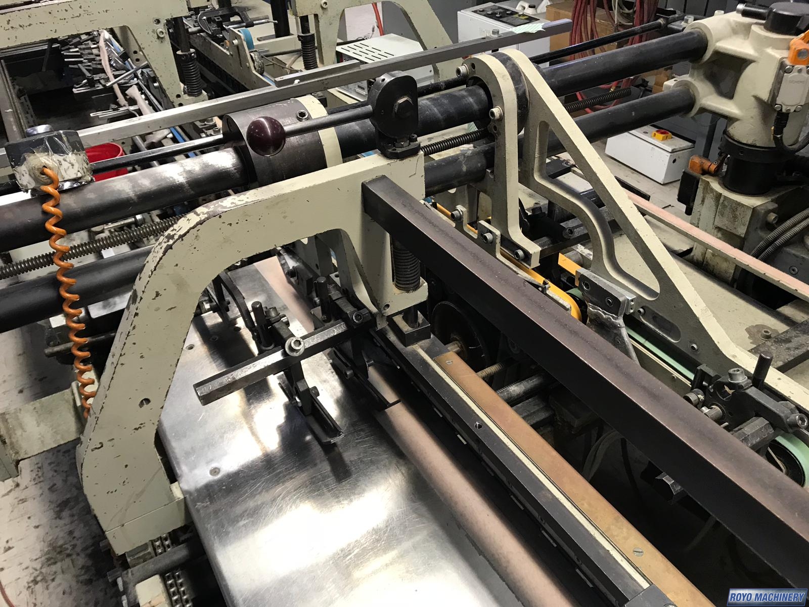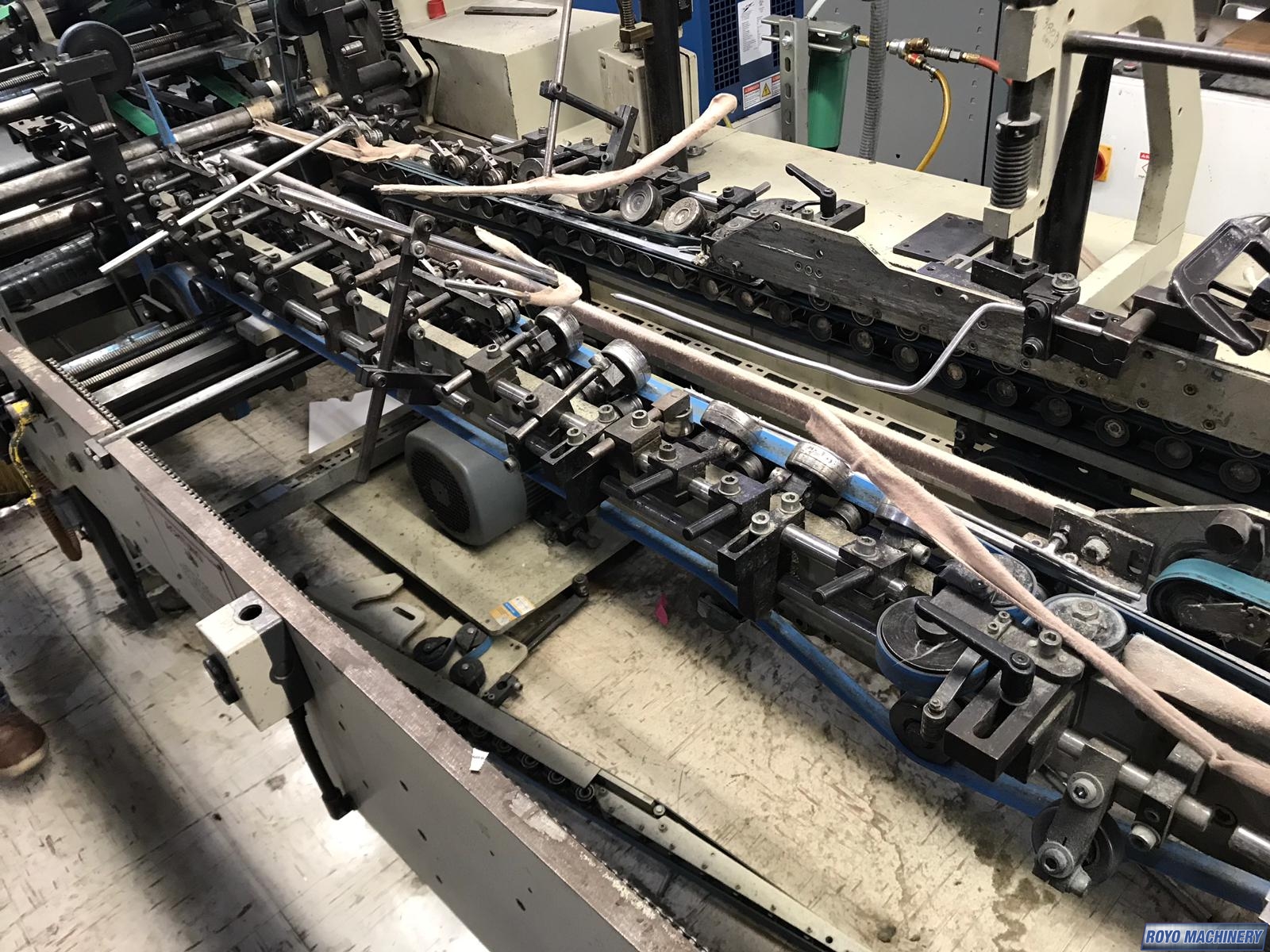 Upper and lower drive for length adjustment on the trombone, Two upper and two lower carriers, Two lower glue tanks (left & right), Two adjustable front feed knives , Lock bottom: 90 degress pre-folding for No.3 line, Folding hooks & helixes to fold front flaps, First and Third crease openers, Delivery mechanically adjusted, Crash lock bottom, Continuous friction feeder with variable speed
