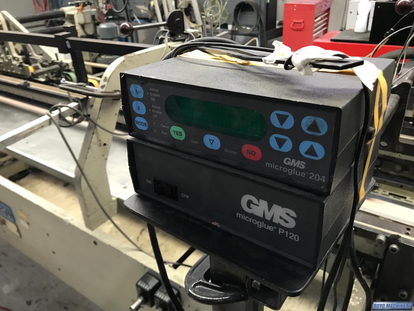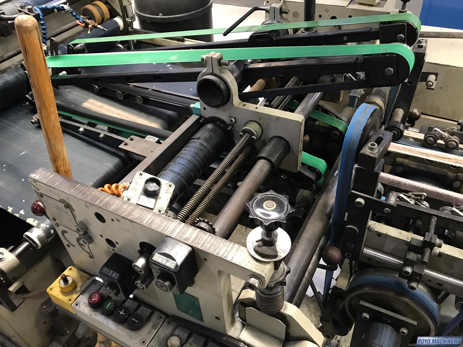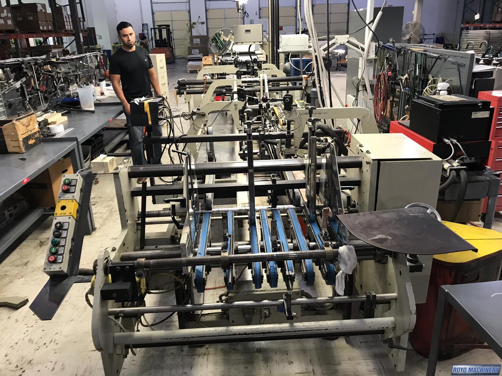 Upper and lower drive for length adjustment on the trombone, Two upper and two lower carriers, Two lower glue tanks (left & right), Two adjustable front feed knives , Lock bottom: 90 degress pre-folding for No.3 line, Folding hooks & helixes to fold front flaps, First and Third crease openers, Delivery mechanically adjusted, Crash lock bottom, Continuous friction feeder with variable speed