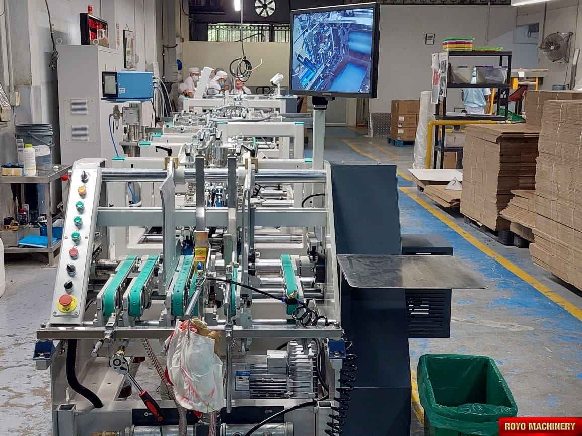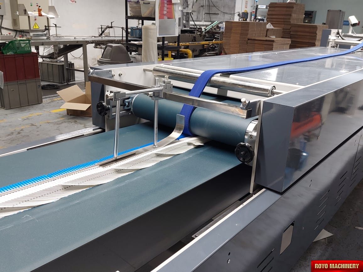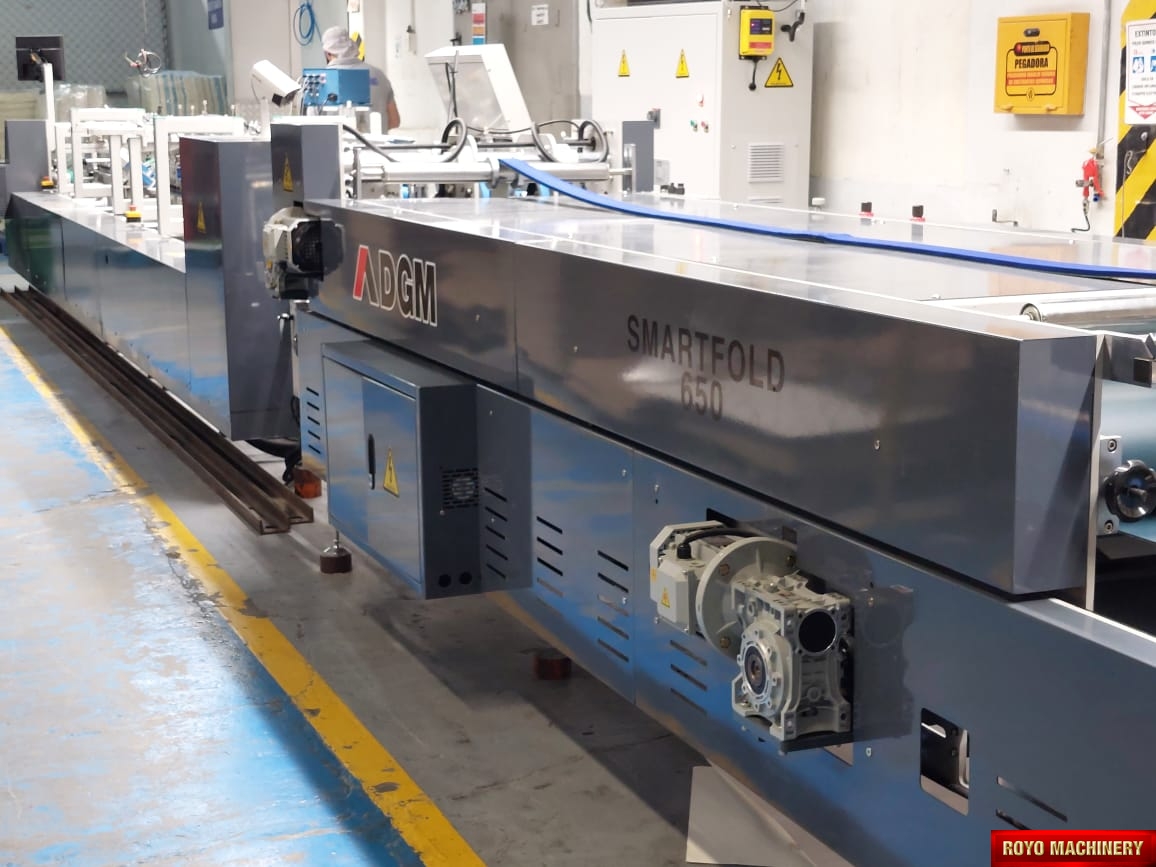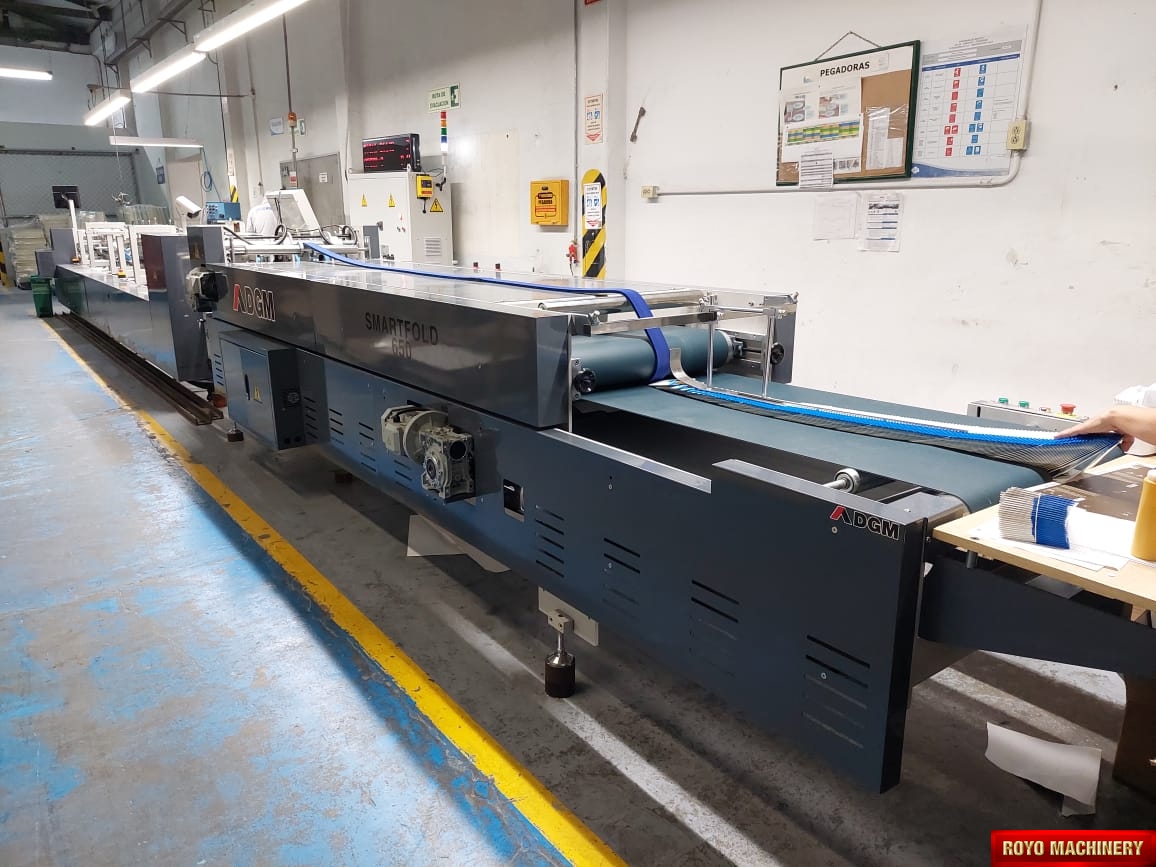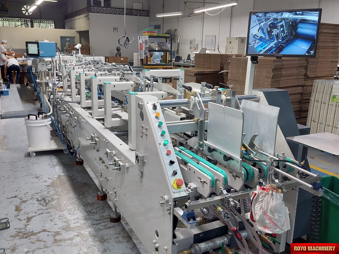 Two upper and two lower carriers, Upper and lower drive for length adjustment on the trombone, Two adjustable front feed knives , Third crease line pre-folder up to 135 degrees, Straight Line, Speed: 0-400m/min, Side register section allows perfect blank alignment, Side gluing: 135 degrees pre-folding for No.1 line, One lower (left side) gluing tank, Lock bottom: 90 degress pre-folding for No.3 line, Left hand glue flap pre-folder up to 180 degrees, Fully adjustable lateral feed gates, Folding hooks & helixes to fold front flaps, First and Third crease openers, Electronic glue system (4 Chanels - 4 Guns), Edge-grinder, Disc applied double upper gluing system, Delivery pneumatically adjusted, Crash lock bottom, Corrugated flute type: N F E, Configuration: Feeder-Pre Folding-Lock Bottom-Folding-Pressing, Carton thickness: 180-800 gsm, Automatic belt tension on trombone, Adjustable electronic pile vibrator, Accessories for B-type lock bottom