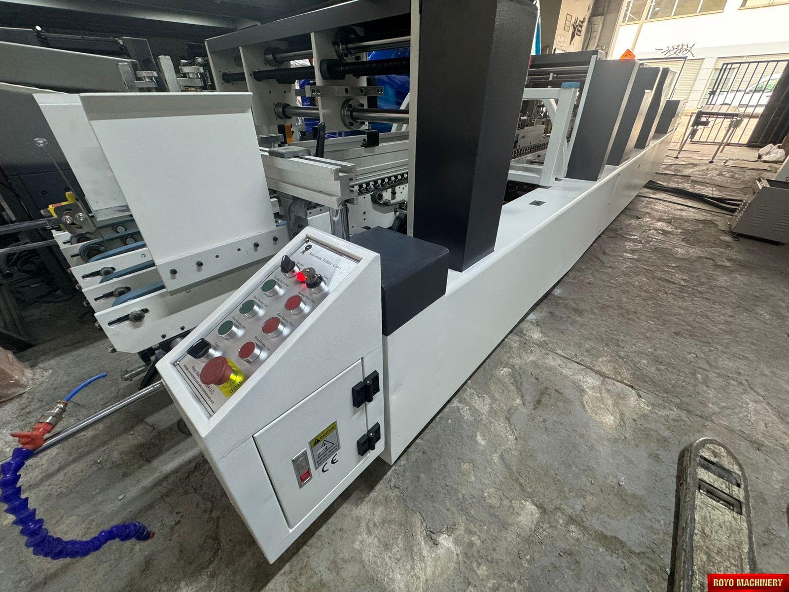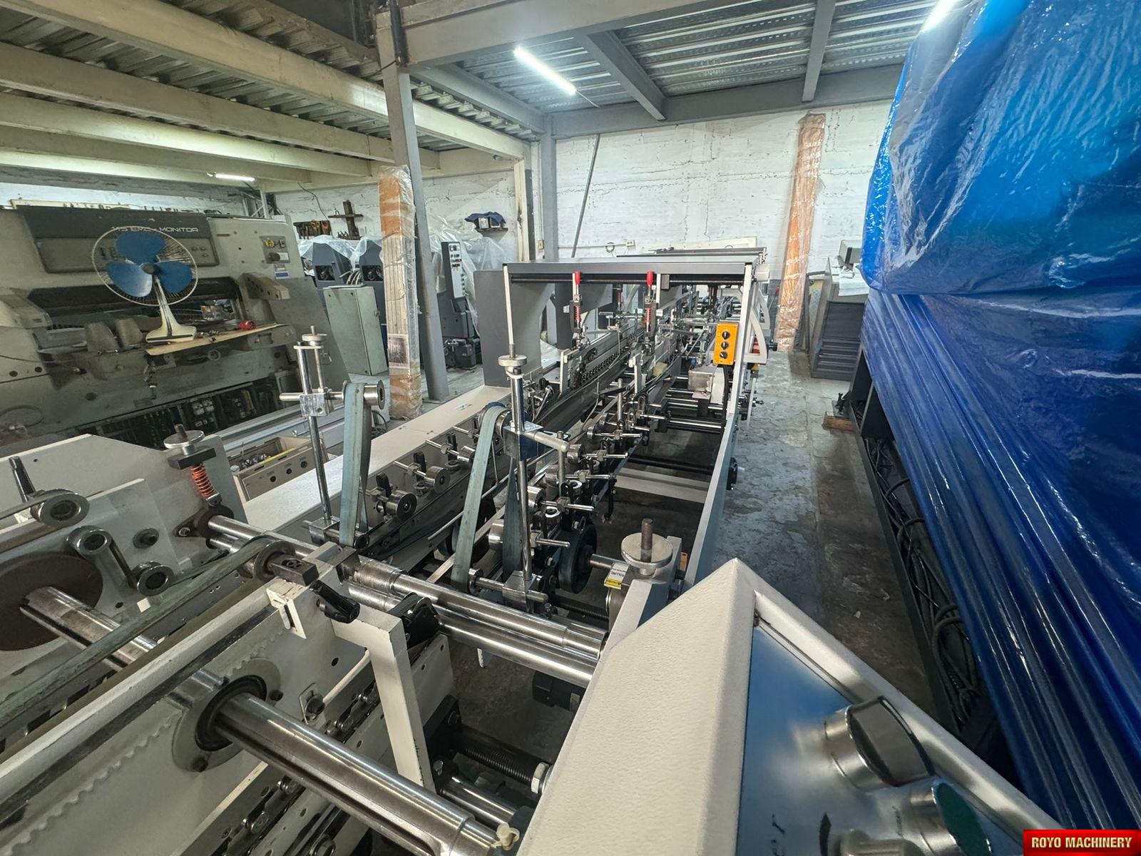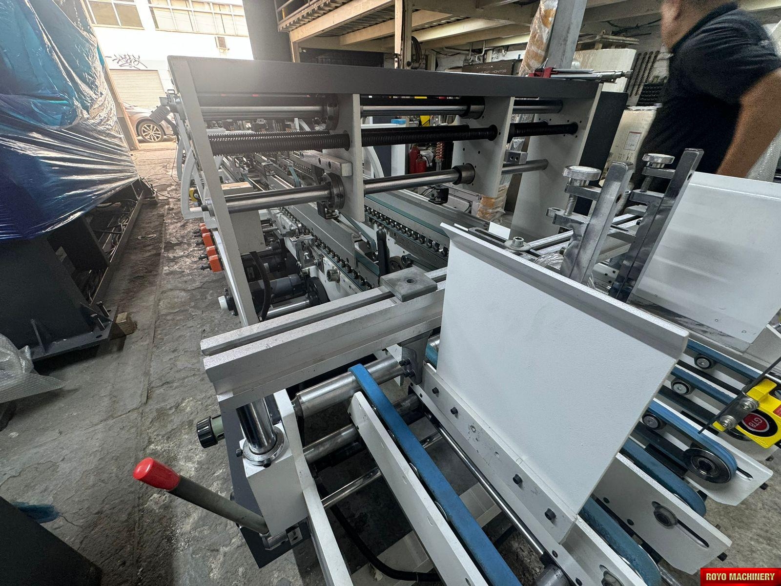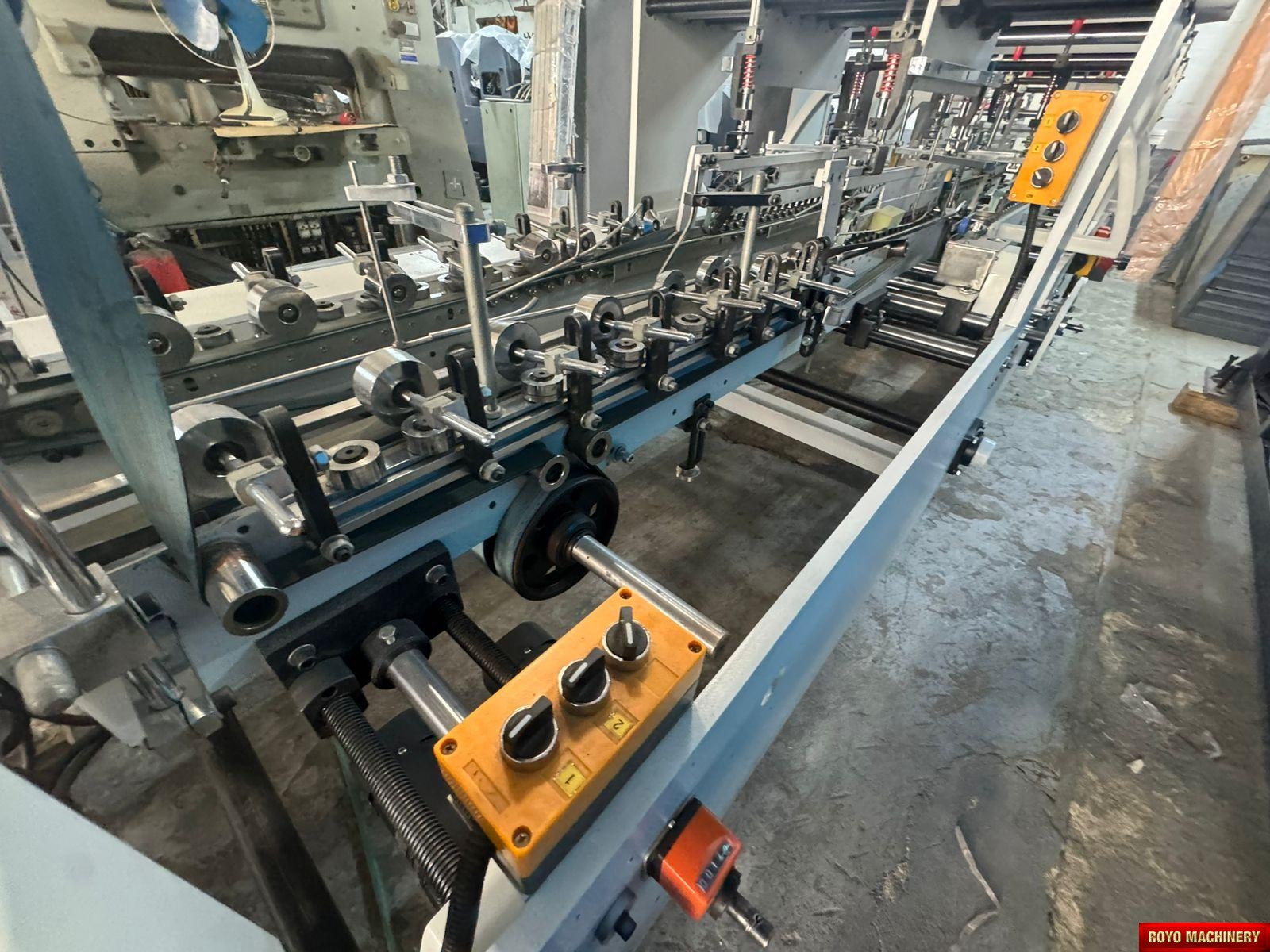 Dimensions: 12000 x 2200 x 1900 mm, Crash lock bottom, Continuous friction feeder with variable speed, Configuration: Feeder-Pre Folding-Lock Bottom-Folding-Pressing, Carton thickness: 180-800 gsm, Automatic belt tension on trombone, Adjustable electronic pile vibrator, Min. Box size: 180 x 90mm Lock Bottom, Min. Box size: 90 x 60mm Side Gluing, Max. Box size: 1100 x 800mm Lock Bottom, Max. Box size: 1100 x 1000mm Side Gluing, Lock bottom: 90 degress pre-folding for No.3 line, Fully adjustable lateral feed gates, First and Third crease openers, Corrugated flute type: N F E, Two lower glue tanks (left & right), Two adjustable front feed knives