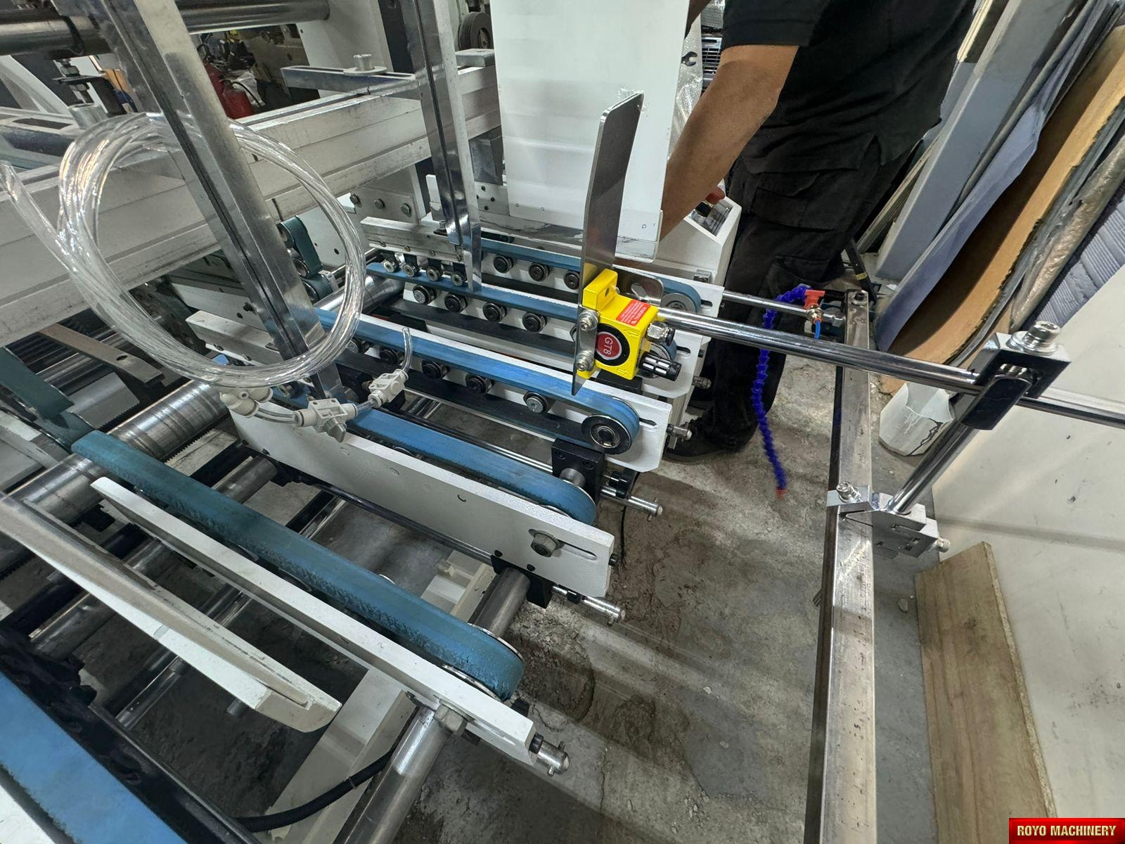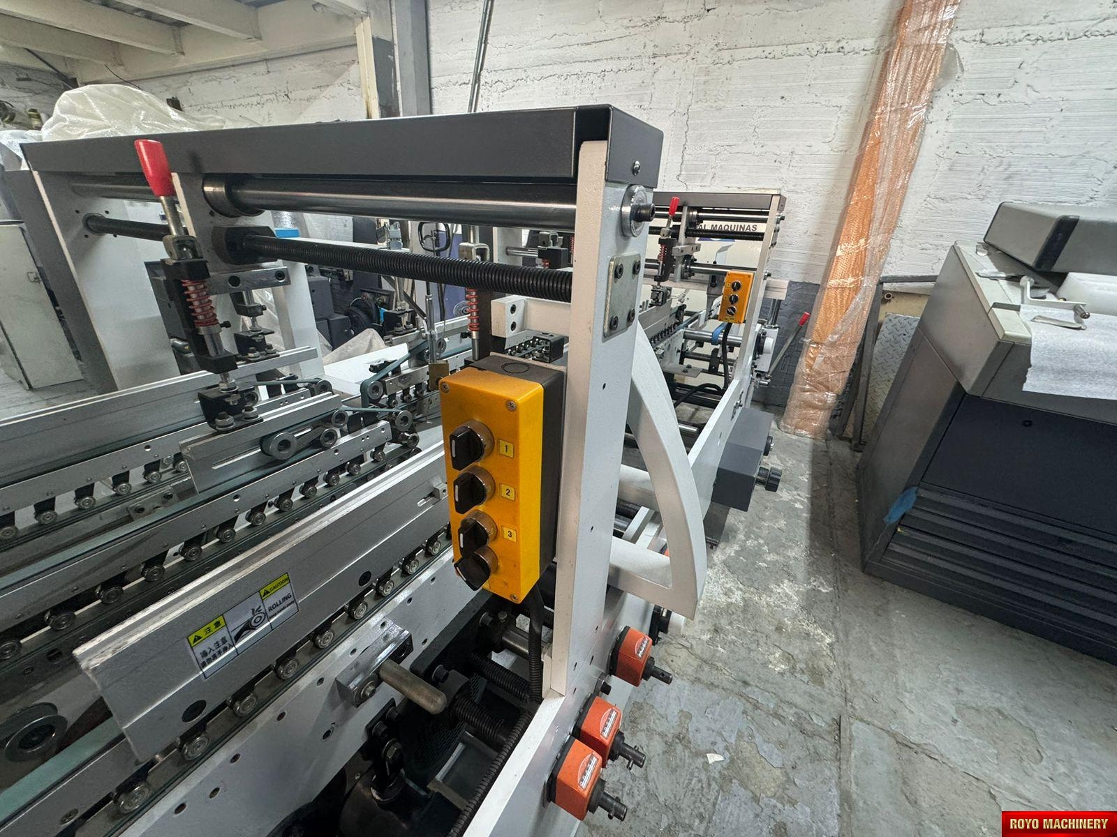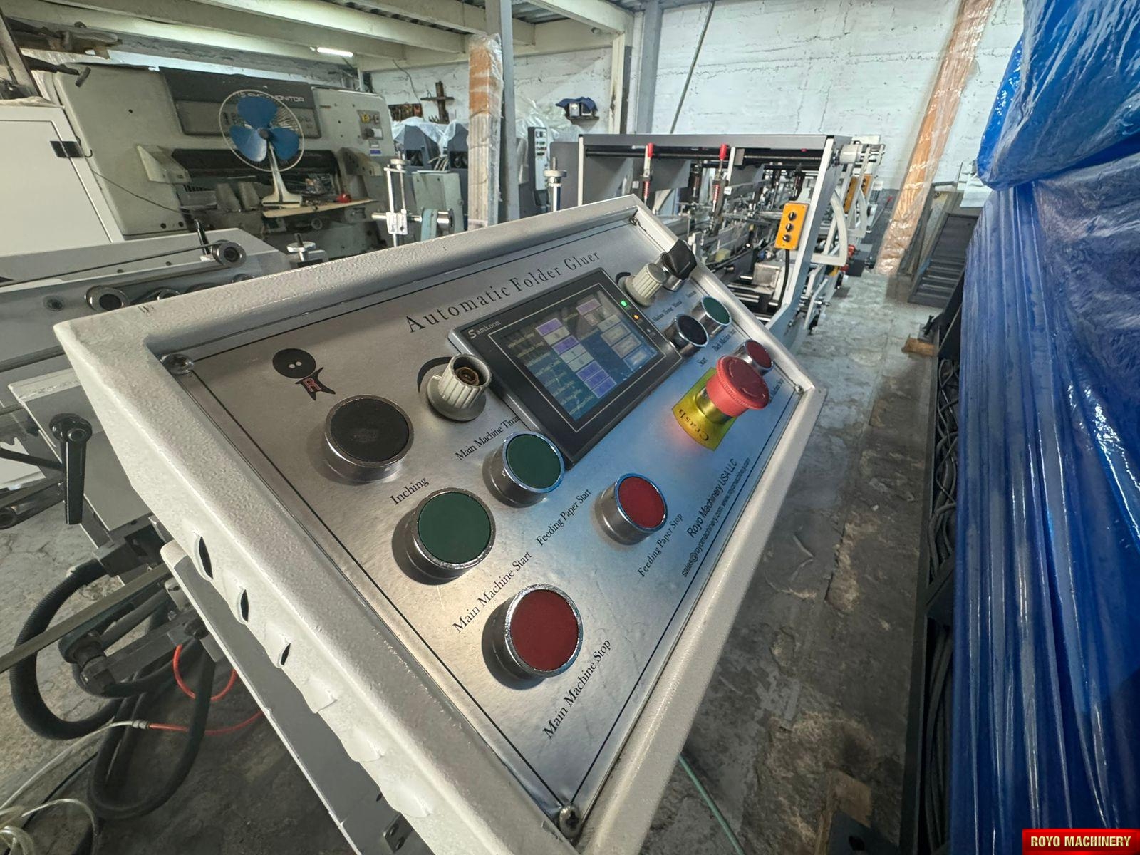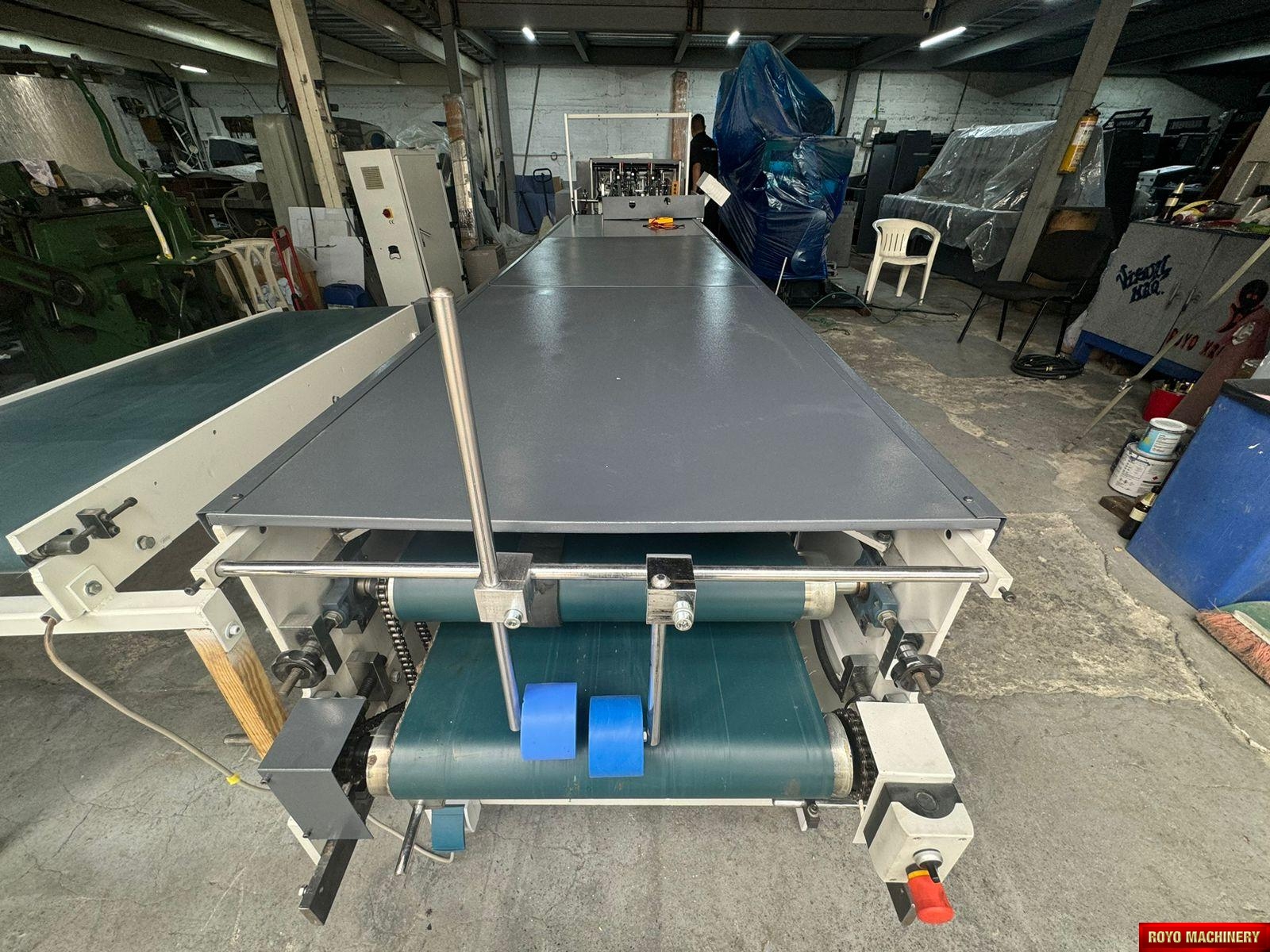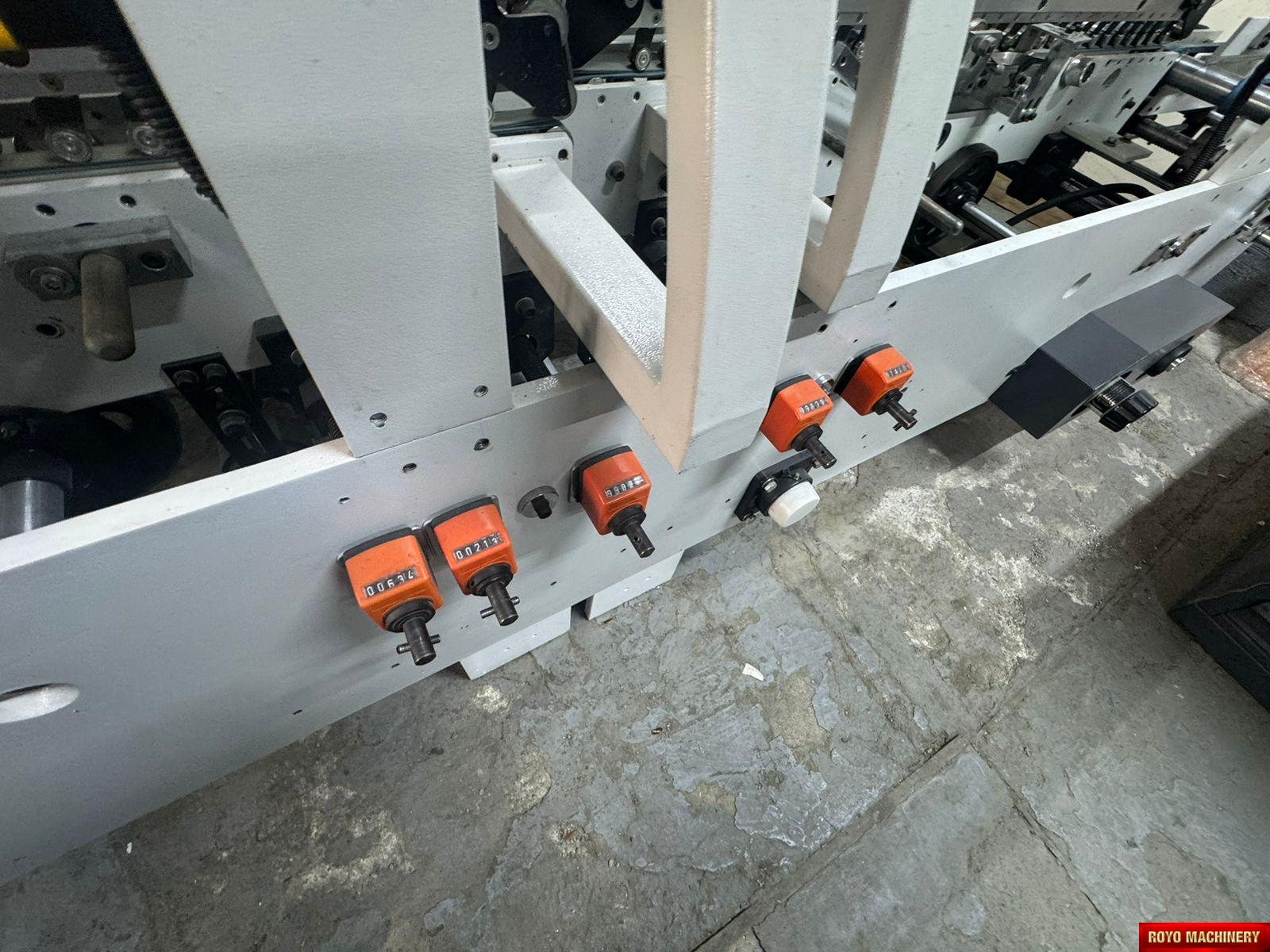 Dimensions: 12000 x 2200 x 1900 mm, Crash lock bottom, Continuous friction feeder with variable speed, Configuration: Feeder-Pre Folding-Lock Bottom-Folding-Pressing, Carton thickness: 180-800 gsm, Automatic belt tension on trombone, Adjustable electronic pile vibrator, Min. Box size: 180 x 90mm Lock Bottom, Min. Box size: 90 x 60mm Side Gluing, Max. Box size: 1100 x 800mm Lock Bottom, Max. Box size: 1100 x 1000mm Side Gluing, Lock bottom: 90 degress pre-folding for No.3 line, Fully adjustable lateral feed gates, First and Third crease openers, Corrugated flute type: N F E, Two lower glue tanks (left & right), Two adjustable front feed knives