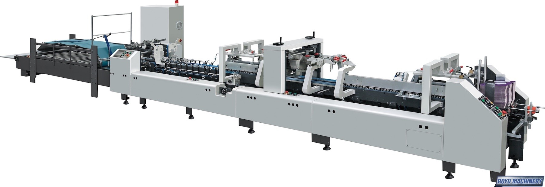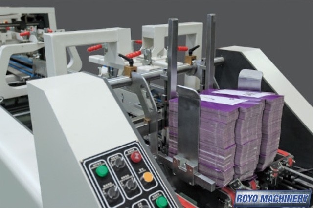Crash lock bottom, Configuration: Feeder-Pre Folding-Lock Bottom-Folding-Pressing, Edge-grinder, Continuous friction feeder with variable speed, Carton thickness: 200-700 gsm, Weight 3.5t, Total Power: 8.1kw, Speed: 0-260m/min, Min. Box size: 75 x 80mm Side Gluing, Min. Box size: 180 x 90mm Lock Bottom, Max. Box size: 650 x 550mm Side Gluing , Max. Box size: 600 x 550mm Lock Bottom, Dimensions: 12000 x 1410 x 1600 mm, Adjustable electronic pile vibrator, Disc applied double upper gluing system, Straight Line, Side gluing: 135 degrees pre-folding for No.1 line, Lock bottom: 90 degress pre-folding for No.3 line