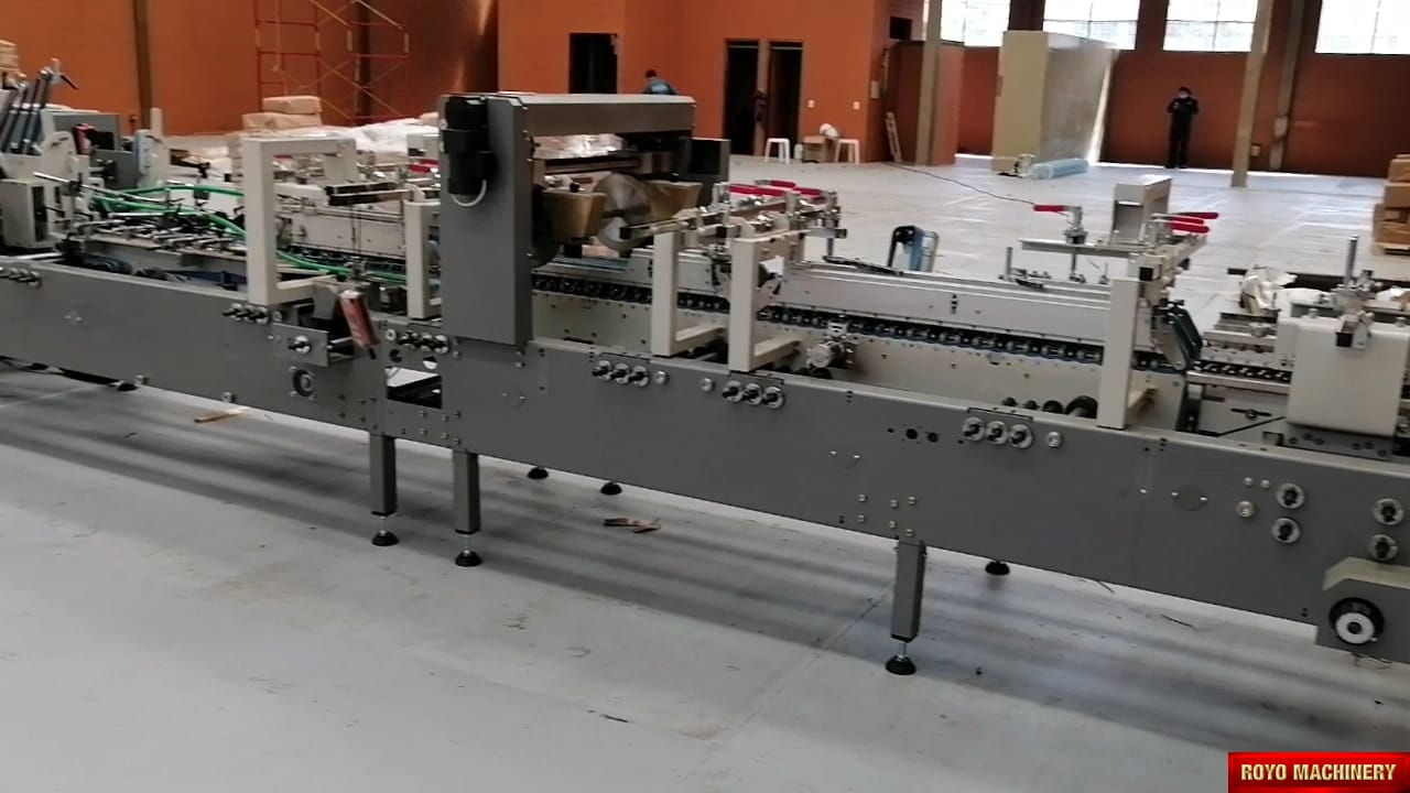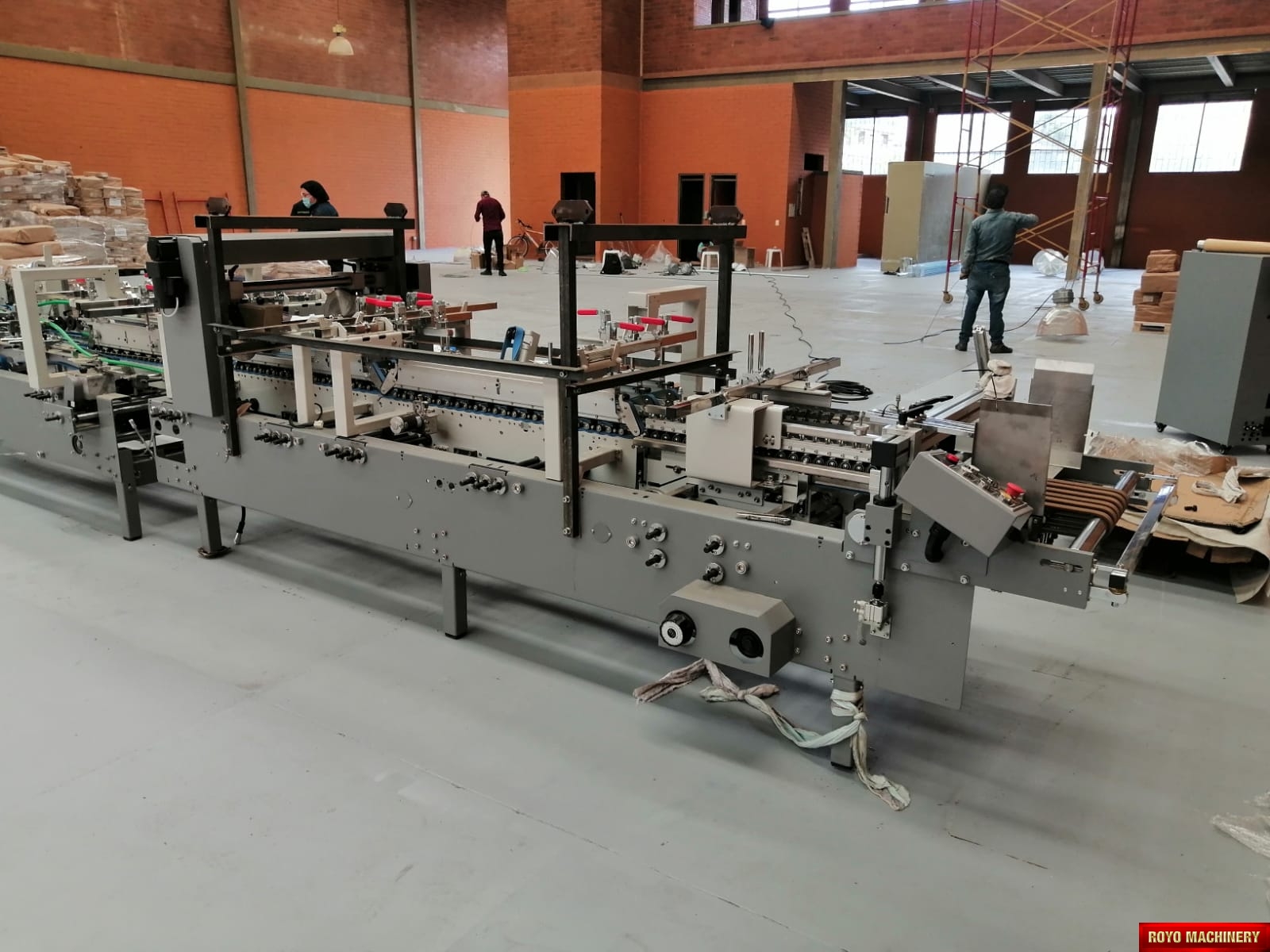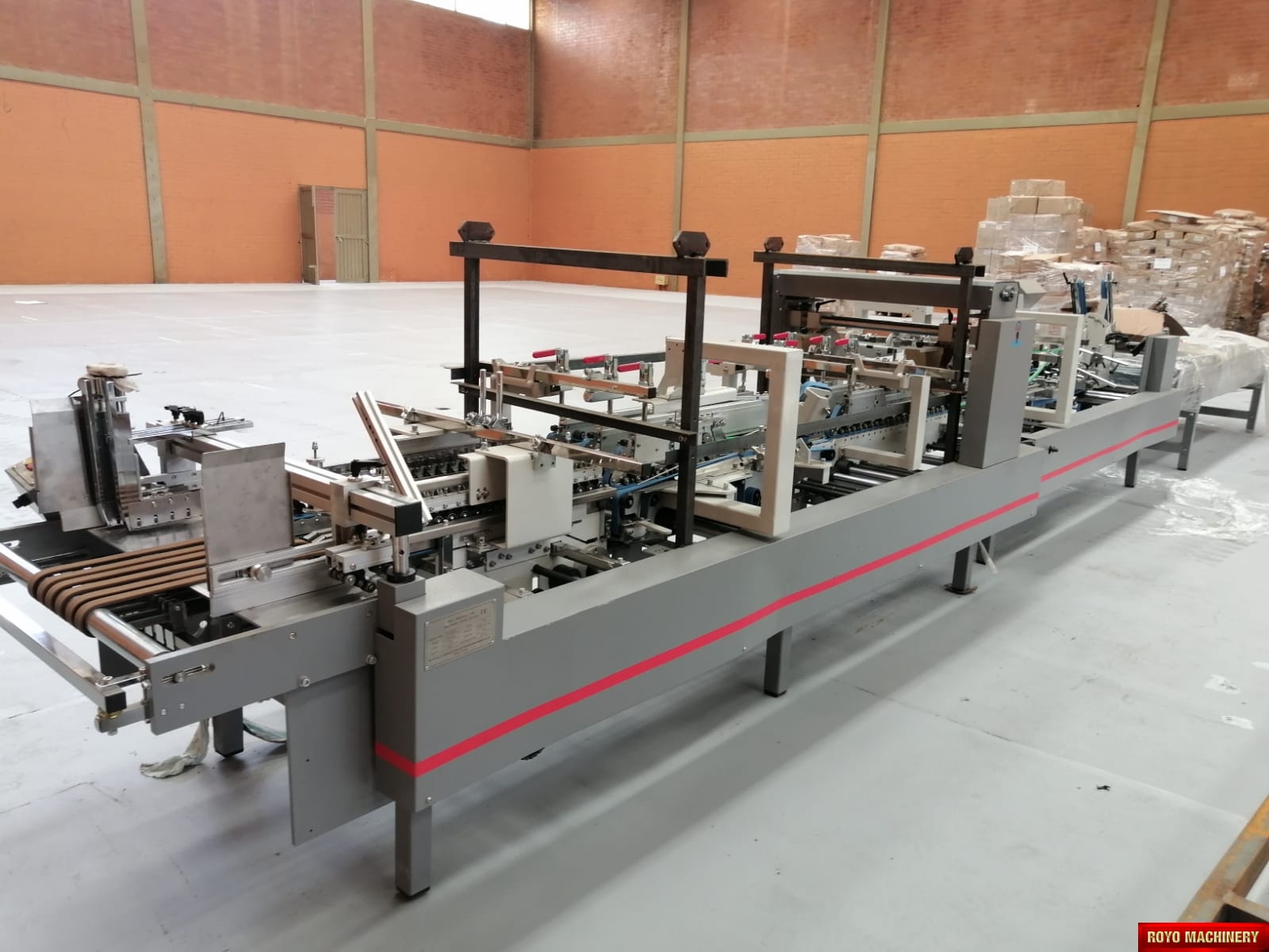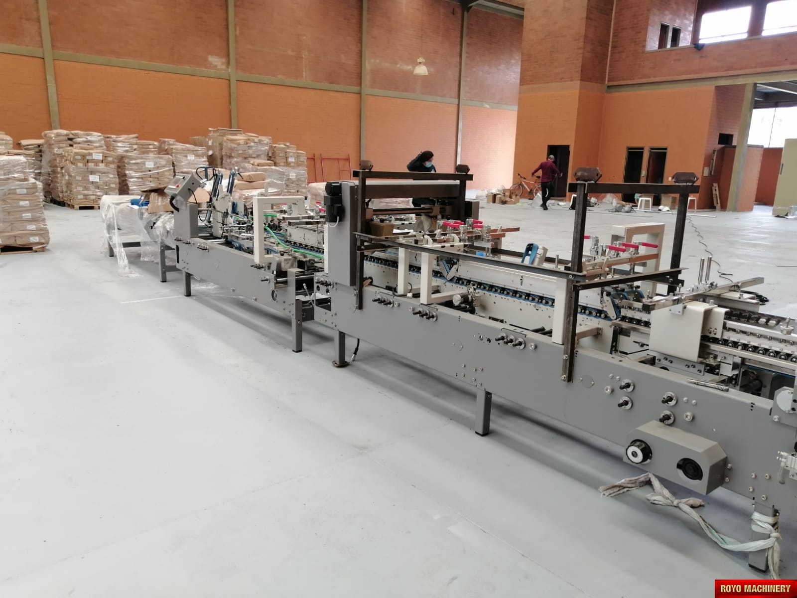 Edge-grinder, Crash lock bottom, Continuous friction feeder with variable speed, Configuration: Feeder-Pre Folding-Lock Bottom-Folding-Pressing, Carton thickness: 200-700 gsm, Weight 3.5t, Total Power: 8.1kw, Speed: 0-260m/min, Min. Box size: 75 x 80mm Side Gluing, Min. Box size: 180 x 90mm Lock Bottom, Max. Box size: 650 x 550mm Side Gluing , Max. Box size: 600 x 550mm Lock Bottom, Dimensions: 12000 x 1410 x 1600 mm, Adjustable electronic pile vibrator, Disc applied double upper gluing system, Straight Line, Side gluing: 135 degrees pre-folding for No.1 line, Lock bottom: 90 degress pre-folding for No.3 line