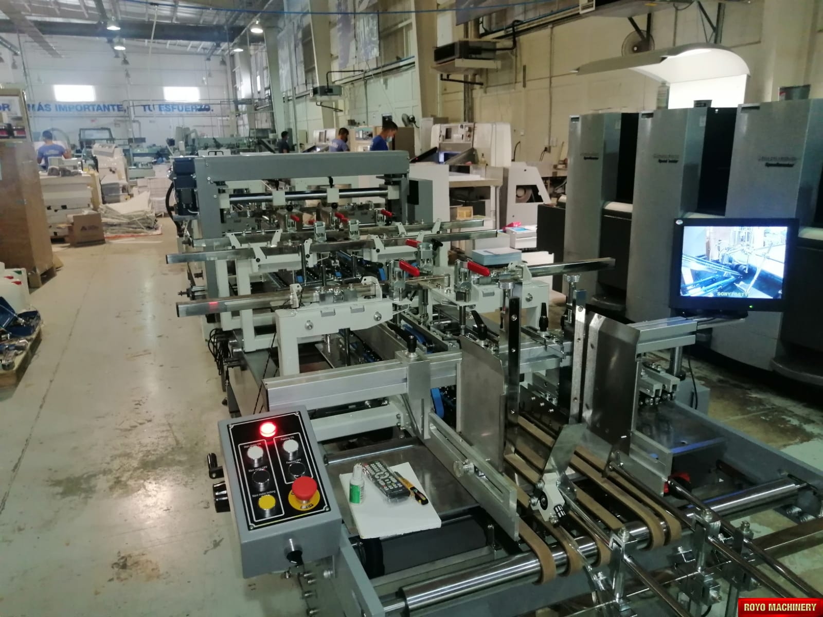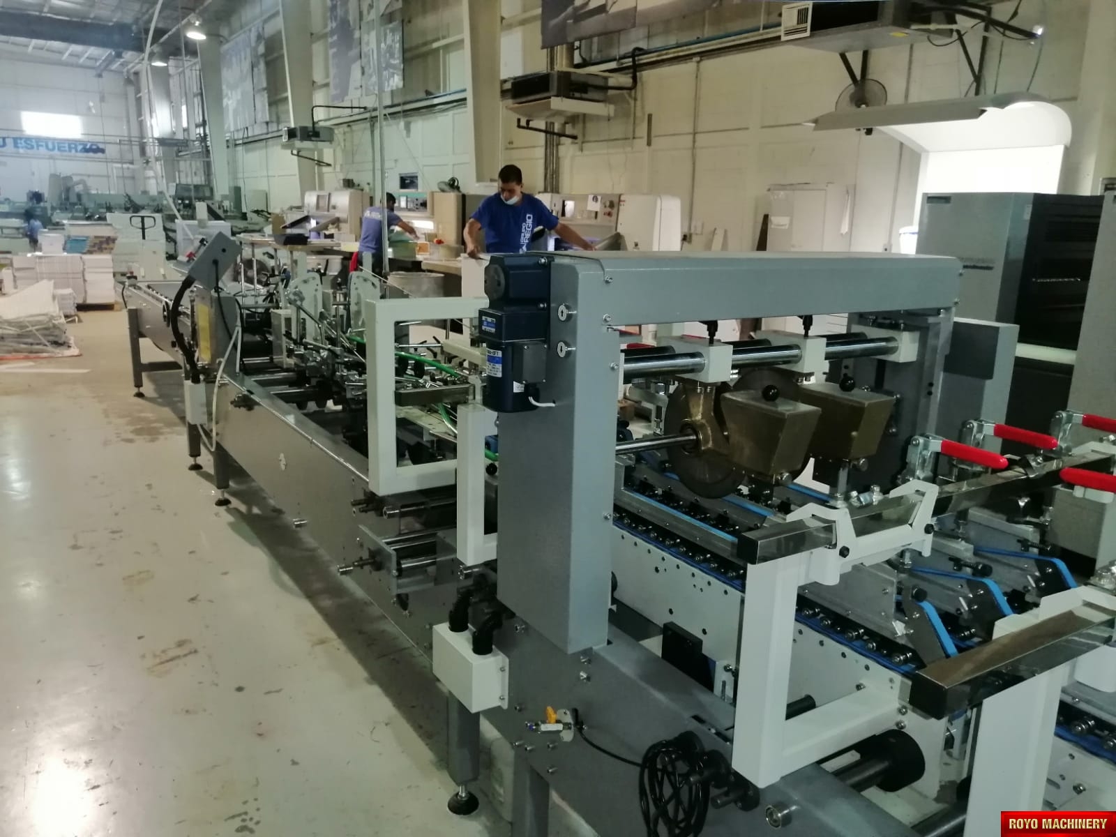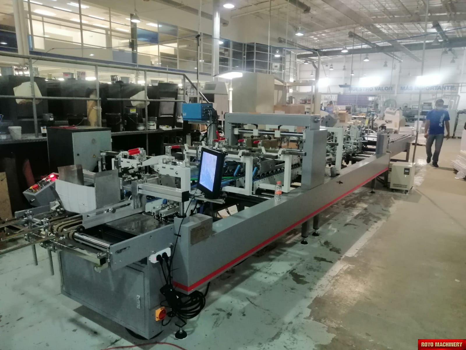 Continuous friction feeder with variable speed, Weight 4.2t, Total Power: 10.26kw, Min. Box size: 200 x 100mm Lock Bottom, Min. Box size: 75 x 80mm Side Gluing, Speed: 0-300m/min, Straight Line, Max. Box size: 800 x 550mm Side Gluing , Max. Box size: 700 x 550mm Lock Bottom, Edge-grinder, Double wall (optional), Disc applied double upper gluing system, Dimensions: 12000 x 1560 x 1600 mm, Crash lock bottom, Configuration: Feeder-Pre Folding-Lock Bottom-Folding-Pressing, Carton thickness: 200-700 gsm, Adjustable electronic pile vibrator, Side gluing: 135 degrees pre-folding for No.1 line, Lock bottom: 90 degress pre-folding for No.3 line