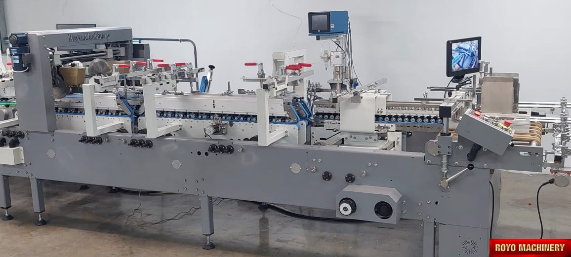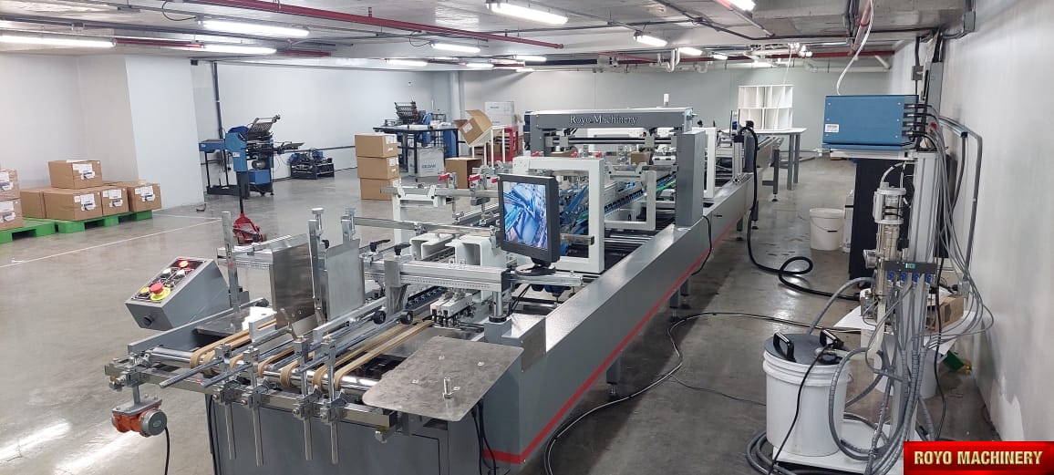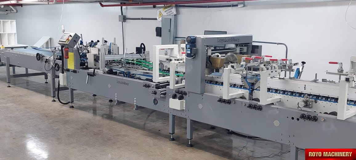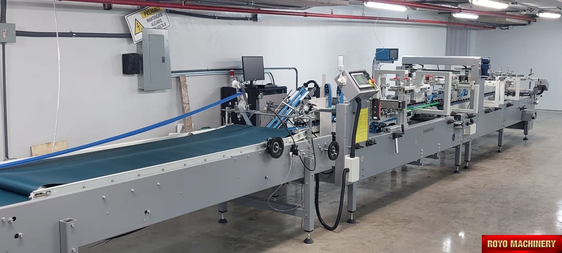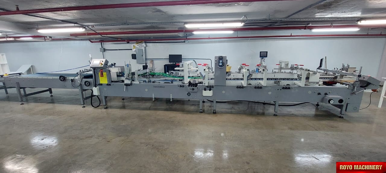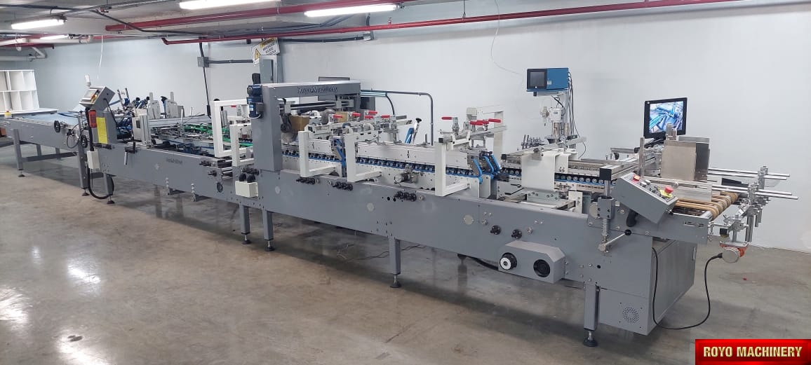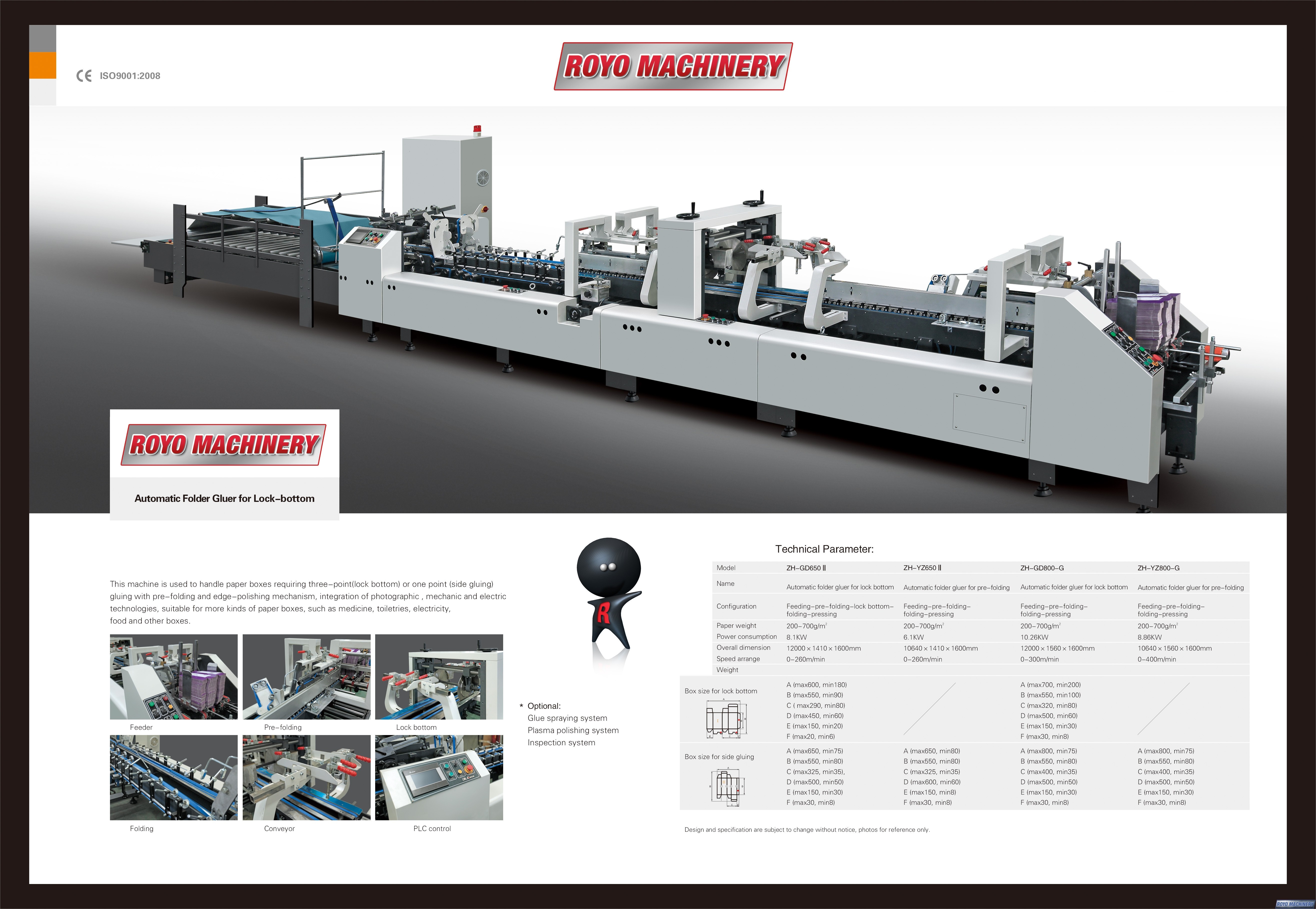 Continuous friction feeder with variable speed, Weight 4.2t, Total Power: 10.26kw, Min. Box size: 200 x 100mm Lock Bottom, Min. Box size: 75 x 80mm Side Gluing, Speed: 0-300m/min, Straight Line, Max. Box size: 800 x 550mm Side Gluing , Max. Box size: 700 x 550mm Lock Bottom, Edge-grinder, Double wall (optional), Disc applied double upper gluing system, Dimensions: 12000 x 1560 x 1600 mm, Crash lock bottom, Configuration: Feeder-Pre Folding-Lock Bottom-Folding-Pressing, Carton thickness: 200-700 gsm, Adjustable electronic pile vibrator, Side gluing: 135 degrees pre-folding for No.1 line, Lock bottom: 90 degress pre-folding for No.3 line