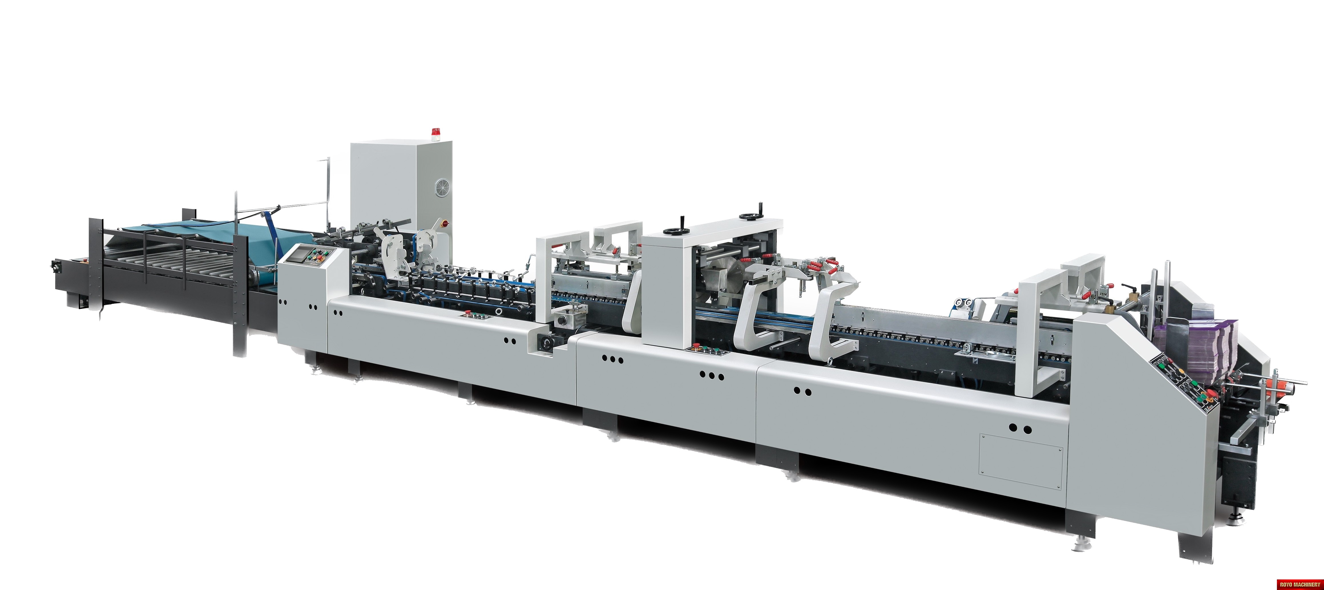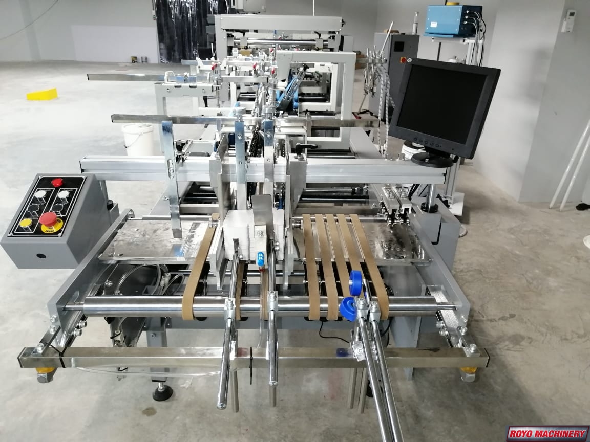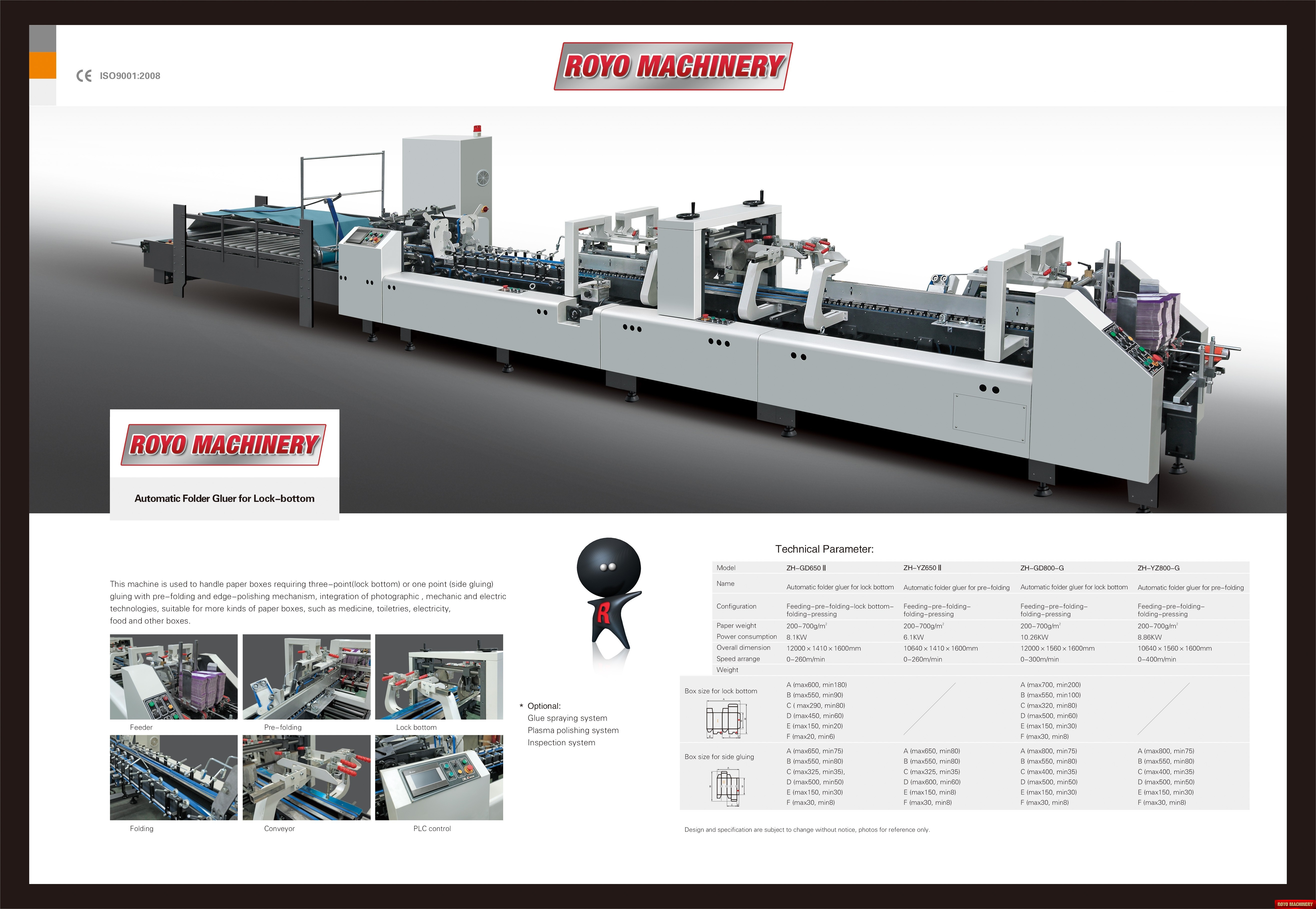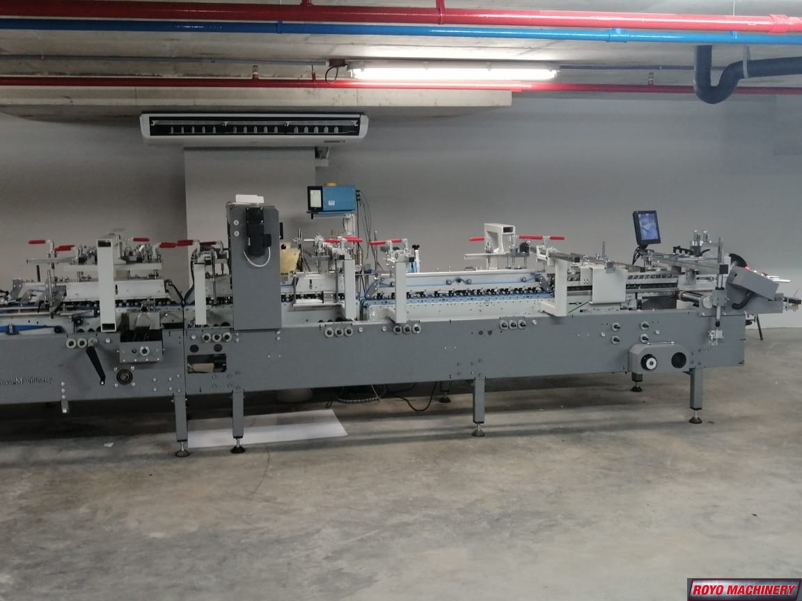 Straight Line, Speed: 0-260m/min, Two adjustable front feed knives , Max. Box size: 650 x 550mm Side Gluing , Edge-grinder, Small box attachment, Continuous friction feeder with variable speed, Carton thickness: 200-700 gsm, Adjustable electronic pile vibrator, Side gluing: 135 degrees pre-folding for No.1 line, Third crease line pre-folder up to 135 degrees, Suggested HS Code: 8441.30.9000, Lock bottom: 90 degress pre-folding for No.3 line, Disc applied double upper gluing system, Crash lock bottom, Corrugated flute type: N F E, Air Pressure Required: 6 Bars, Two upper and two lower carriers, Max. Box size: 600 x 550mm Lock Bottom, Total Power: 8.1kw, Dimensions: 12000 x 1410 x 1600 mm, One lower (left side) gluing tank, Min. Box size: 75 x 80mm Side Gluing, Min. Box size: 180 x 90mm Lock Bottom