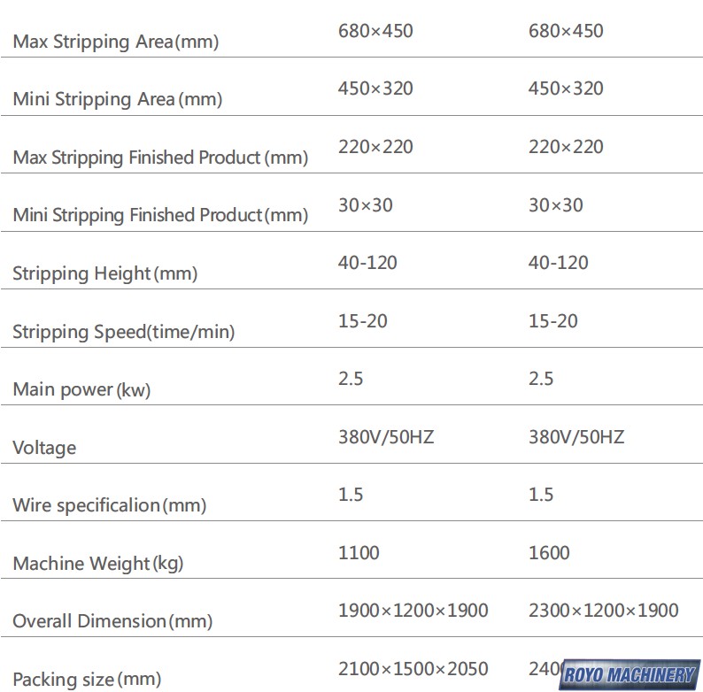 Stripping Speed: 15-20 Strokes per minute, Stripping Height: 1.6" - 4.7", Min. Stripping Finished Product: 1.25" x 1.25", Min. Stripping Area: 450x320mm, Max. Stripping Area: 700x500mm, Weight: 1600 kg, Power: 4 kW, Max. Stripping Finished Product: 220x220mm, Dimensions: 2450 x 1600 x 1900 mm
