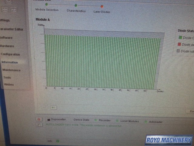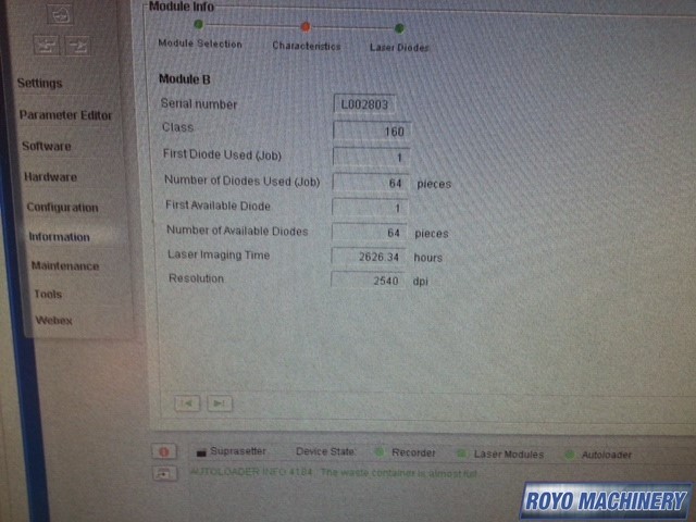 Stacker, Resolution: 2400/2540 dpi, Plate thickness: 0.006" to 0.012", Min. plate size: 14.57" x 12.72", Max. plate size: 26.77" x 29.53", Thermal, 30 Plates per hour , Connection Kit and Cable, Metashooter , Online Processor, Includes RIP processor and software, 830nm IR sensitive thermal aluminum plates, Wash up unit, Single Cassette Loader, Aluminum thermal plates