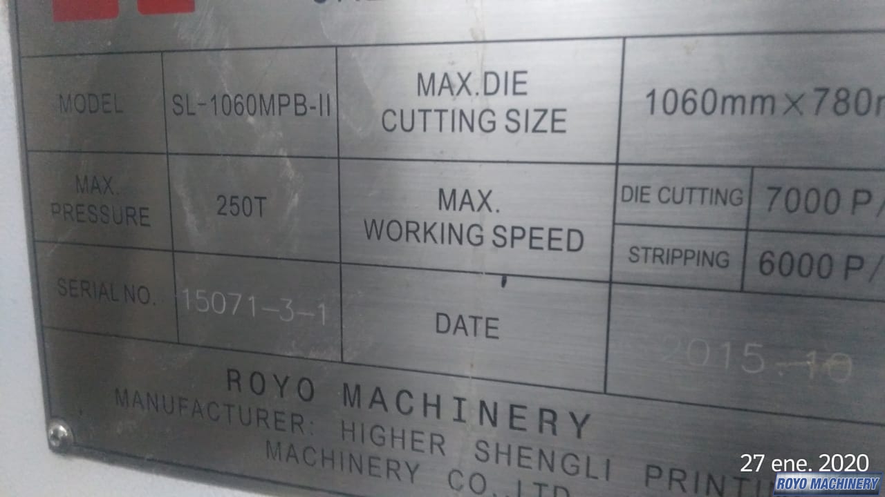 Paper or cardboard thickness: 100-2000 gsm, Dimensions: 5890 x 2790 x 2060 mm, Min. Paper size: 450 x 360mm, Max. die cutting size 1070 x 790mm, Max. die cutting size 1060 x 780mm, Max. Speed: 7500 strokes per hour, Central lubrication with auto pump , Min. gripper margin: 5mm, Max. Speed with stripping: 6500 strokes per hour , Voltage: 220V 3PH 60Hz, Total Power: 21kw, Delivery Pile Height 1350 mm, Feeding Pile Height: 1600mm, Die cutting Precision: +/- 0.15mm, Total Weight: 21 Tons, Corrugated board up to 4mm