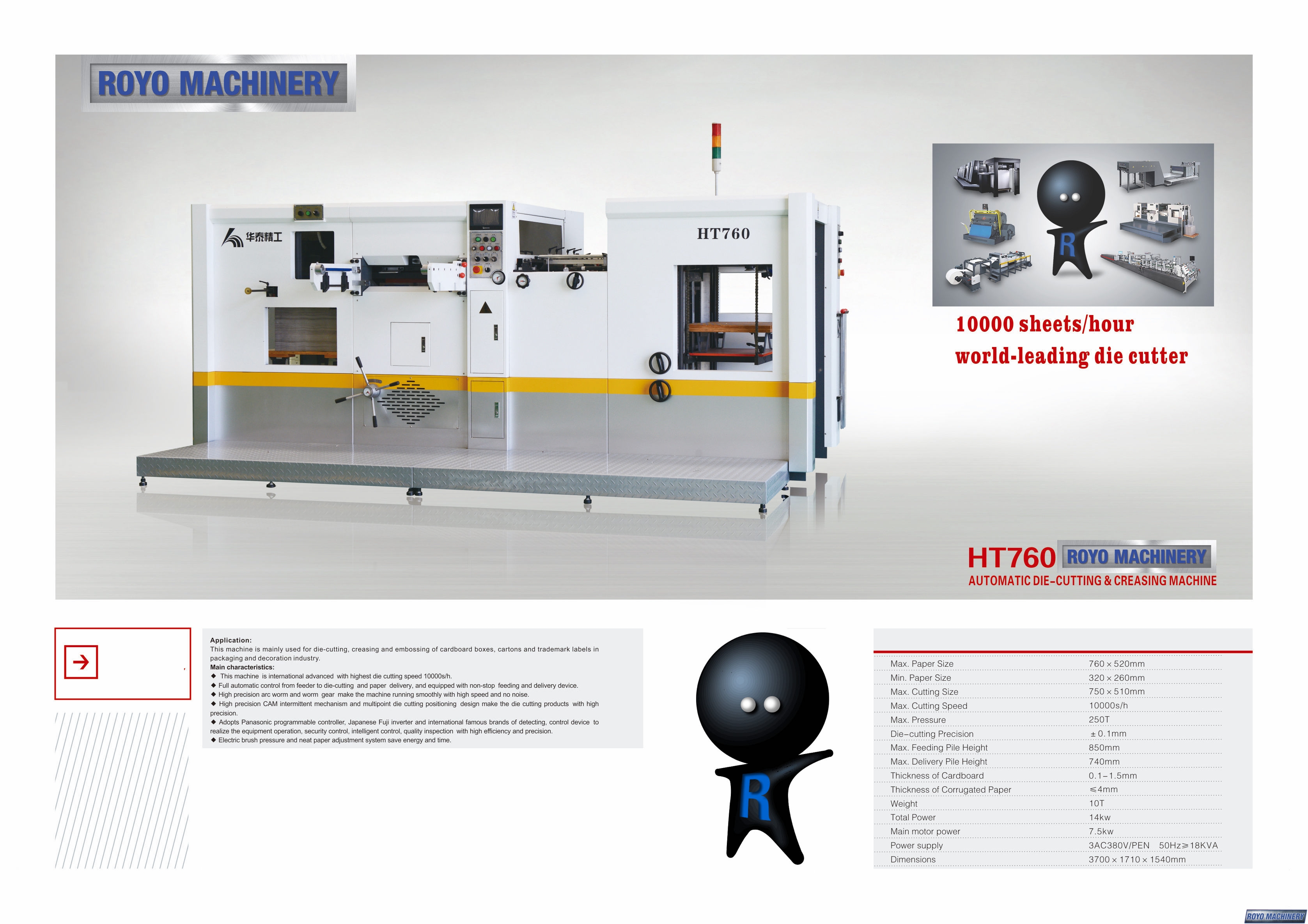 Central lubrication with auto pump , Max. die cutting pressure: 250 Tons, Total Power: 14kw, Max. Speed: 10000 strokes per hour, Die cutting Precision: +/- 0.15mm, Max. paper size: 760 x 520mm, Inner chase size: 765 x 530mm, Voltage: 220V 3PH 60Hz, Total Weight: 10 Tons, Feeding Pile Height: 1050mm, Paper or carboard thickness: 0.15-1.5 mm, Non-stop feeder and delivery, CE Standard Machine, Max. die cutting size: 750 x 520mm, Dimensions: 3700 x 2700 x 1740 mm, Delivery Pile Height: 940 mm, Corrugated board up to 4mm, Automatic pressure adjustment