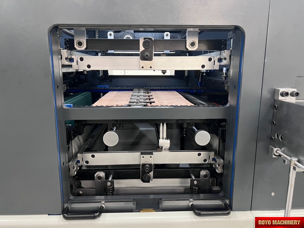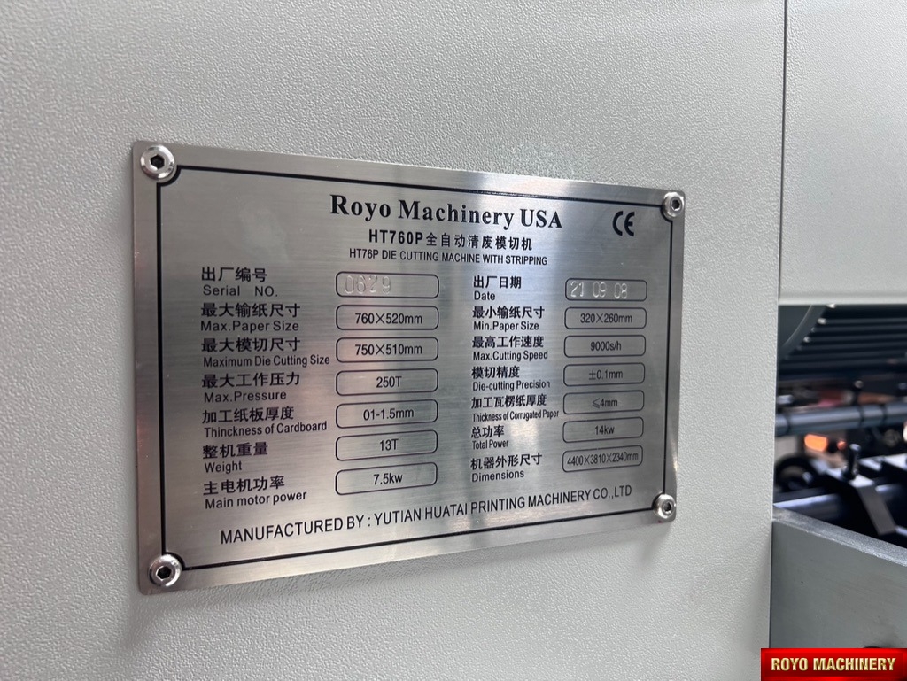 Total Power: 16.9kw, Min. Paper size: 320 x 260mm, Max. paper size: 760 x 520mm, Max. die cutting size: 750 x 520mm, Max. die cutting pressure: 250 Tons, Inner chase size: 765 x 530mm, Die cutting Precision: +/- 0.15mm, Delivery Pile Height: 940 mm, Corrugated board up to 4mm, Central lubrication with auto pump , CE Standard Machine, Paper or cardboard thickness: 100-2000 gsm, Non-stop feeder and delivery, Feeding Pile Height: 1050mm, Automatic pressure adjustment, Min. gripper margin: 7 mm, Min. distance to 1st rule: 12 mm, Max. Speed: 9000 strokes per hour, Max. Speed with stripping: 9000 strokes per hour