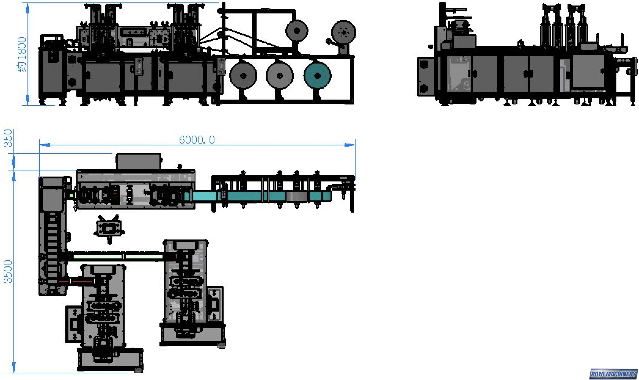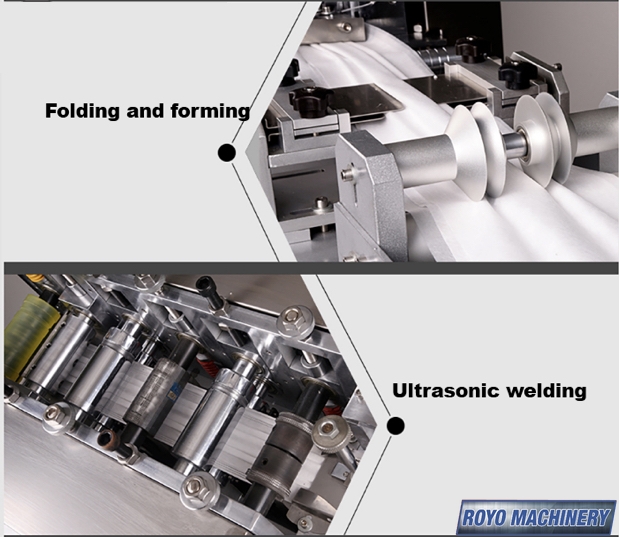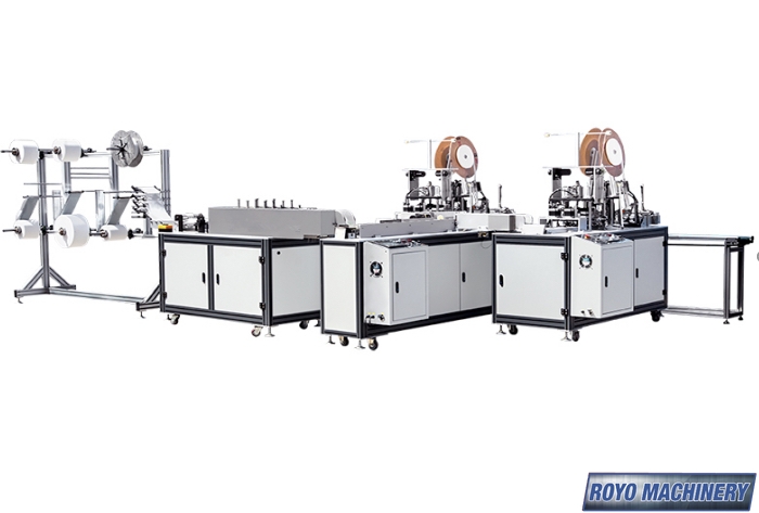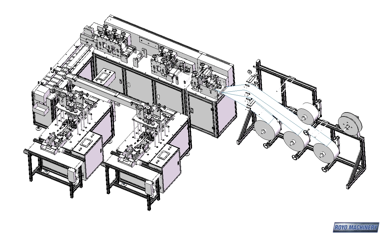 Total Weight: 1.5 Tons, Total Power: 10kw, Sealing Ultrasonic Frequency: 20KHZ, Production Capacity: 120-150 Pieces per min, Nonwovens fabric White + Blue + Melt blown Microfiber, Moldable steel/plastic nose-clip, Ear-loop Material: Terylene or similar, Mask Layers: 2-4 layers, Elastic band ear-loop, Dimensions: 6500 x 4500 x 2000 mm, Mask Size: 175 x 95 mm (Customizable), White Nonwoven: Roll Size 20cm Width x 60cm Diameter, Suggested Materials: 3 Layers: 28GSM PP + 20GSM MB + 20GSM PP, Nose Clip: White recovered steel 5mm x 80 cm length , Melt Blown Microfiber: Roll size 17.5cm width x 60cm diameter, Elastic Band Ear-Loop: 3mm round, Blue Nonwoven Fabric: Roll size 17.5cm width x 60cm diameter