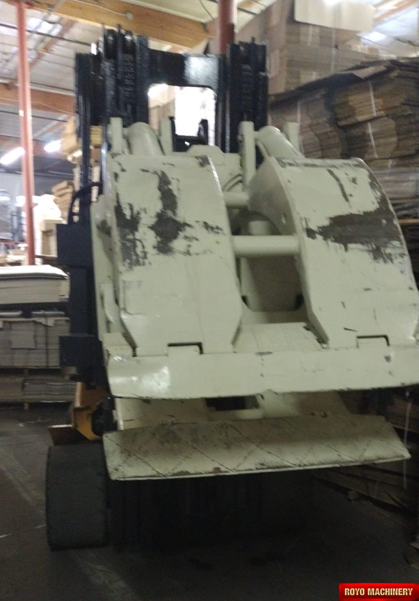 Max. Fork Height: 160'', Truck Weight: 18600 lbs, Propane, Lowered Mast/Lift Height: 81'' - 90'', Cushion Tires, Side Shift, Paper roll clamp