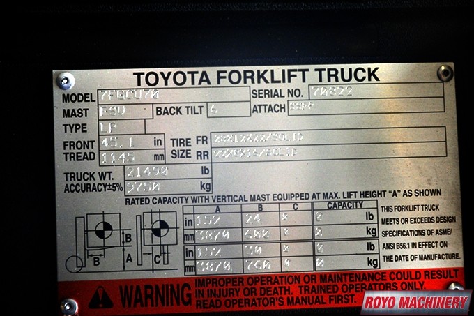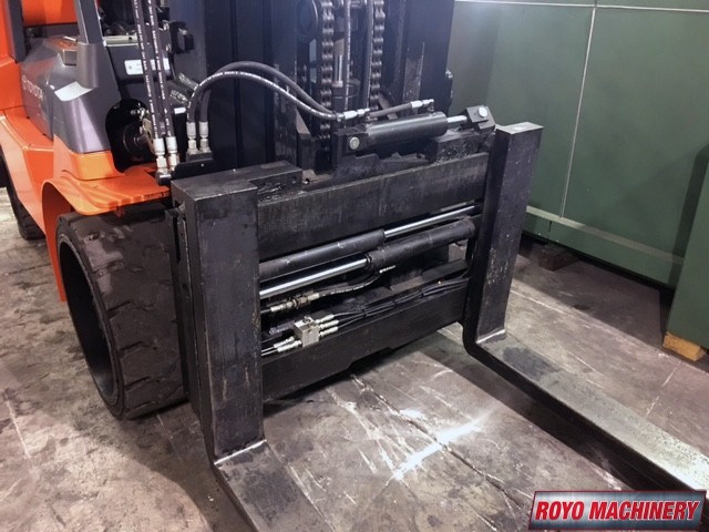 Triple Mast, Truck weight: 21490 lbs, Tire Type: Solid, Mast type: FSV, Forks: 96", Rated Capacity: 13250 lbs, Hydraulic side shift, Propane, Max. Capacity: 18000 lbs, Free Lift, Hydraulic Fork positioner, Cushion Tires