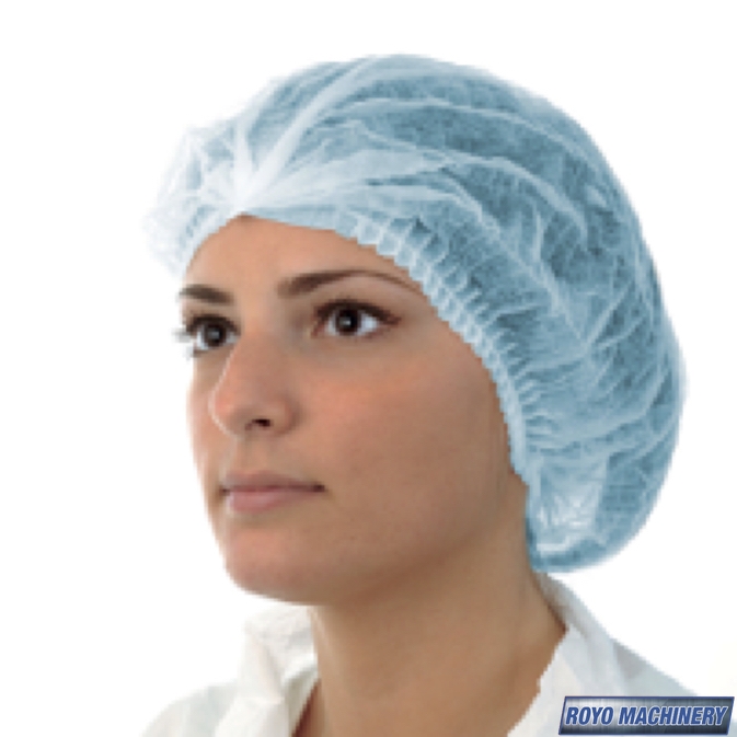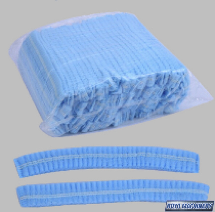 Ultrasonic welding, Type of product: Disposable head cover bouffant or hair net, Total Weight: 1055 kg, Roll Size & Material: 10-20gsm Nonwoven 18.9", Production speed: 100-130 pieces/min, Nonwoven yield: 300 pieces per kilo, Material: PP Non-woven fabrics, Elastic Band: 4mm round, Elastic band yield: 1900 pieces per kilo, Elastic band feeder, Dimensions: 3800 x 800 x 1000 mm