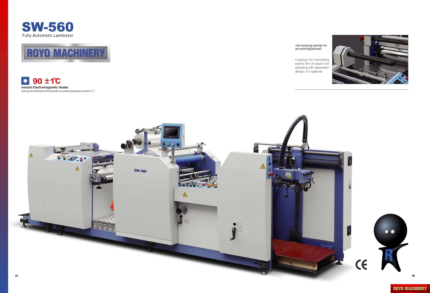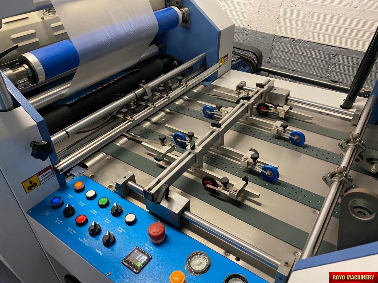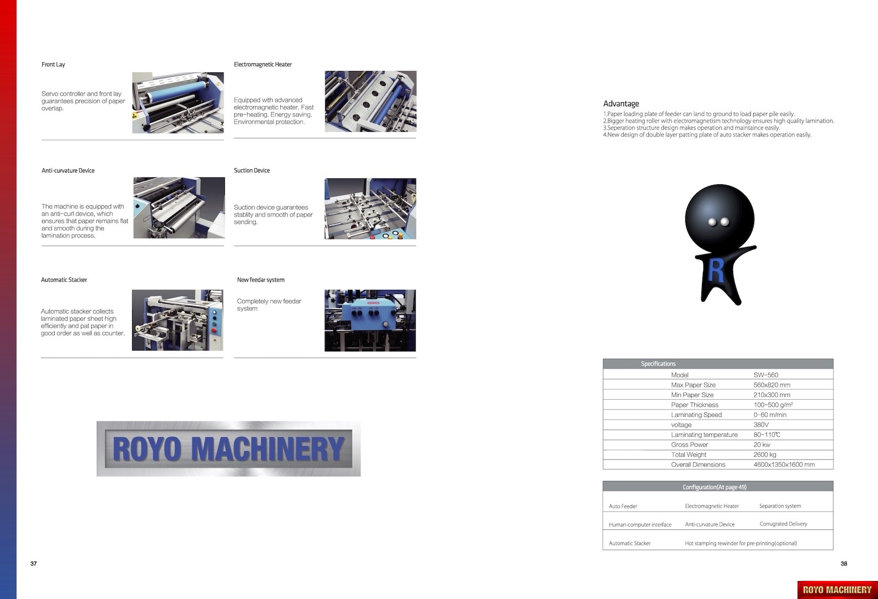 Sheet separator, Sheet decurler, Electromagnetic heater, Total Weight: 2600kg, Voltage: 220V 60/50HZ, Total Power: 20kw, Stacker (Optional), Paper thickness: 105-500 gsm, Min. Paper size: 210 X 300mm, Max. Paper size: 560 x 820mm, Laminating Temperature: 80-110 C, Laminating Speed: 0-60m/min, Dimensions: 4600 x 1350 x 1600 mm, Delivery table with jogger, Suggested HS code: 8420.10.0090