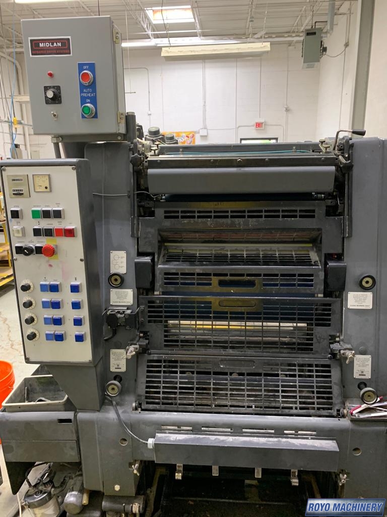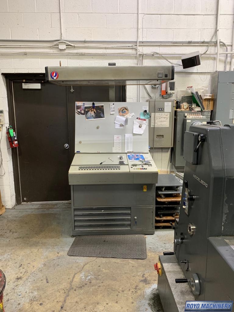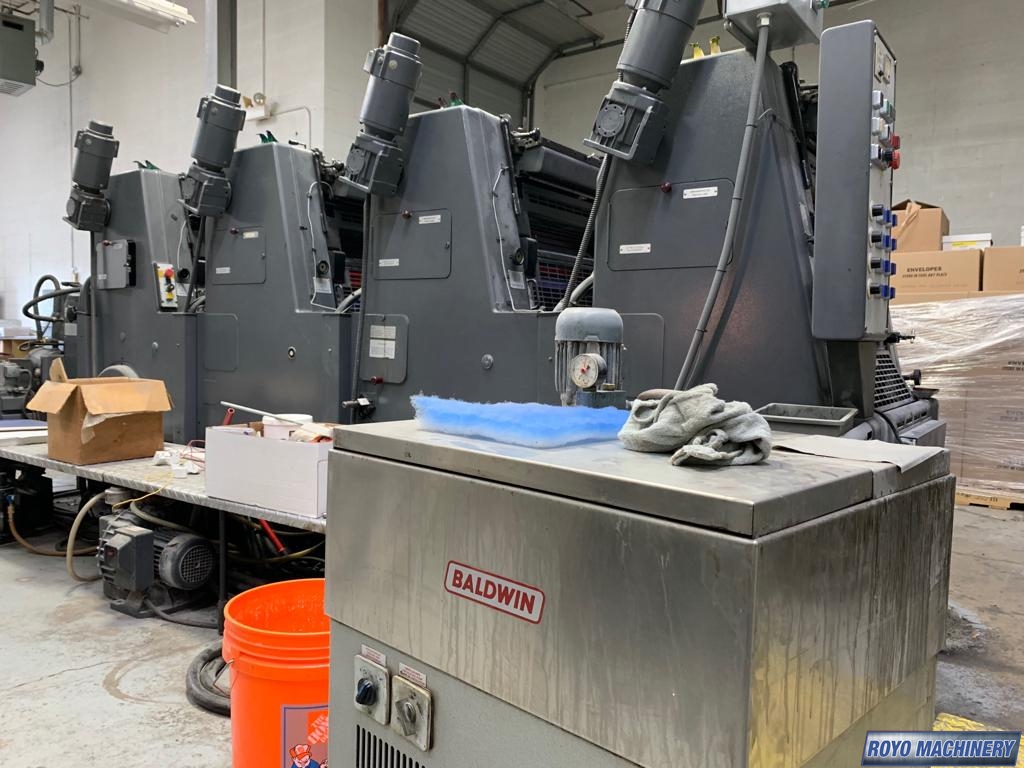 Powder Spray, Single Sheet Feeder, Quick action plate clamps, Low pile delivery, CPC 1.02, Bacher pin register on clamps, Alcolor Dampening, 8000 sph, Baldwin Refrigerated Recirculator