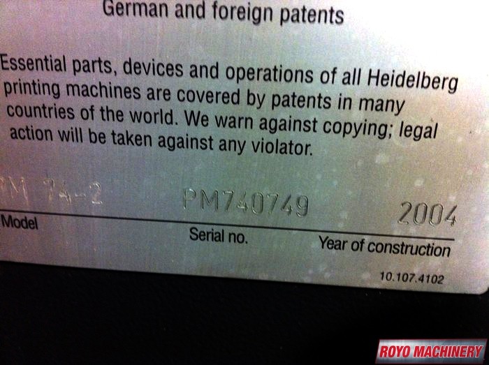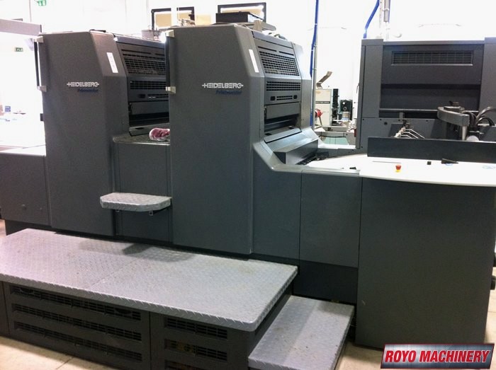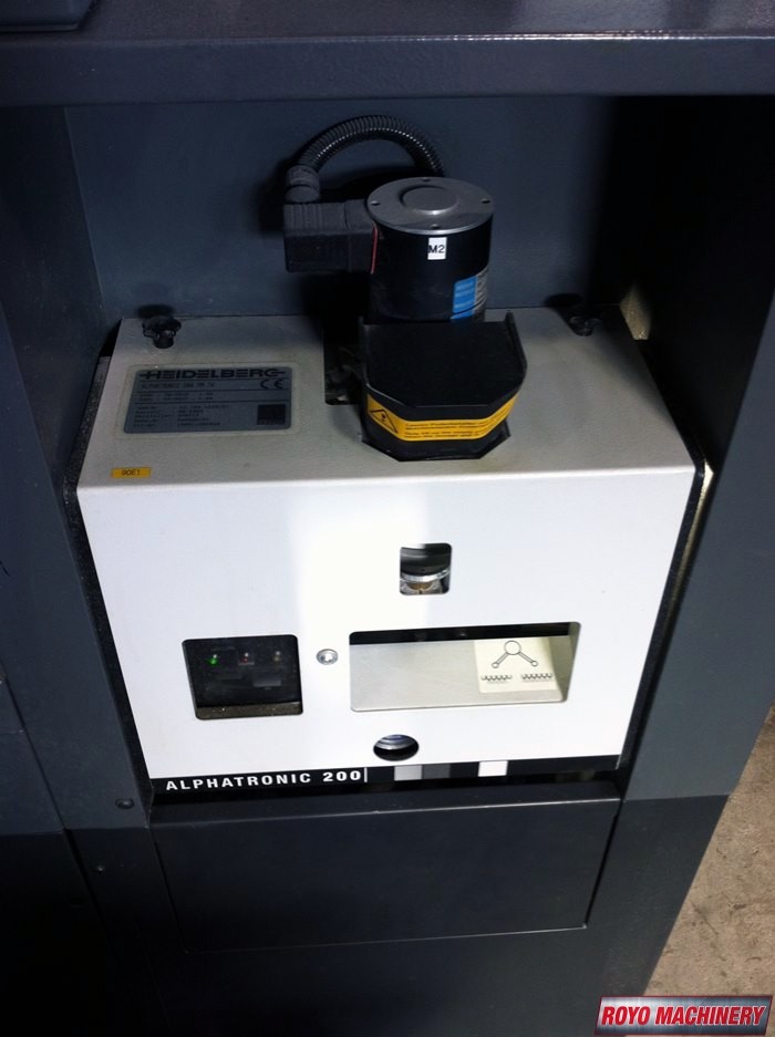 Suction Tape on Feeder, Stream Feeder, Low pile delivery, Grafix Alphatronic 200 powder spray, Double sheet detector, Diagonal Register, Classic center, C Format: 53 x 74 cm, Baldwin Refrigerated Recirculator, Bacher pin register on clamps, Autoplate, Automatic Blanket Roller and Impression Cylinder Wash, Alcolor Dampening, 15000 sph