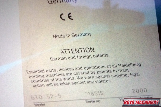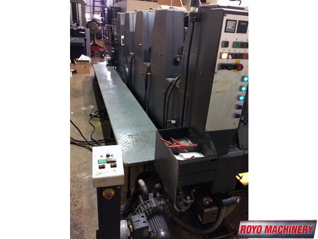 Single Sheet Feeder, Segmented ink blades, Royse Refrigerated Recirculator, Quick action plate clamps, Powder Spray, Low pile delivery, IR Dryer, Double sheet detector, DDS Dampening, Bacher pin register on clamps, 8000 sph, Weko powder spray