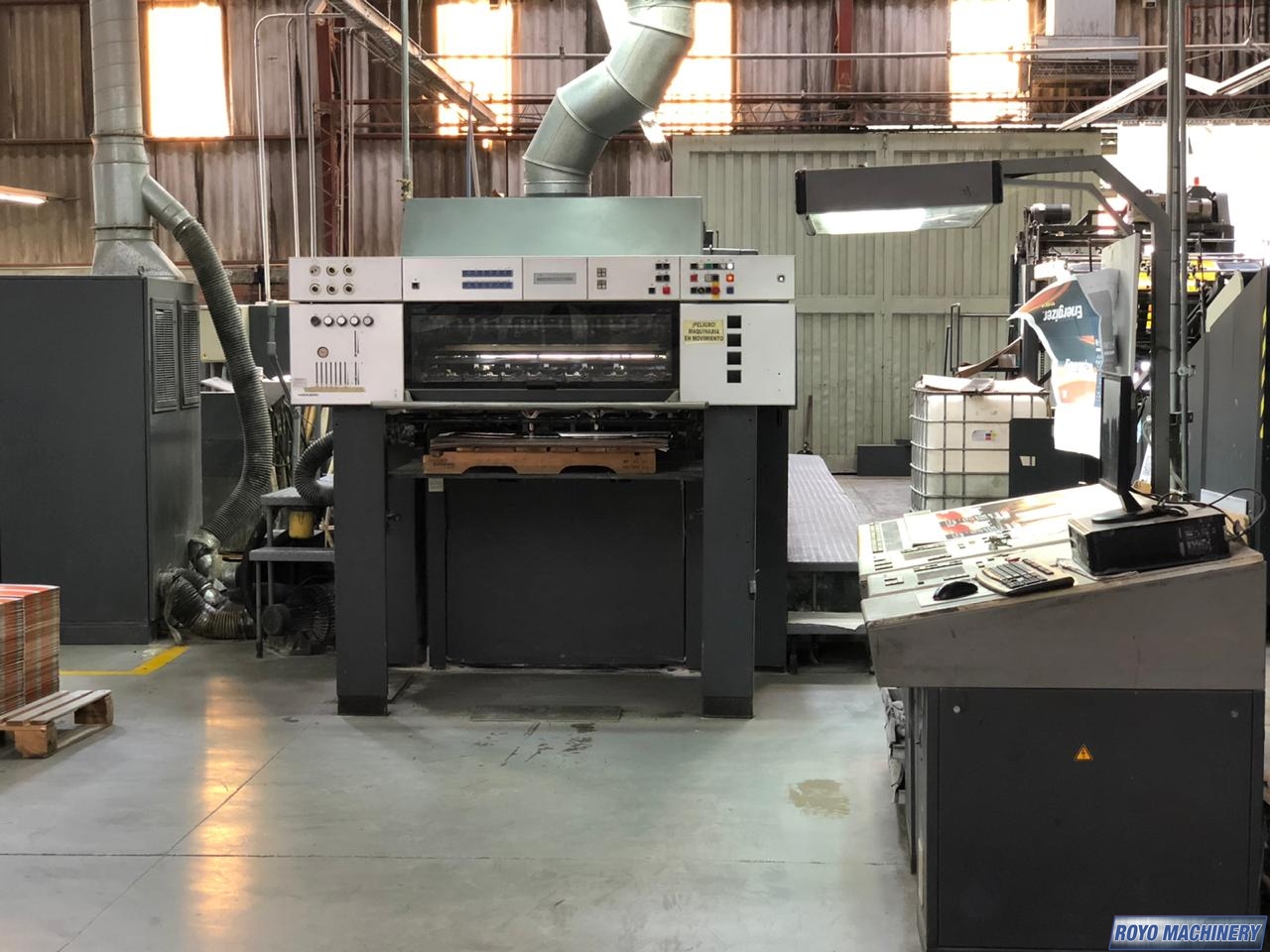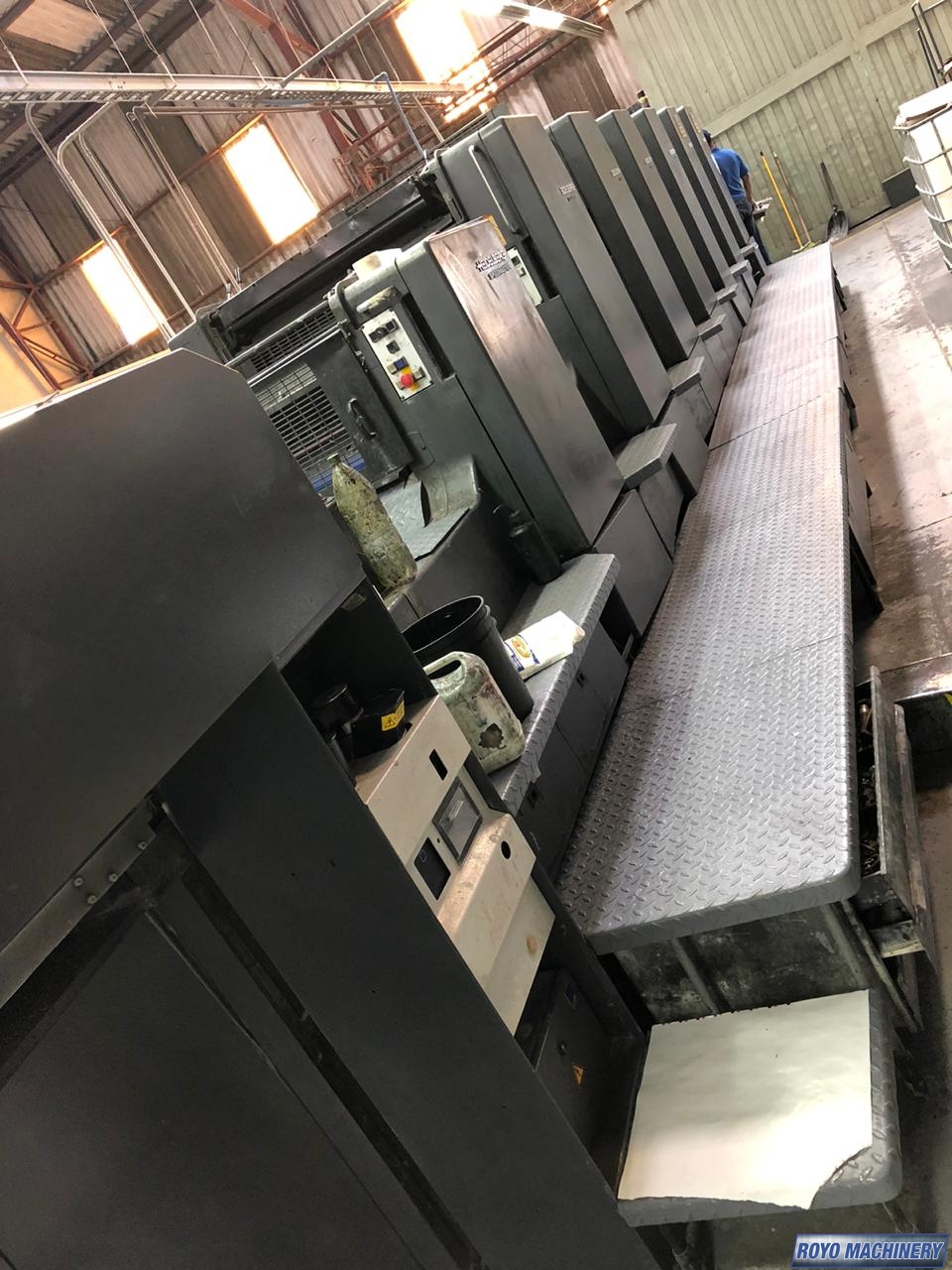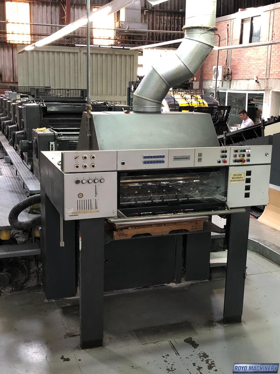 Pre-loader, Preset, Steel plate in feeder, Non-stop feeder, Non-stop delivery, In-line coater, IR Dryer, High pile delivery, Grafix Alphatronic 400 powder spray, Electronic sidelay control, Preset Feeder, Double sheet detector, Sheet Decurler, Steel plate in delivery, Royse Refrigerated Recirculator, Diagonal Register, CPTronic, CPC 1.04, Chain delivery, Autoplate, Automatic Blanket Roller and Impression Cylinder Wash, Alcolor Dampening, 15000 sph