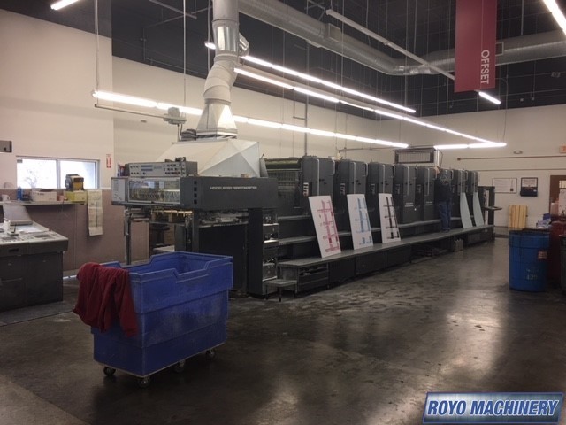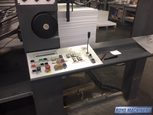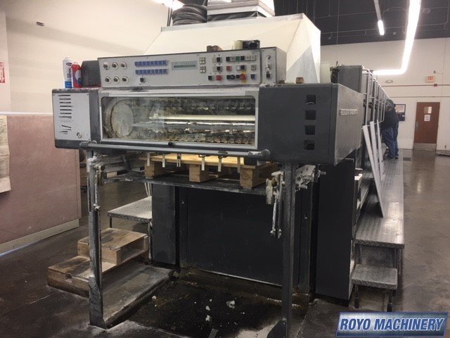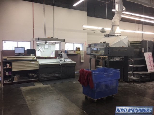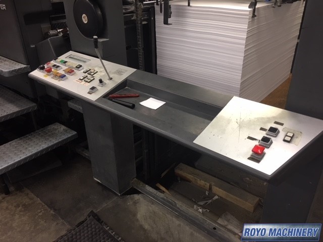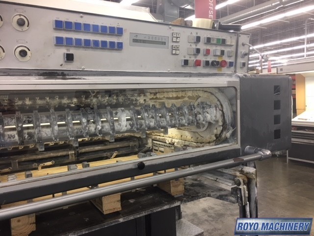 Stream Feeder, Steel plate in feeder, High pile delivery, Grafix Exatronic powder spray, Double sheet detector, Diagonal Register, CPTronic, Bacher pin register on clamps, Autoplate, Automatic Blanket and Roller Washer, Non-stop delivery, Steel plate in delivery, Royse Refrigerated Recirculator, Preset, CPC 1.03, Alcolor Dampening, 13000 sph