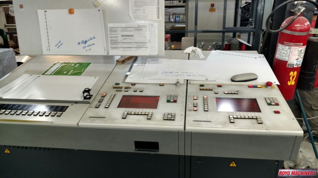 Suction Tape on Feeder, Stream Feeder, Technotrans Refrigerated Recirculator, Grafix powder spray, Low pile delivery, Double sheet detector, Diagonal Register, CPTronic, CPC 1.04, Bacher pin register on clamps, Autoplate, Automatic Blanket Roller and Impression Cylinder Wash, Alcolor Dampening, 15000 sph, Like new condition, Light pen & smart card reader