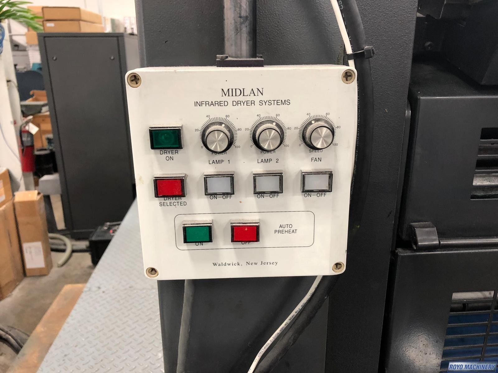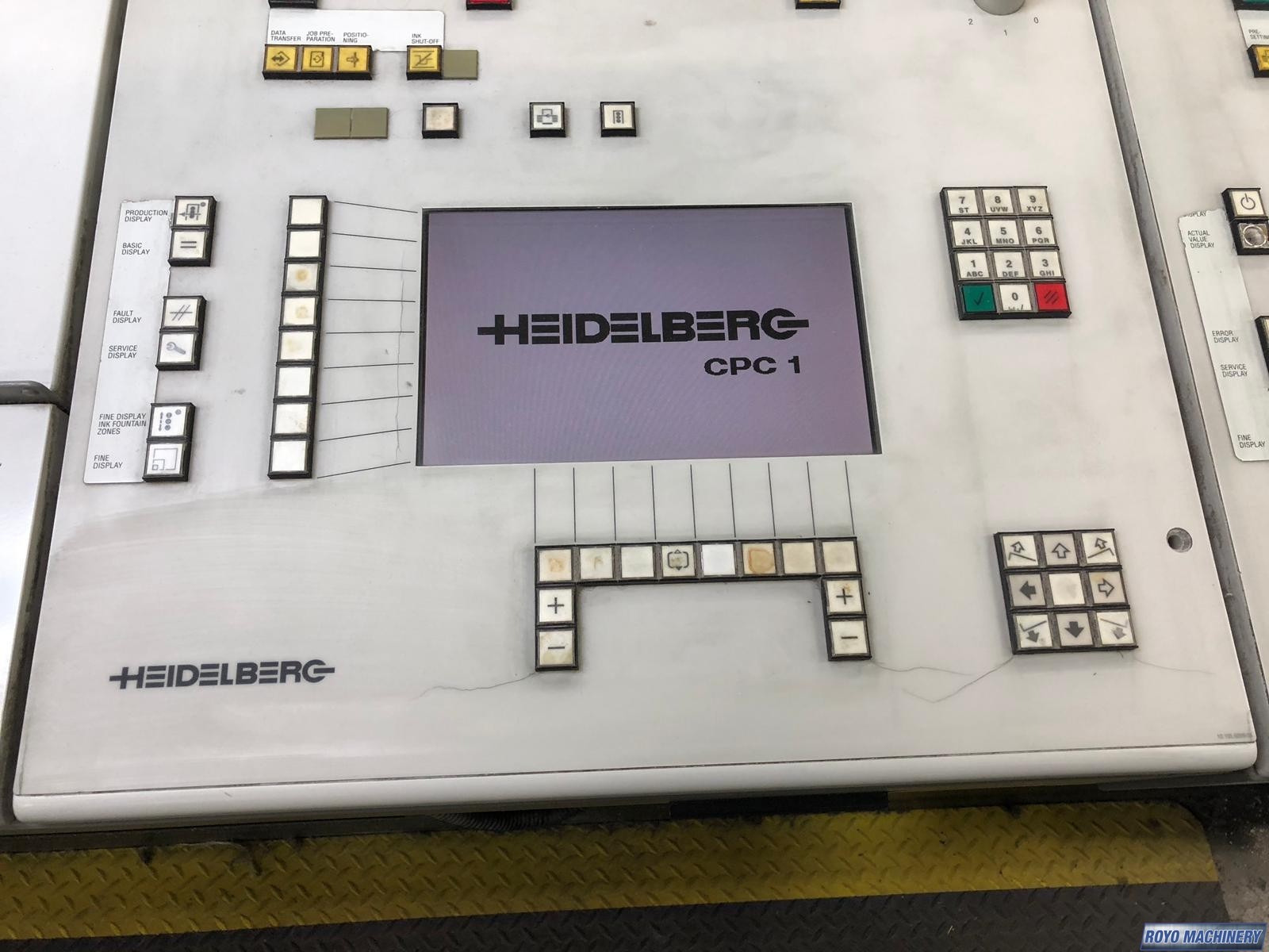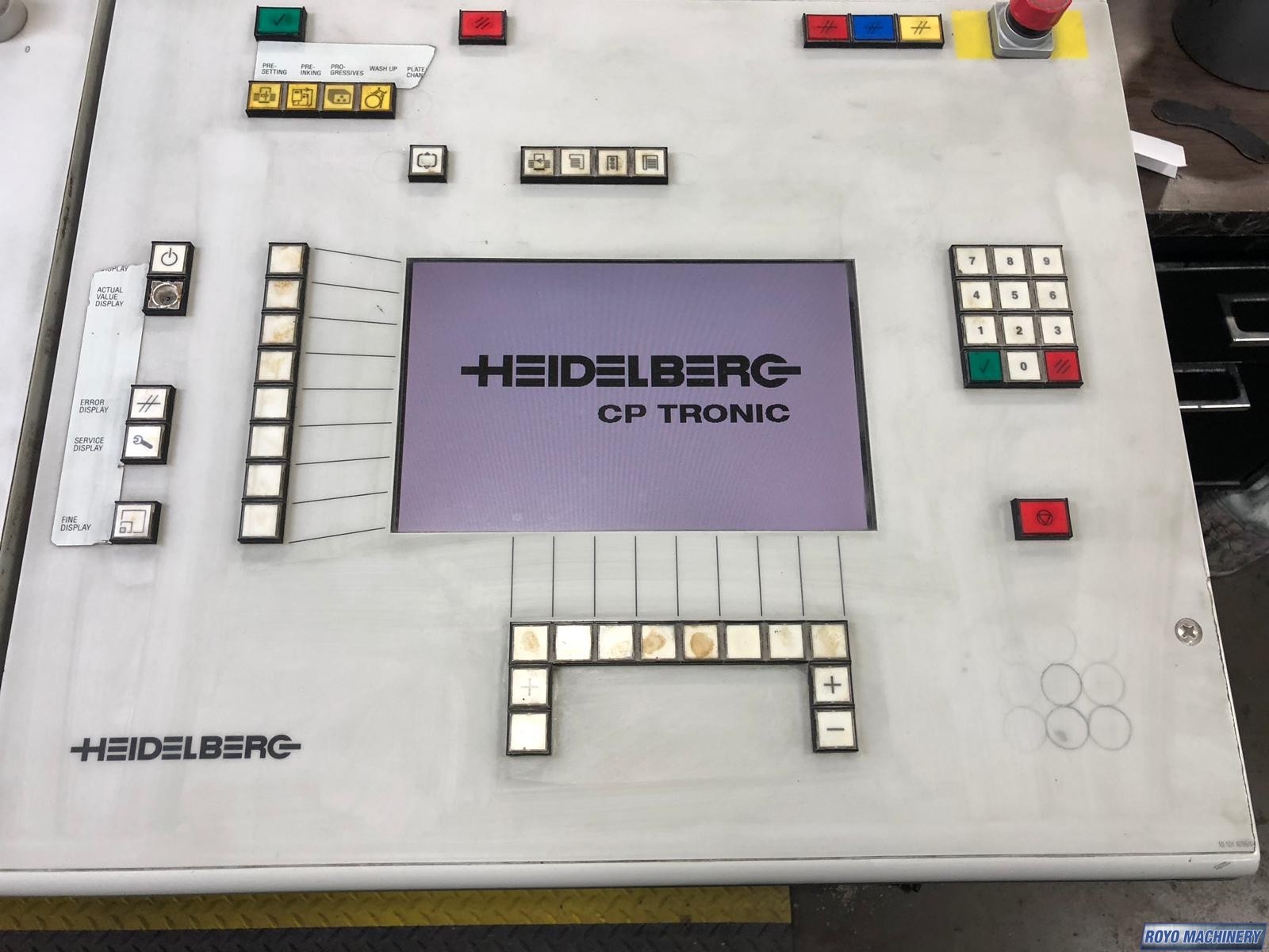 Suction Tape on Feeder, Stream Feeder, Electronic sidelay control, Preset, Preset Feeder, Low pile delivery, Double sheet detector, Diagonal Register, Automatic Blanket Roller and Impression Cylinder Wash, Silver Series Machine, Bacher pin register on clamps, Autoplate, Mediprint Spray Powder Unit, Alcolor Dampening, 15000 sph, Technotrans Refrigerated Recirculator, CPTronic, CPC 1.04