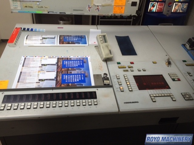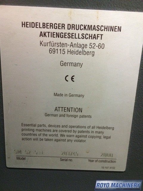Stream Feeder, Diagonal Register, Ink temperature control, Double sheet detector, Royse Refrigerated Recirculator, Automatic Blanket Roller and Impression Cylinder Wash, Electronic sidelay control, Extended delivery, Bacher pin register on clamps, Heidelberg DryStar IR Dryer, Grafix powder spray, 15000 sph, Non-stop delivery, Non-stop feeder, High pile delivery, Hot air knife, Suction Tape on Feeder, Chrome Blanket Cylinders, CPC 1.04, Preset, In-line coater, CPTronic, Autoplate, Silver Series Machine, Alcolor Dampening