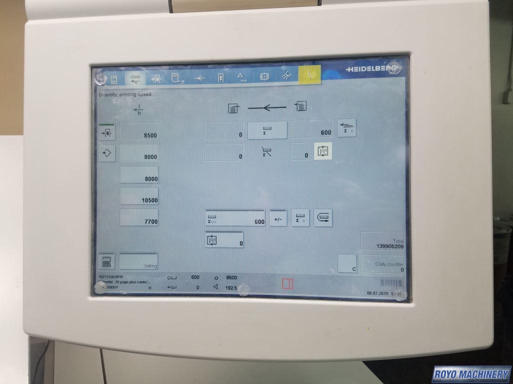 Stream Feeder, Diagonal Register, Heidelberg DryStar IR Dryer, Suction Tape on Feeder, Steel plate in feeder, Steel plate in delivery, Preset, In-line coater, Silver Series Machine, Technotrans Refrigerated Recirculator, Electronic sidelay control, Double sheet detector, Bacher pin register on clamps, 15000 sph, Sheet Decurler, High pile delivery, Alcolor Dampening, Grafix powder spray, Preset Feeder