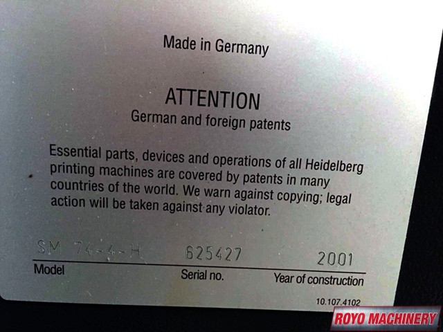 Technotrans Refrigerated Recirculator, Suction Tape on Feeder, Stream Feeder, Steel plate in delivery, Preset Link, Sheet Decurler, Preset, High pile delivery, Grafix powder spray, Double sheet detector, Electronic sidelay control, Diagonal Register, CP2000, Chrome Plate Blanket & Impression Cylinder, C Format: 53 x 74 cm, Bacher pin register on clamps, Autoplate, Automatic Blanket Roller and Impression Cylinder Wash, Anti-static Device, Alcolor Dampening, 15000 sph, Heidelberg WashStar