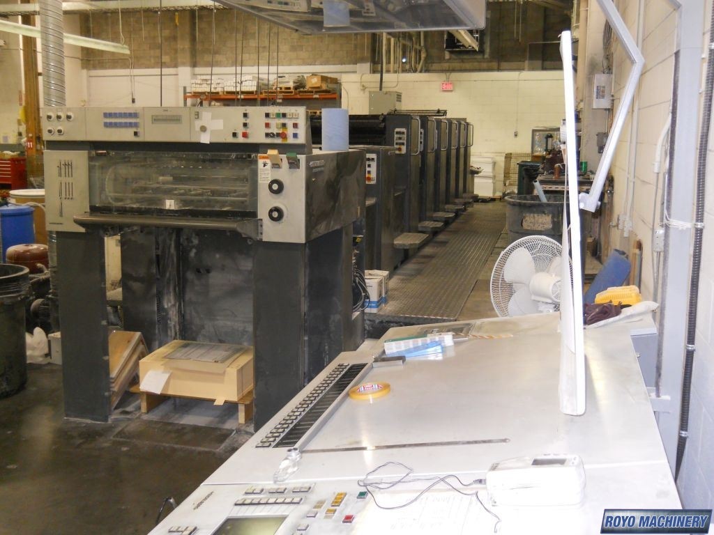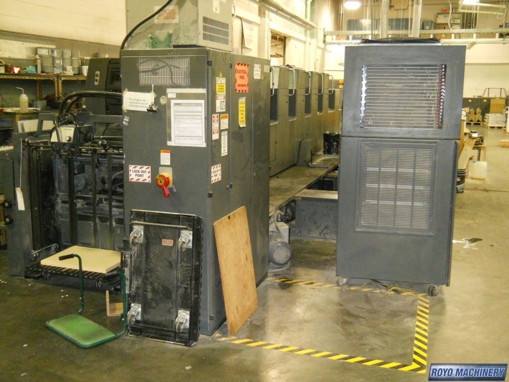 Steel plate in delivery, Royse Refrigerated Recirculator, Grafix powder spray, Baldwin Refrigerated Recirculator, Stream Feeder, In-line coater, High pile delivery, Grafix IR Dryer, Preset, CPTronic, CPC 1.04, Diagonal Register, Bacher pin register on clamps, Autoplate, Suction Tape on Feeder, Alcolor Dampening, 15000 sph, Double sheet detector