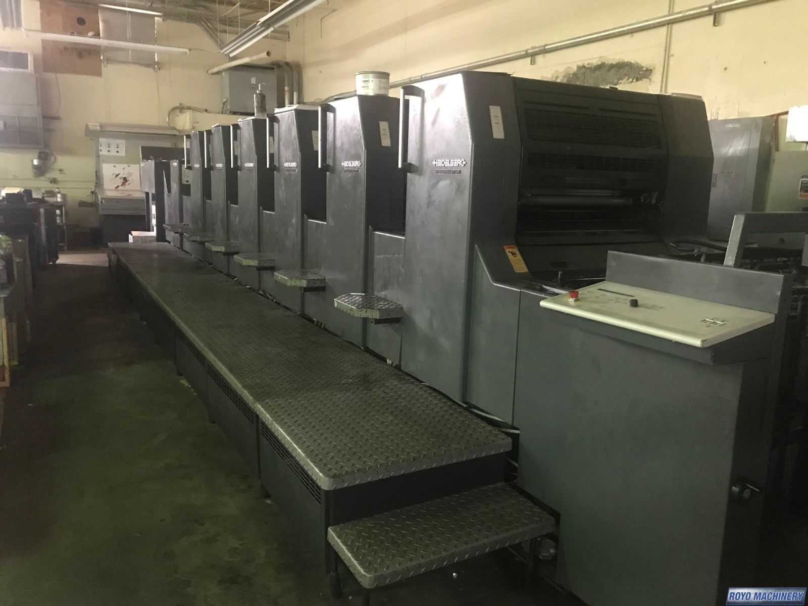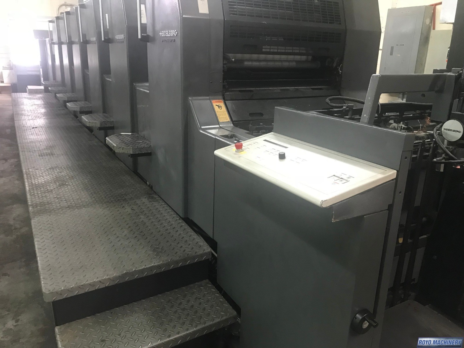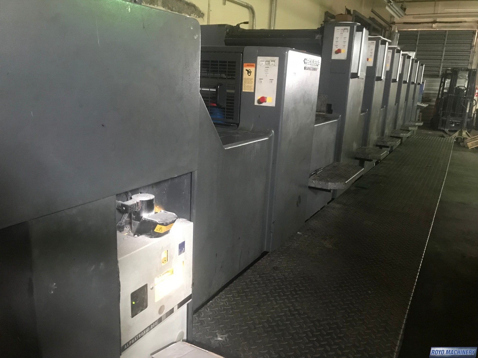 Preset Feeder, Ultrasonic double sheet detector, Suction Tape on Feeder, Steel plate in delivery, Stream Feeder, Sheet Decurler, Preset, In-line coater, Electronic sidelay control, High pile delivery, Grafix IR Dryer, Diagonal Register, Grafix Alphatronic 200 powder spray, Ink temperature control, Technotrans Combistar, Bacher pin register on clamps, Autoplate, Automatic Blanket Roller and Impression Cylinder Wash, Alcolor Dampening, 15000 sph, Superblues, C Format: 53 x 74 cm, CP2000
