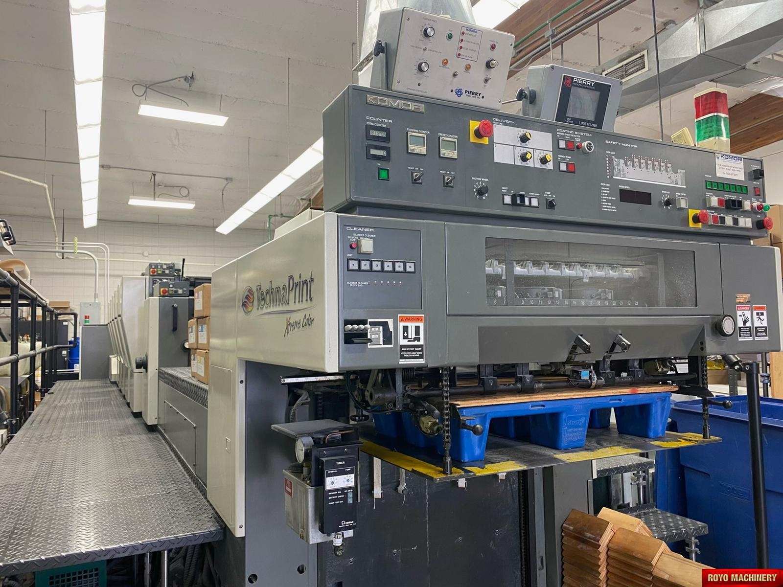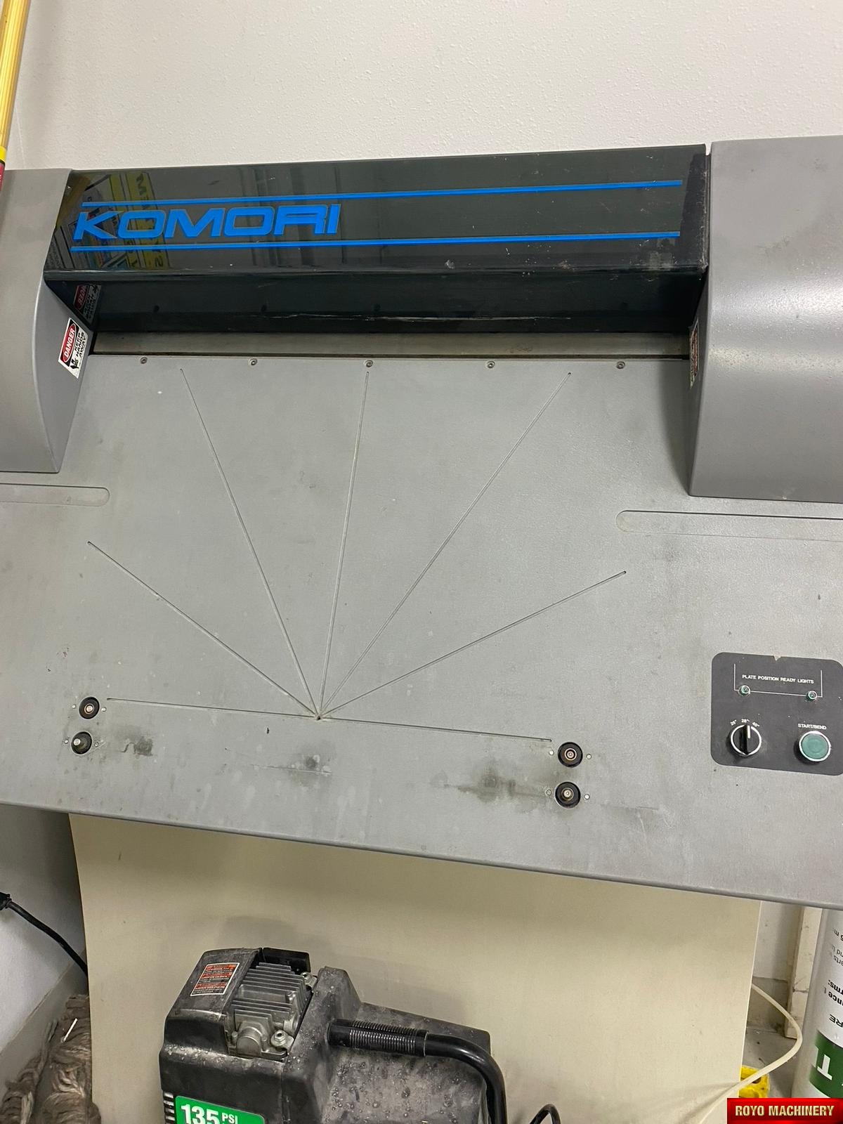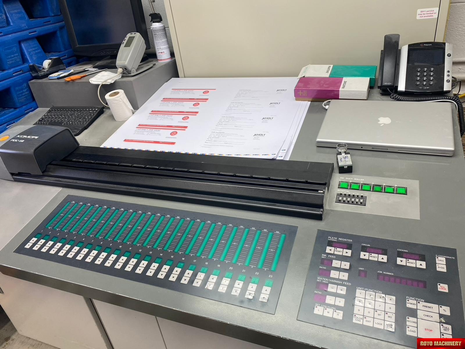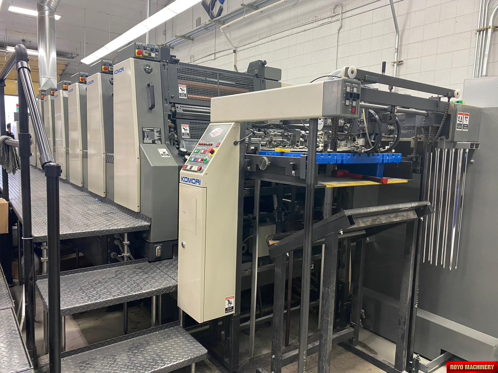 Powder Spray, Electronic sidelay control, Chrome impression cylinder, Electronic double sheet detector, PDC-S Autotracking Spectrophotometer Intrument, Spray Powder, Steel plate in delivery, Pre-loader, Steel plate in feeder, PQC console, Royse Refrigerated Recirculator, Stream Feeder, Non-stop delivery, Komorimatics, Ink temperature control, In line coater, SAPC (Semi-automatic Plate Change), Extended delivery, High pile delivery, Sheet Decurler, Automatic Blanket and Roller Washer, Pierry IR Dryer, Non-stop feeder, Komori Monitoring System IV