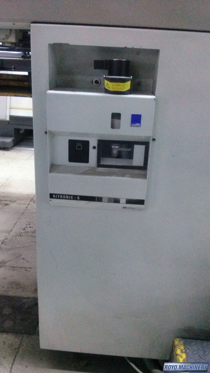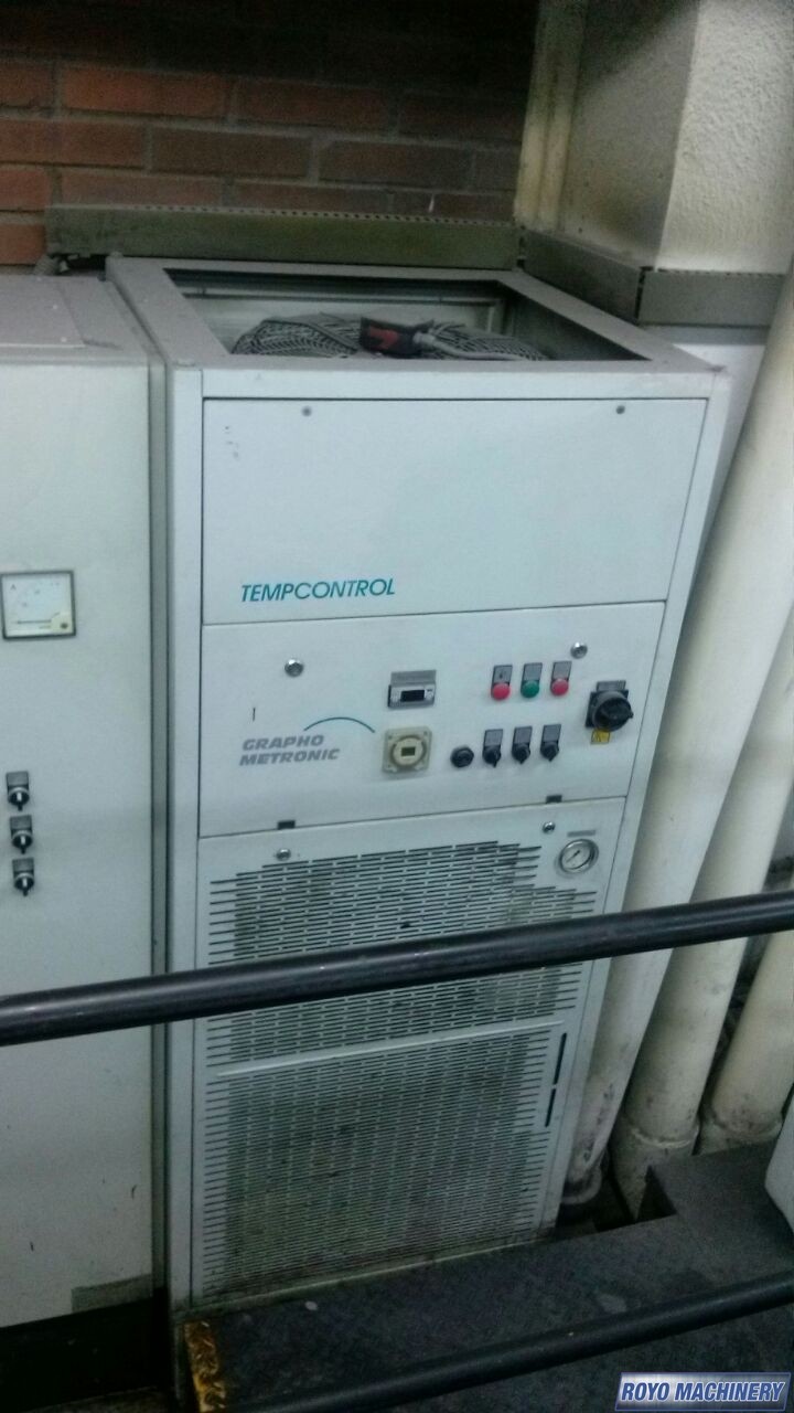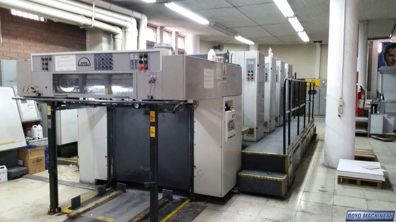 Vacuum feed board, Stream feeder, Rolandmatic, Pecom, Mabeg feeder, Lateral and circumferential register control, Non-stop feeder, High pile delivery, Grafix powder spray, Double sheet detector, Diagonal Register, Auto ink roller wash, Auto blanket wash, APL (Automatic Plate Loader), Steel plate in feeder & delivery, 15000 sph, Non-stop delivery, Sheet decurler, RCI 2 console with touch screen monitor, RCI (Remote Controlled Inking), Pneumatic sidelay, Pin register on clamps, CPL (Semi-auto plate loading), Air drums, Technotrans Recirculator Refrigerator
