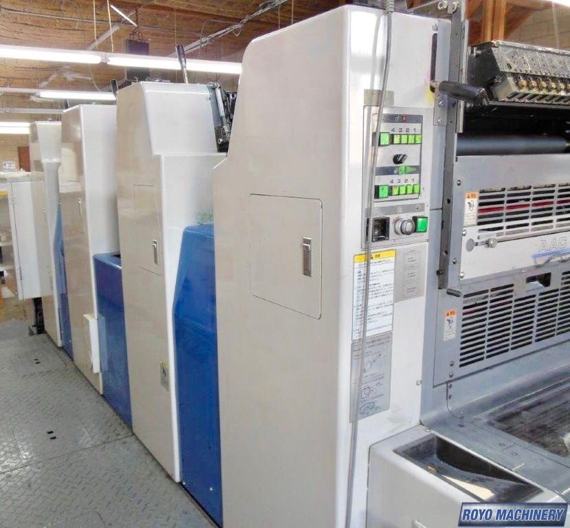 Pin Register on Clamps, Ryobimatic continuous dampening system, Stream feeder, Refrigerated Recirculator, Low pile delivery, Double sheet detector, Lateral and circumferential register control, Chain delivery, 13000 sph, Powder Spray, Autoplate (semiautomatic plate changer), PCS-G Printing Control system, PCS Color Console